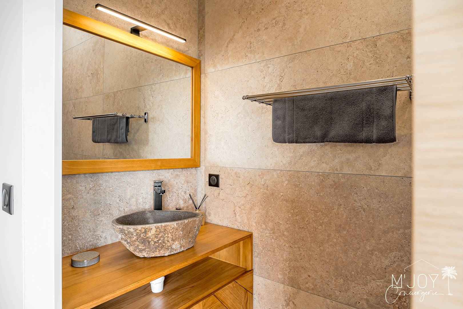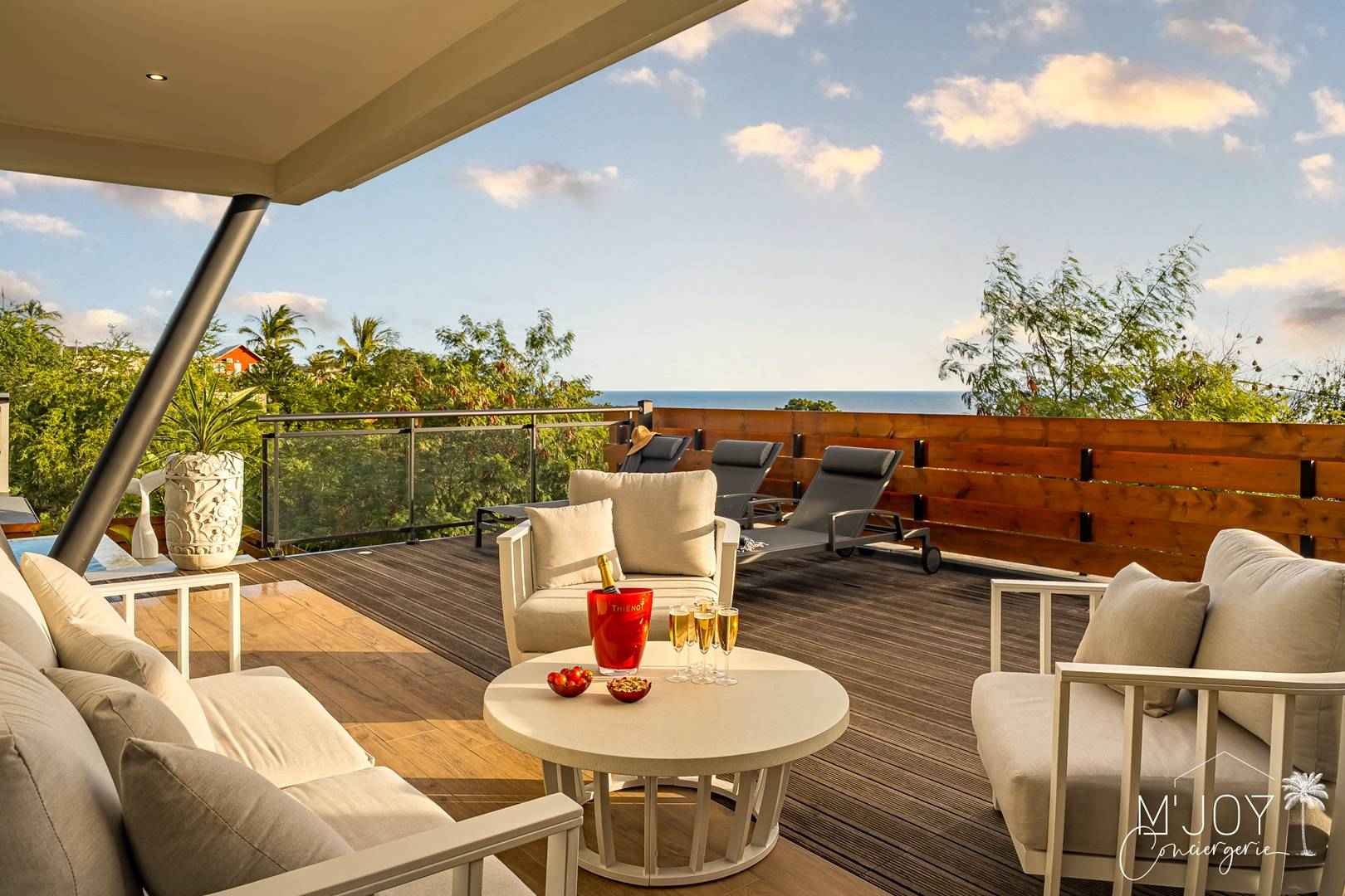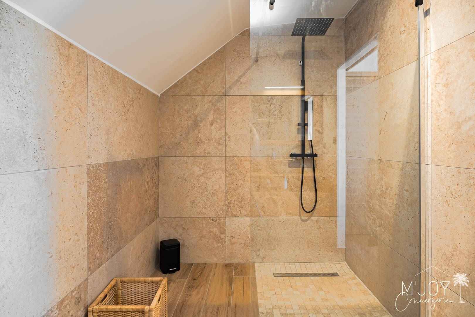 Les extérieurs se prolongent avec la terrasse mi ombragée, mi ensoleillée, ses 5 transats ainsi que son salon cosy. Une douche chauffée permet de vous rincer en rentrant de la plage, ou tout simplement pour le plaisir de se doucher sous les étoiles.