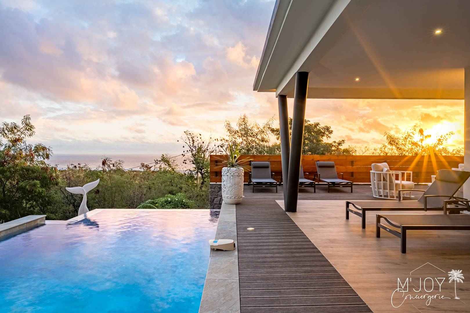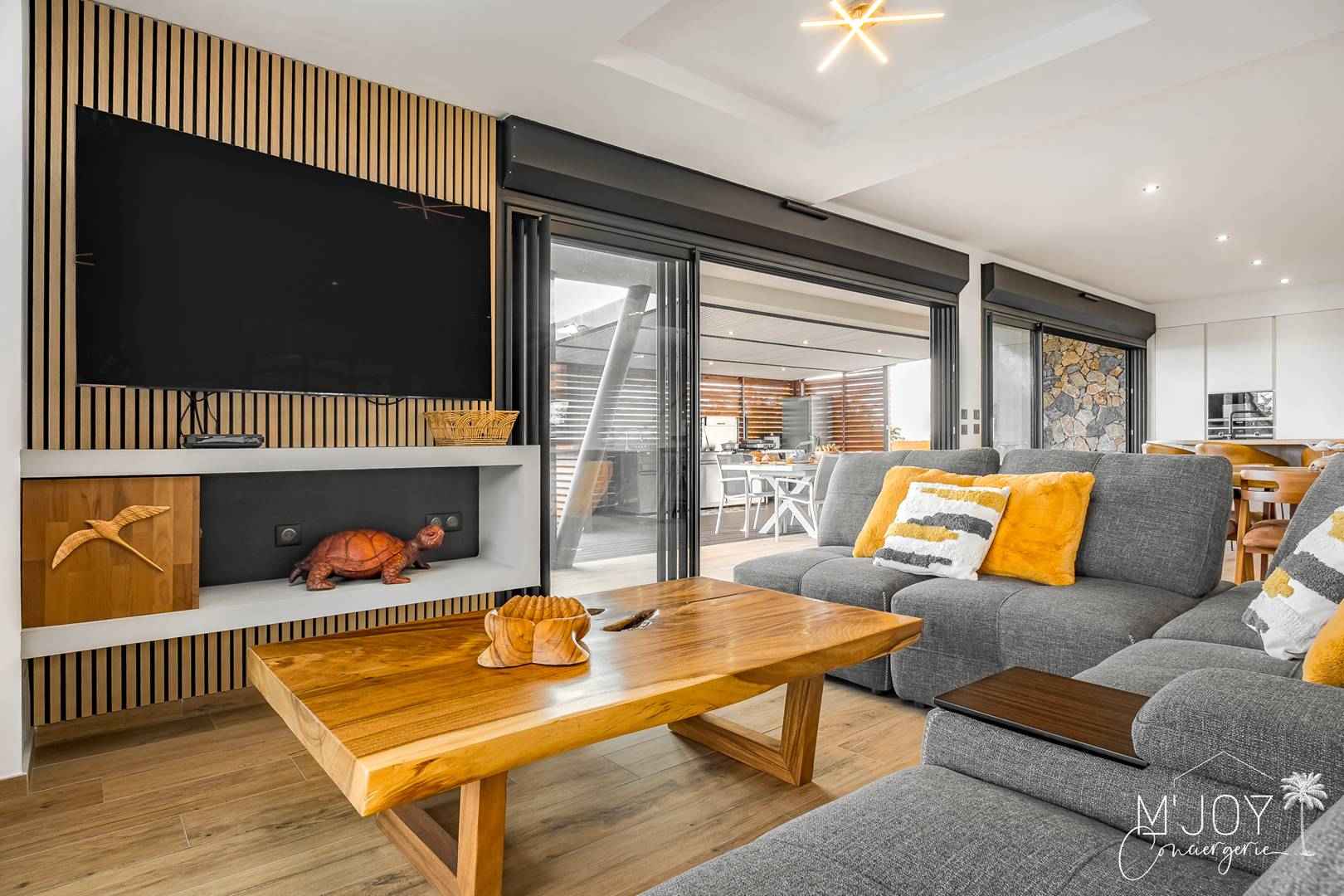 La majestueuse porte d’entrée dessert sur la gauche un WC, puis une buanderie toute équipée, et enfin une immense pièce de vie toute ouverte sur la terrasse et la piscine, où la vue sur la végétation et l’océan domine.