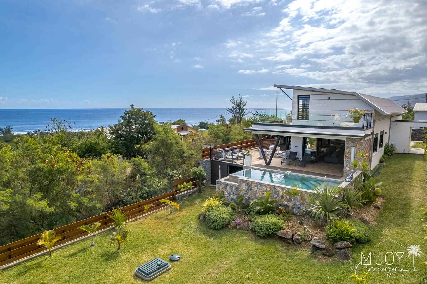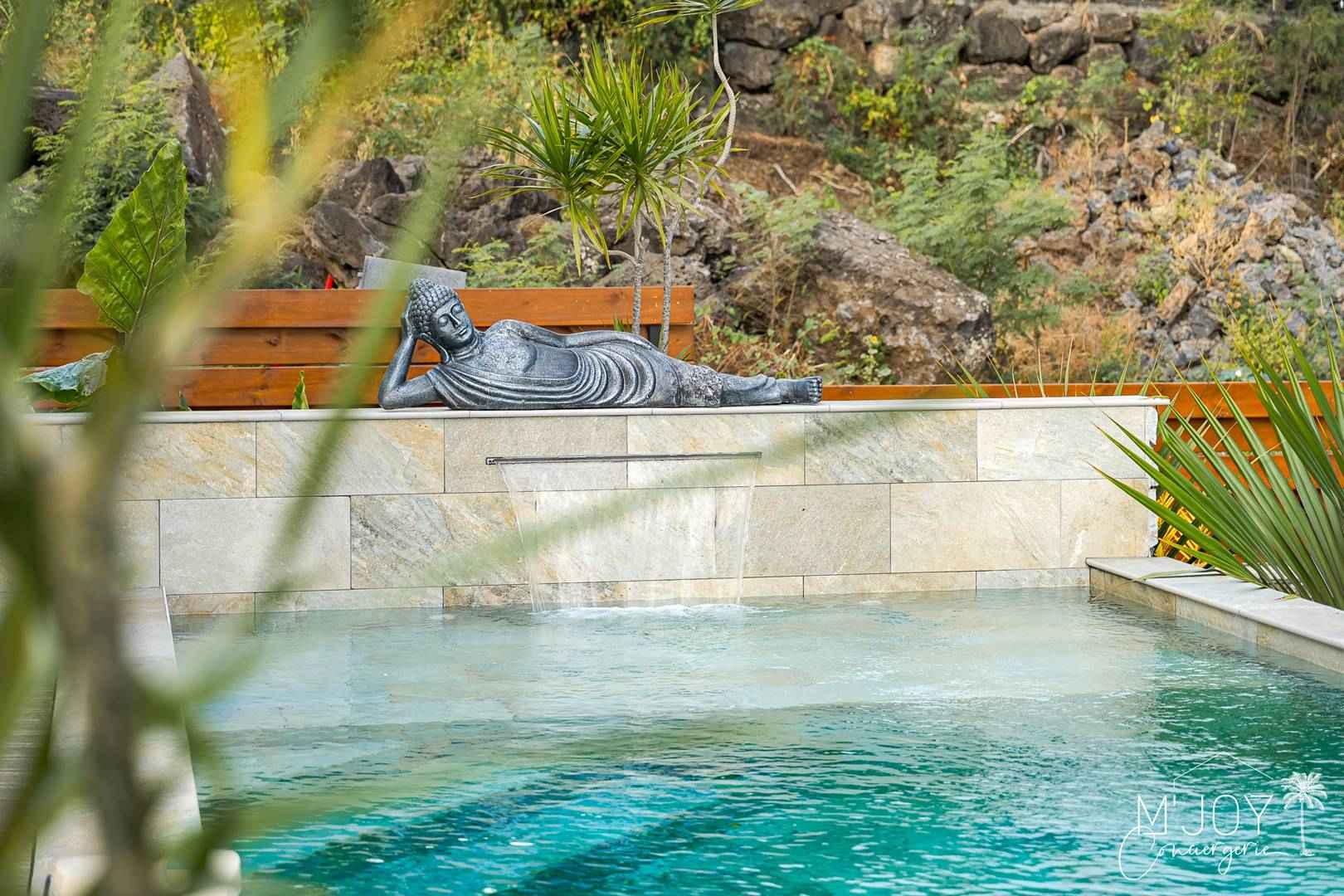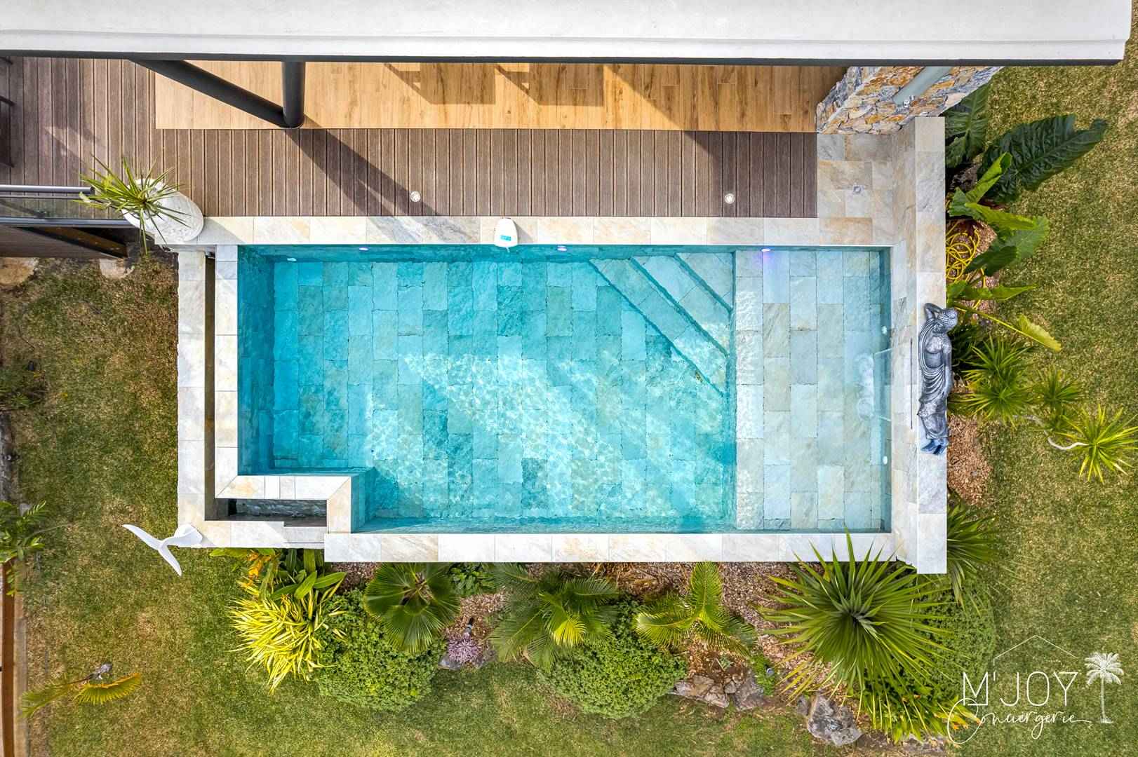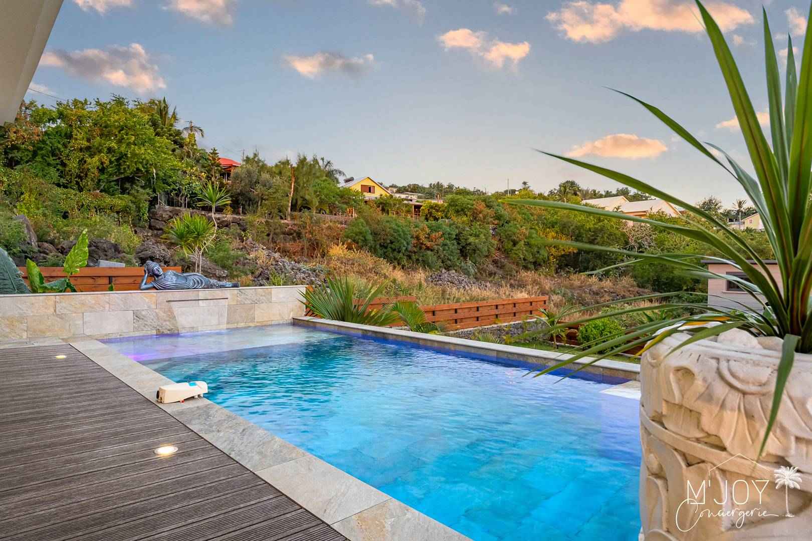 Enfin, la piscine en pierres et son doux son de cascade invitent à l’évasion. La partie à débordement donne l’illusion d’infini vers l’océan. Sécurisée par une alarme, elle est aussi chauffée pendant l’hiver austral de mai à octobre.
