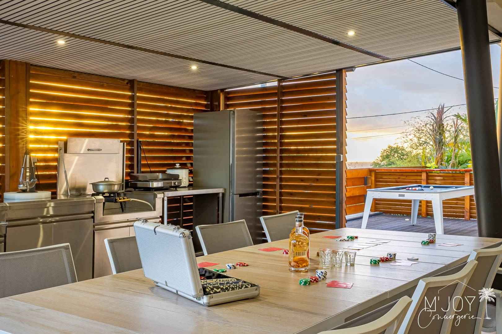 Poussez ensuite les baies vitrées et découvrez la varangue et sa grande cuisine extérieure pour une ambiance estivale toute l’année : table pour 10 personnes, évier en inox, plancha électrique, trépied, et frigo supplémentaire. Sans oublier, le billard en extérieur, face à l’océan. Multifonction, ce billard peut aussi se transformer en véritable table de ping-pong.