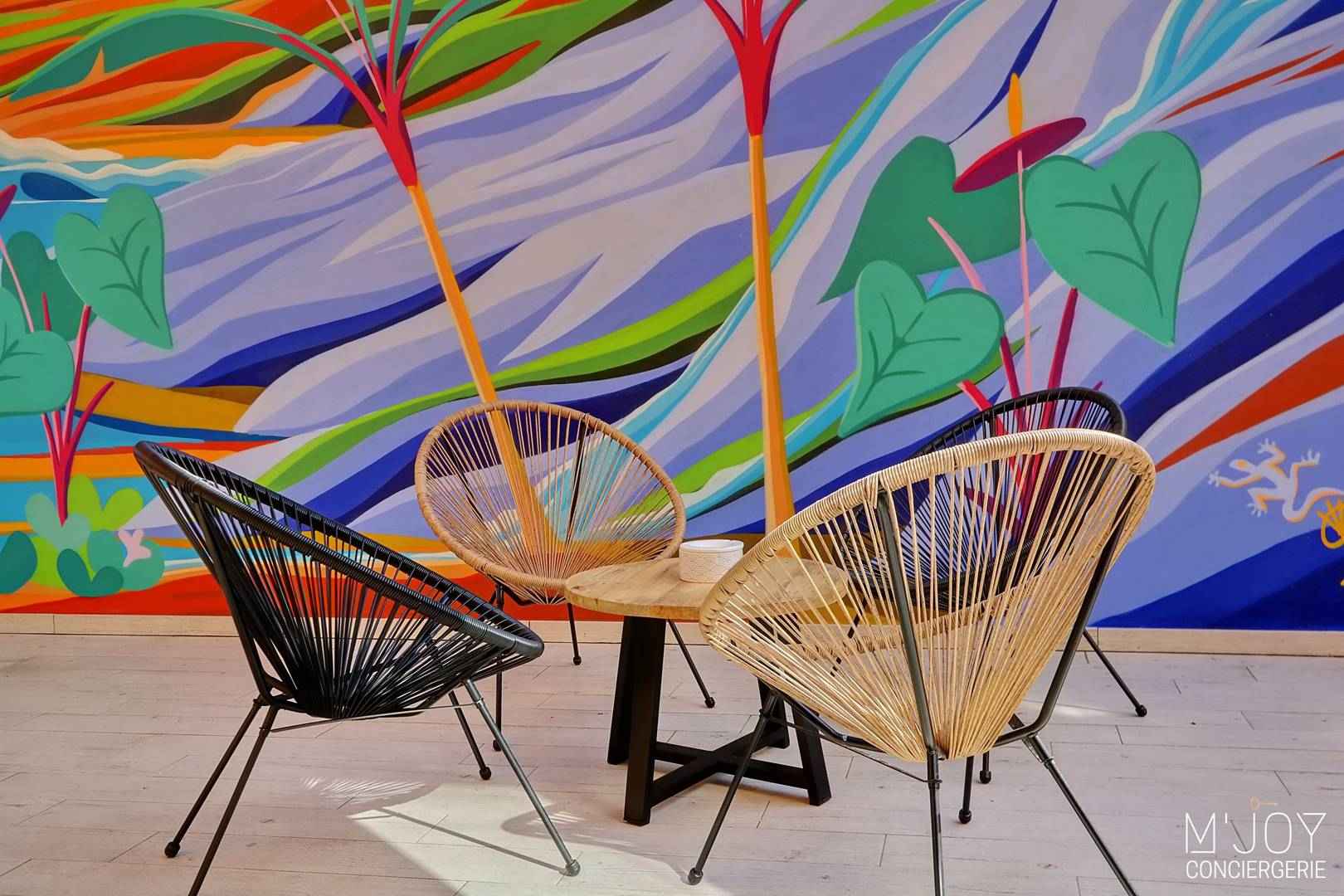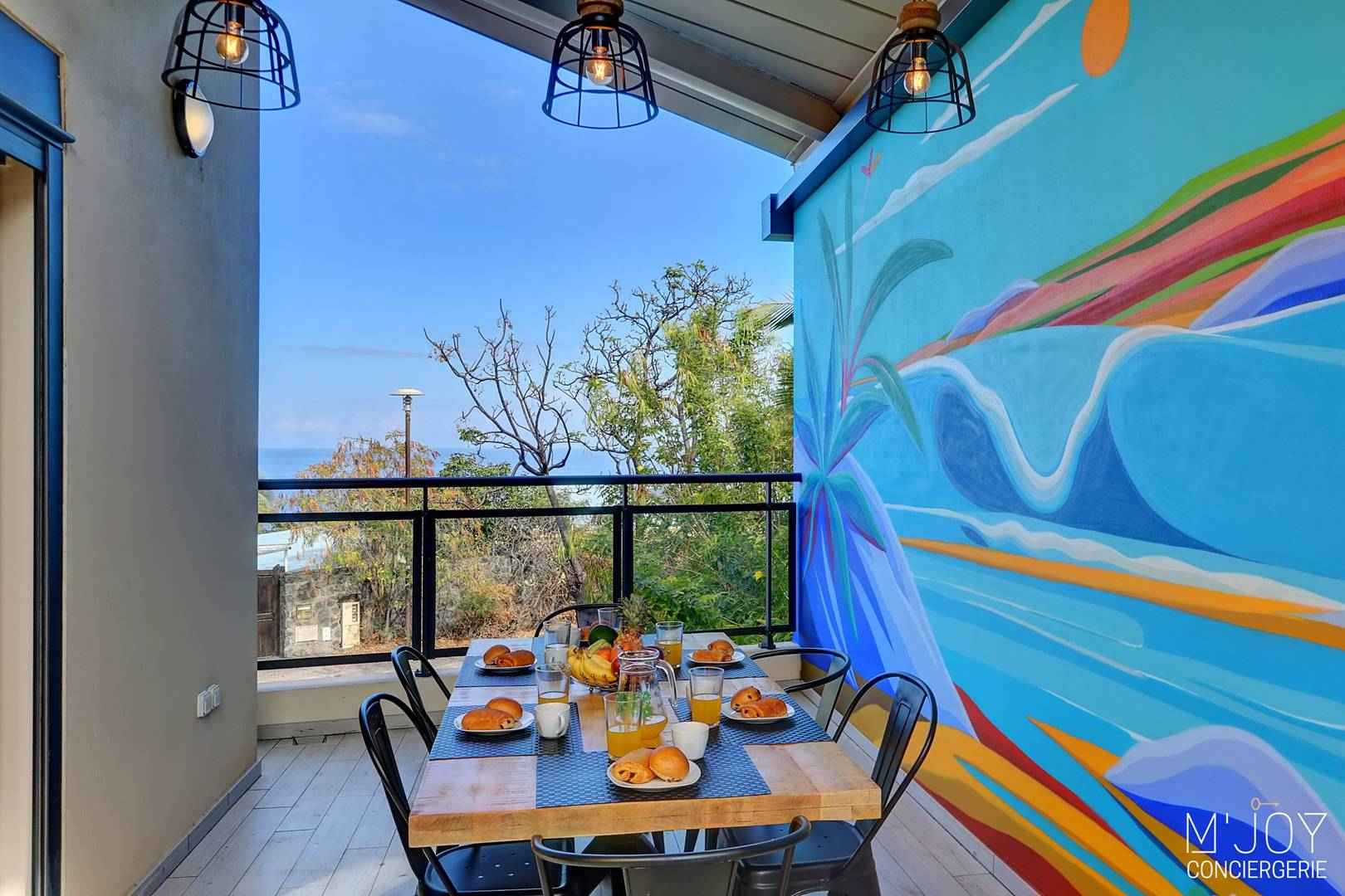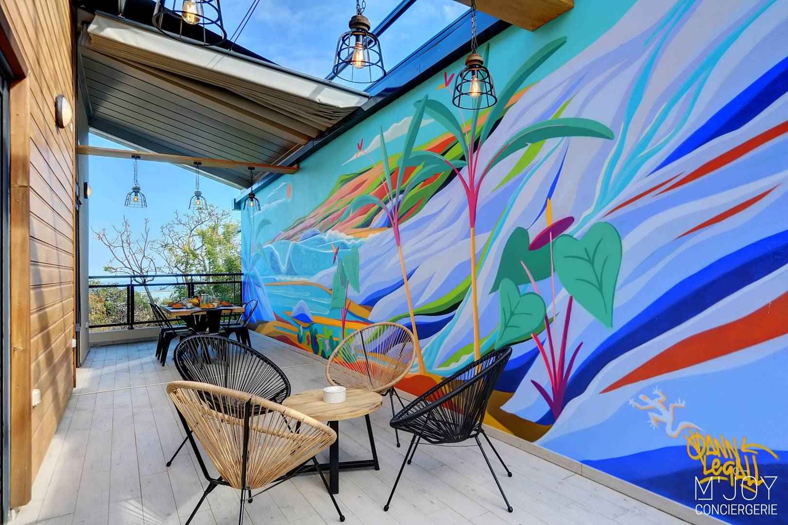 - Une varangue avec grande table à manger et petit salon d’extérieur avec voile d’ombrage rétractable pour se protéger du soleil et/ou de la pluie, décorée par le célèbre artiste local Yann Le Gall.