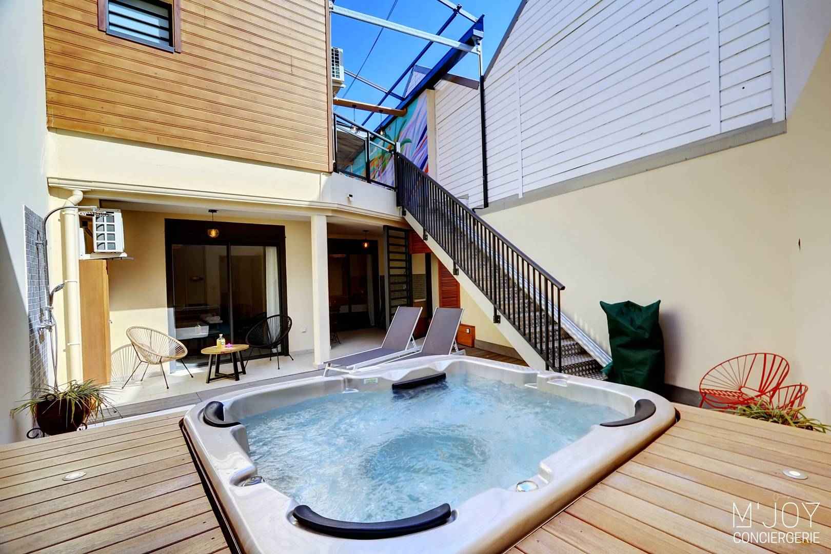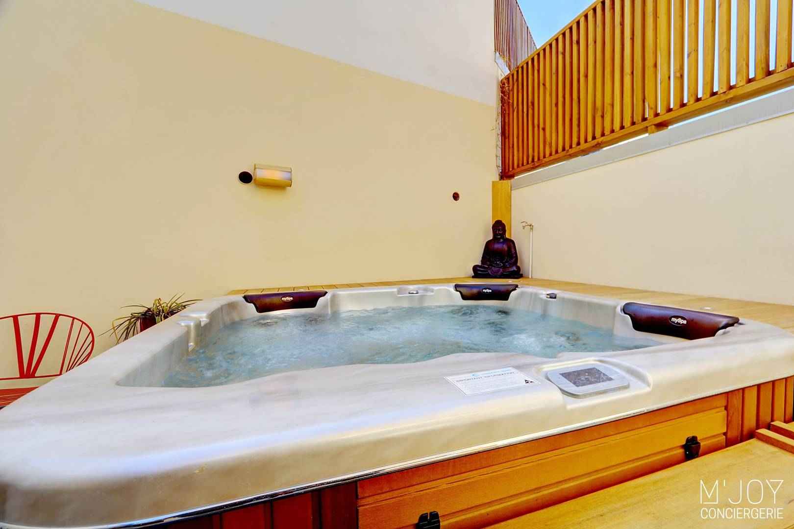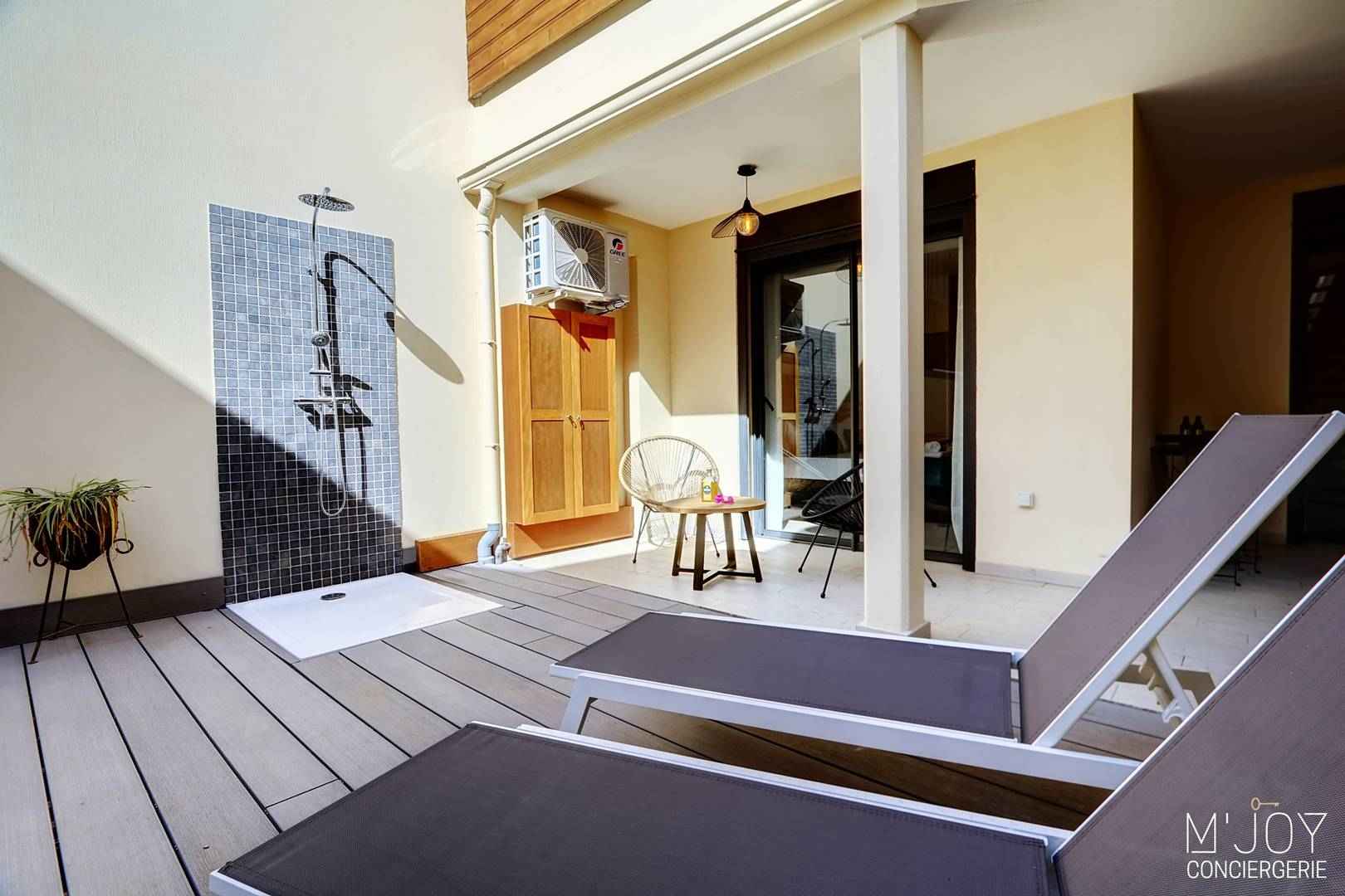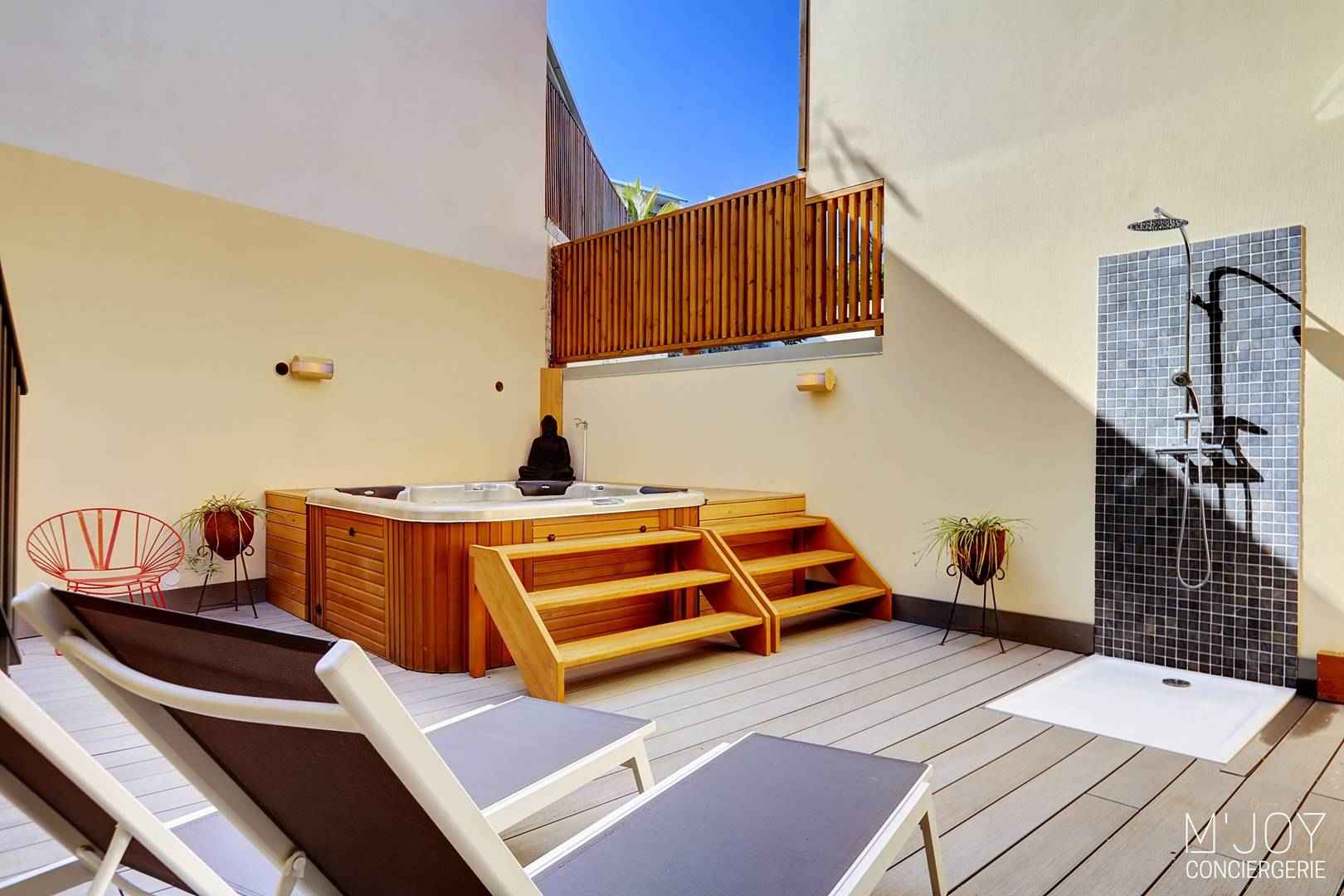 - Une grande terrasse avec jacuzzi, transats, douche extérieure et cuisine extérieure