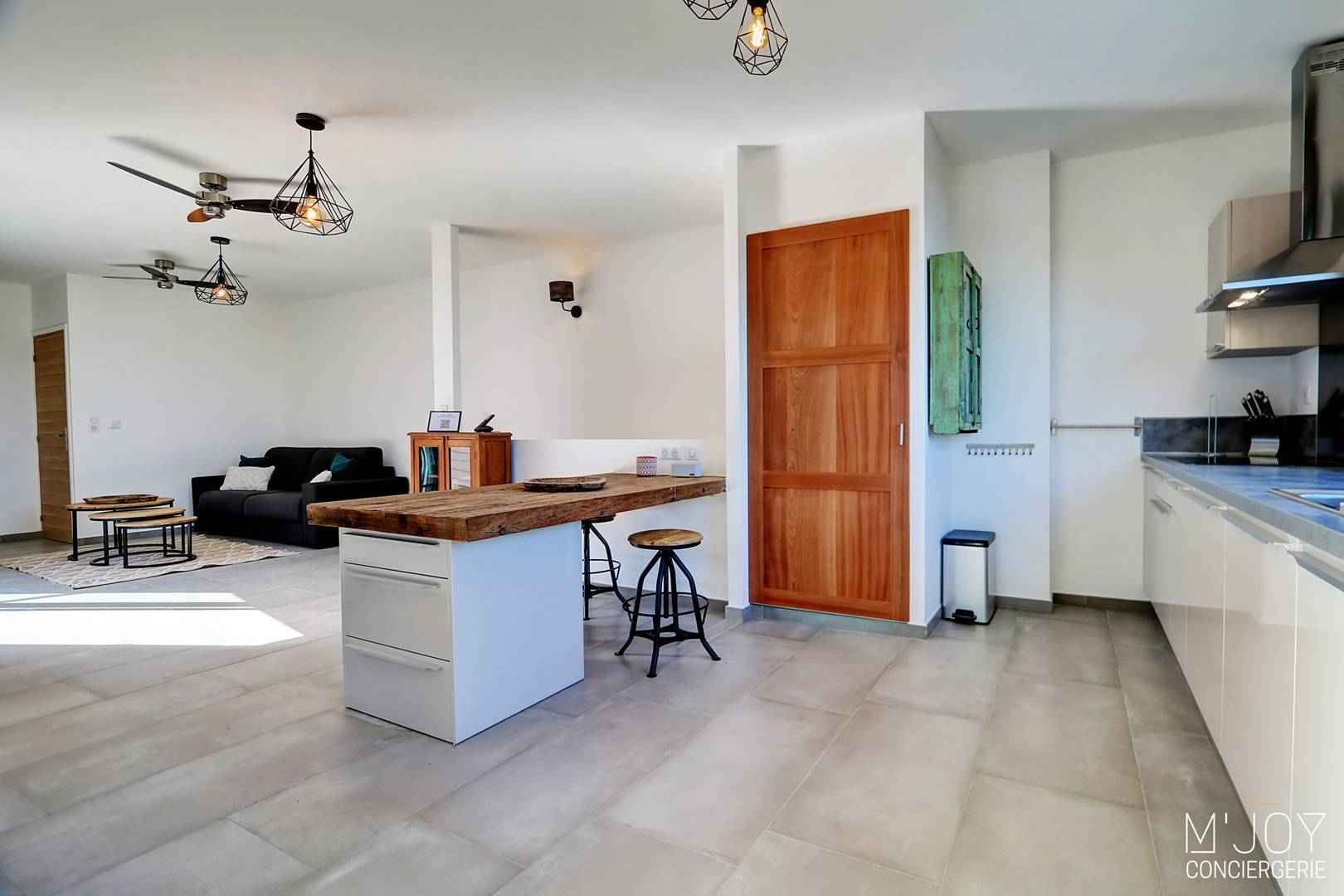 - Une cuisine ouverte, entièrement équipée avec vue mer