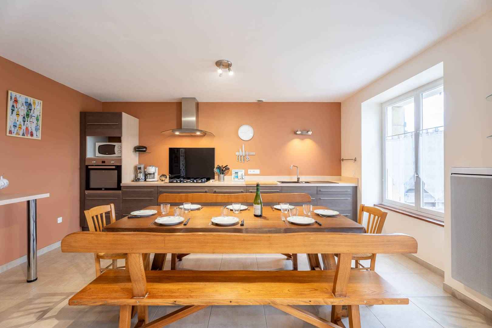 moderne toute équipée (four, plaques de cuisson à gaz 5 feux, micro-ondes, réfrigérateur / congélateur, lave-vaisselle)