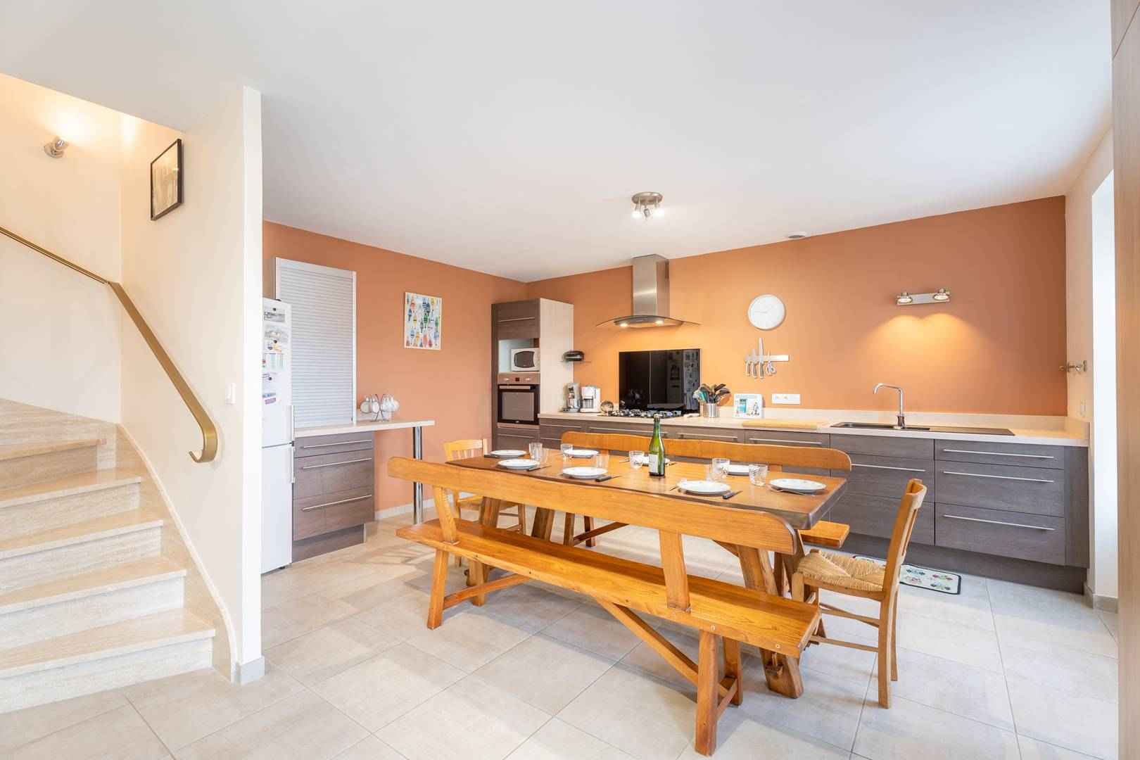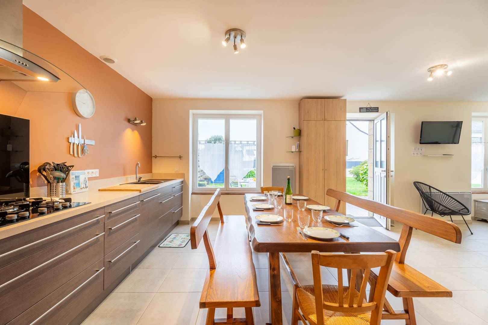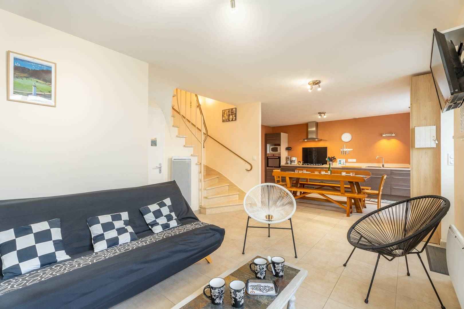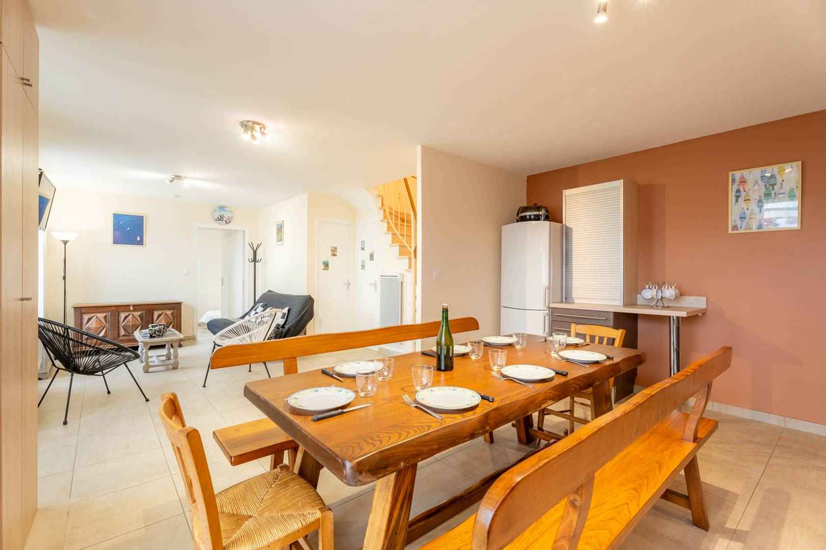 - entrée directe depuis terrasse sur grande pièce de vie : séjour / salon (canapé, tv) et salle à manger (grande table familiale)