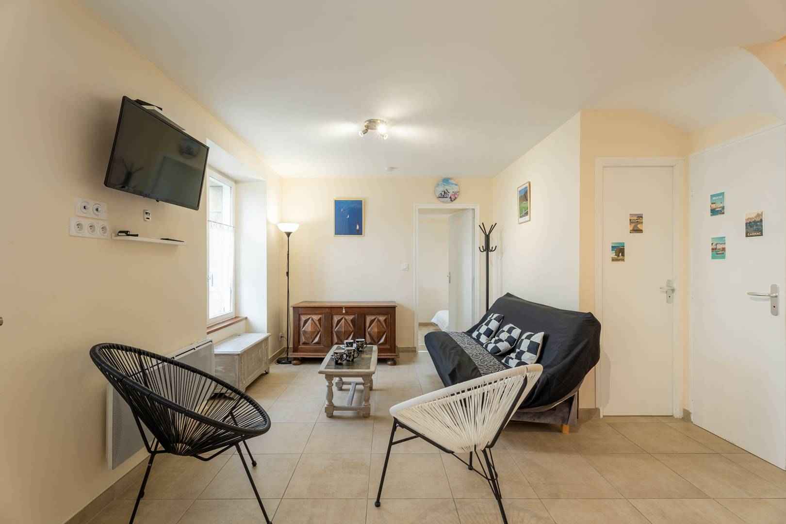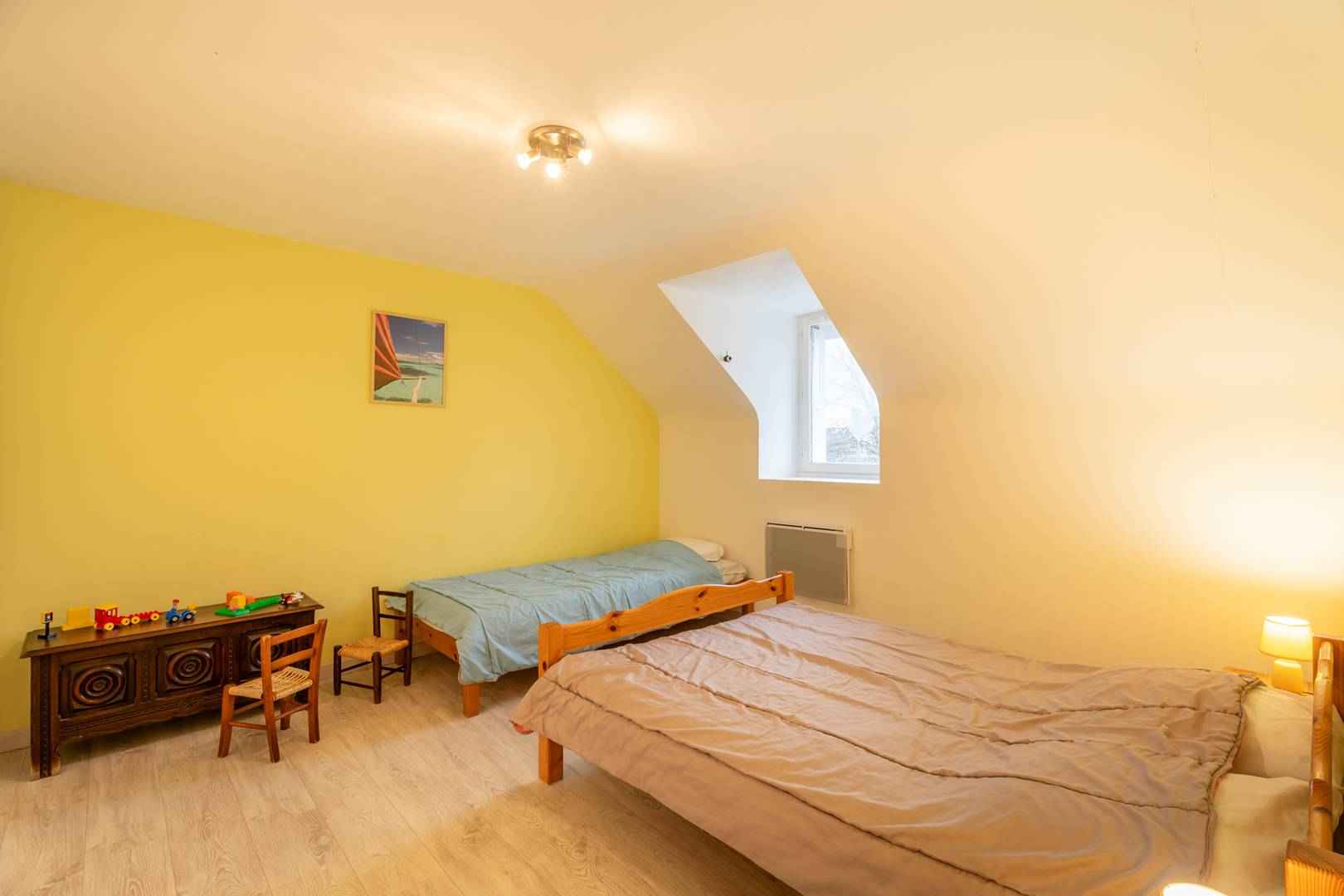 - 1 chambre avec 1 lit double (140, couette), et un lit simple (90, couette), grand placard de rangement et matériel de puériculture à disposition (lit bébé, chaise haute, table à langer)