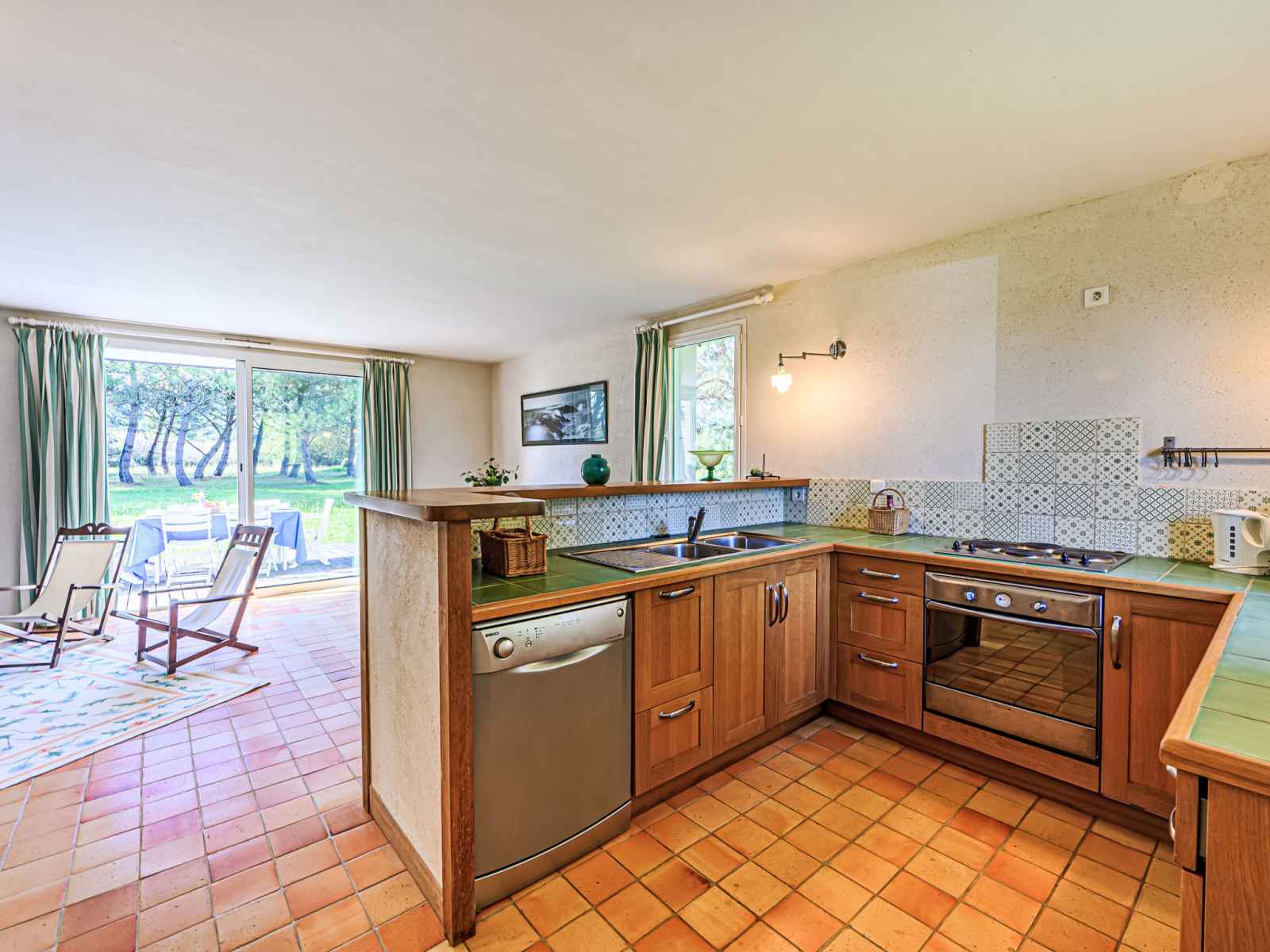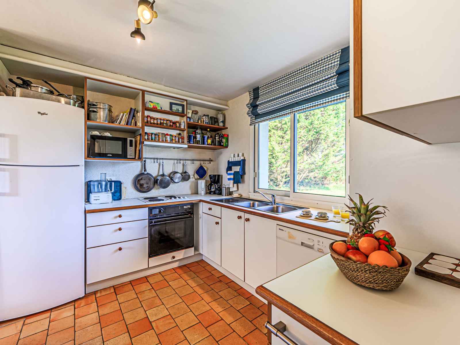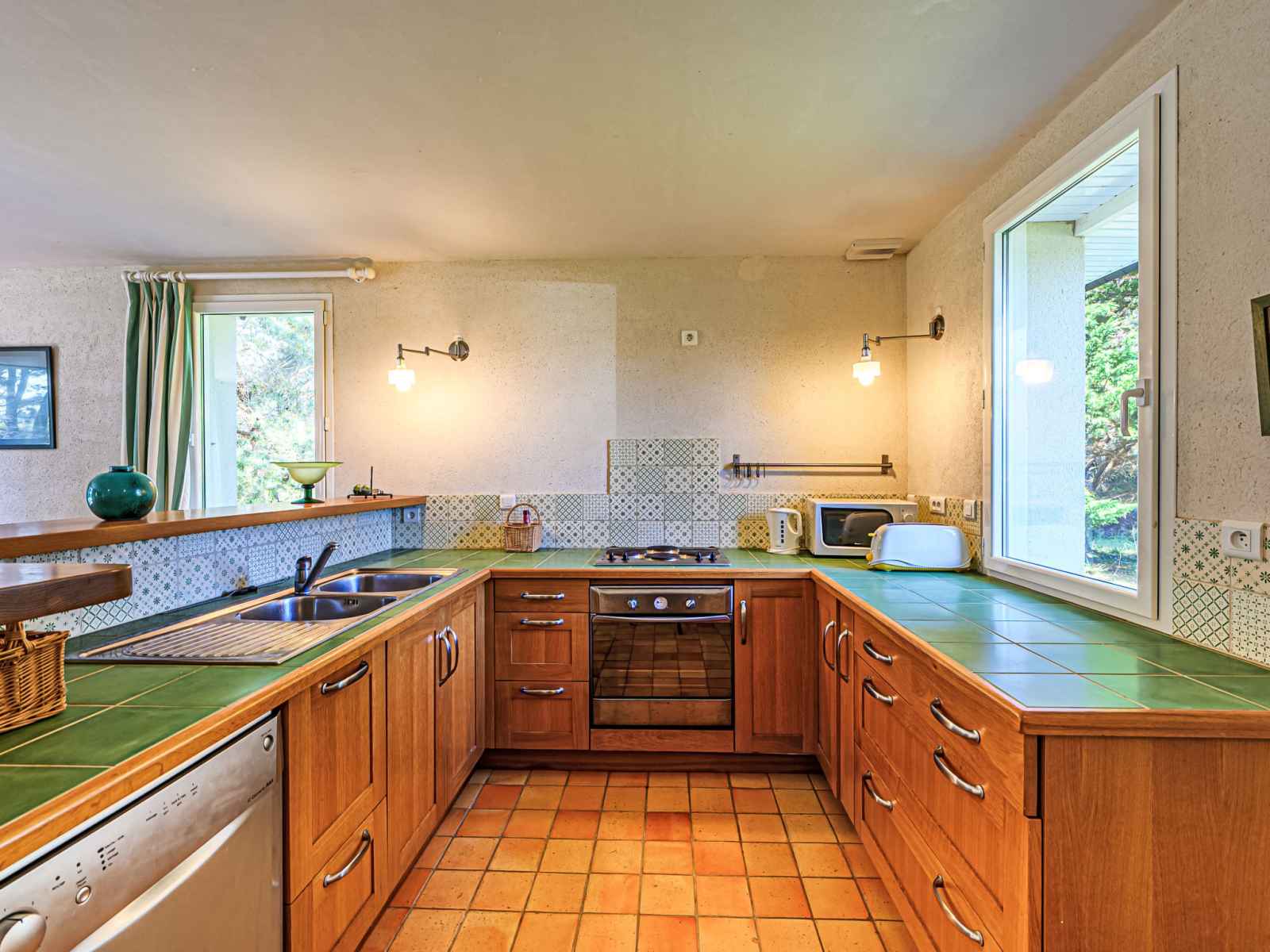 Villa 7 pièces 200 m2. aménagement confortable: séjour/salle à manger avec cheminée et tv (écran plat). sortie sur la terrasse. cuisine ouverte (four, lave-vaisselle, 4 plaques vitrocéramiques, grille-pain, bouilloire électrique, cafetière électrique). wc séparé. À l'étage supérieur: 1 chambre avec 1 grand-lit (1 x 160 cm, longueur