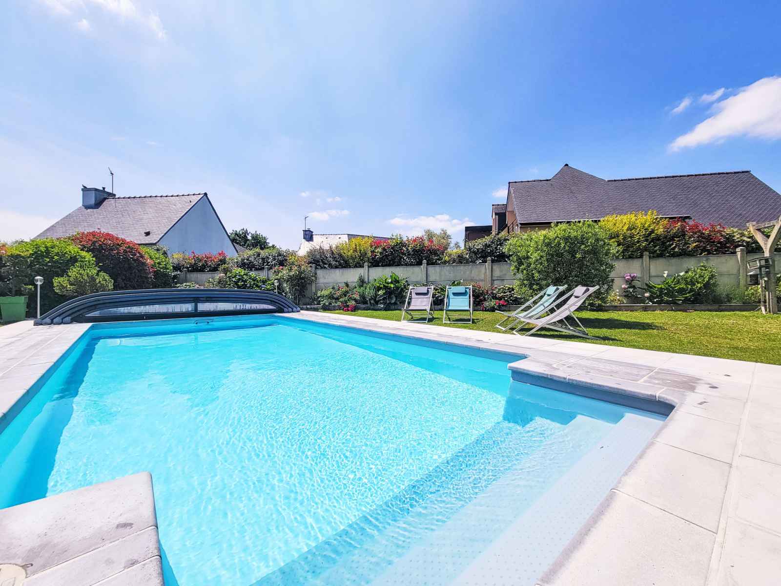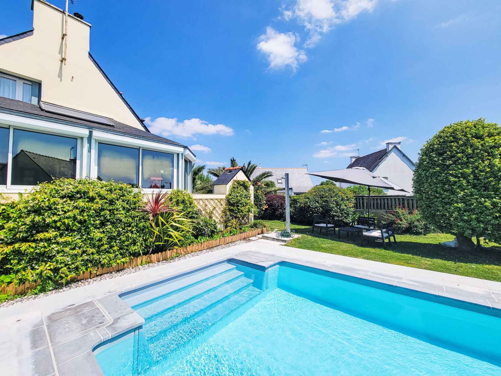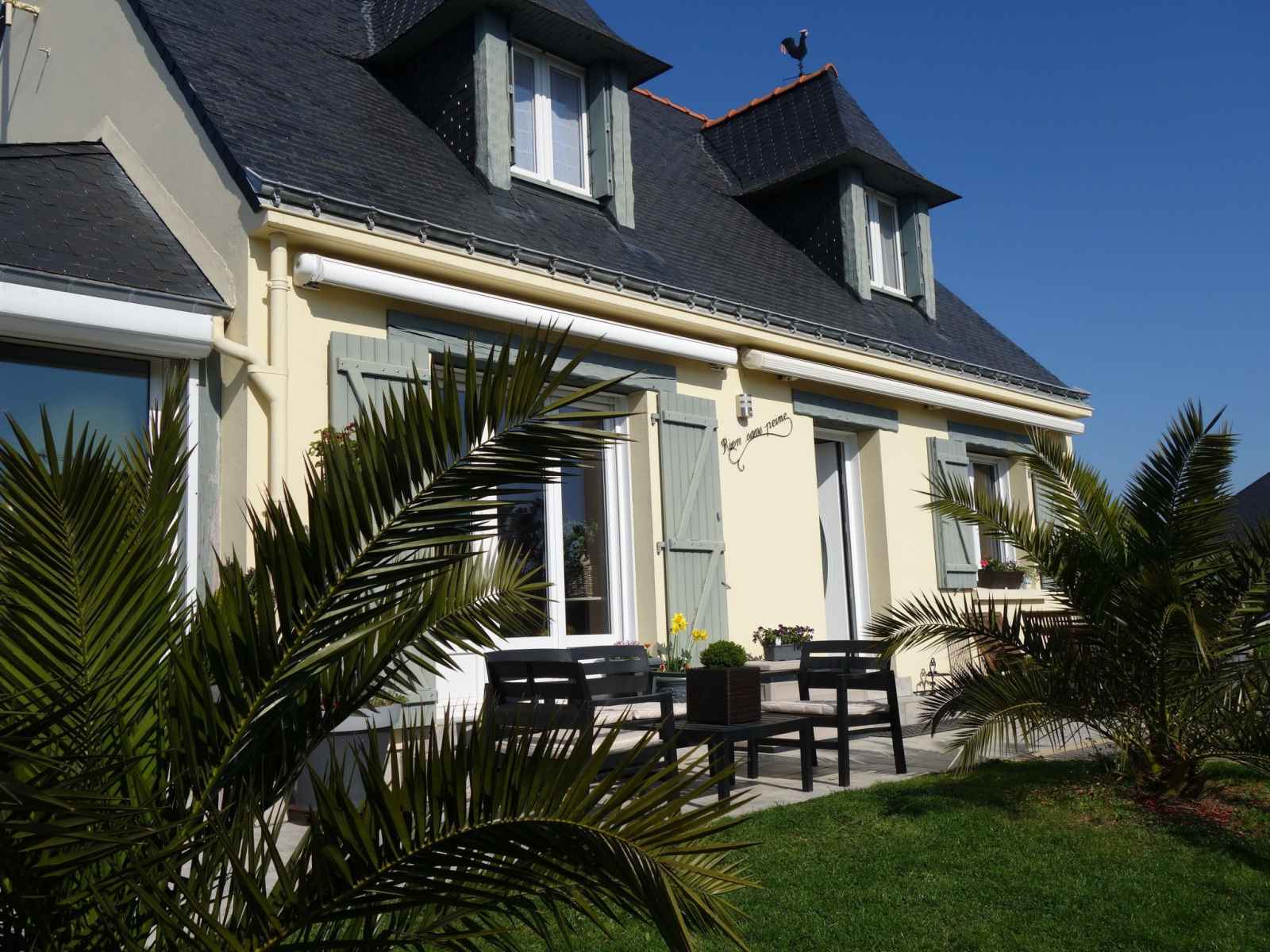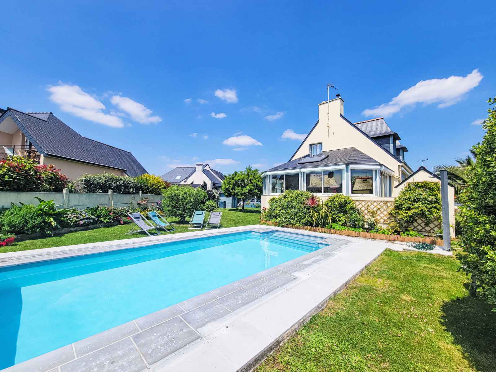 Saint philibert à 8 km de carnac: grande maison individuelle "phil'blue". au centre de saint philibert, à 400 m de la mer, à 1 km de la plage. a usage privé: jardin entretenu 1'000 m2 (clôturé), piscine couverte rectangulaire, chauffée, protégée (8 x 4 m, profondeur 140 - 160 cm, disponibilité saisonnière: 01.avr. - 19.sep.). douche