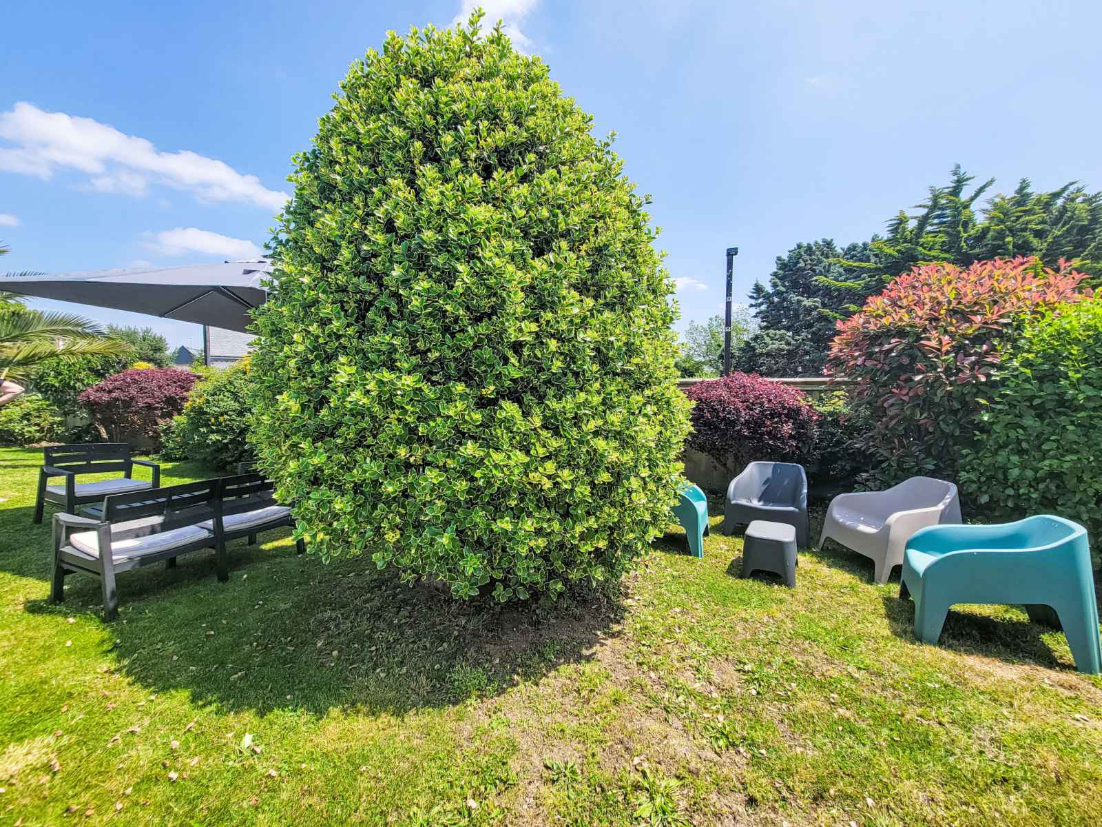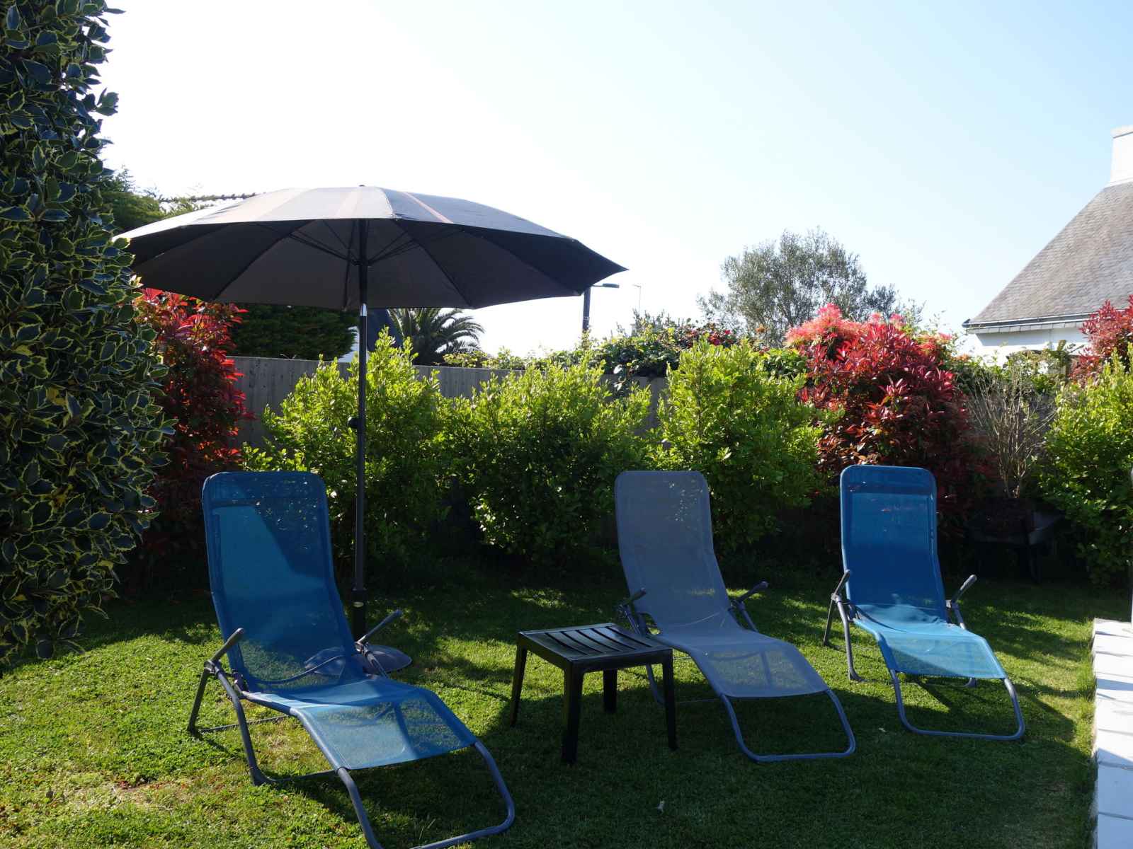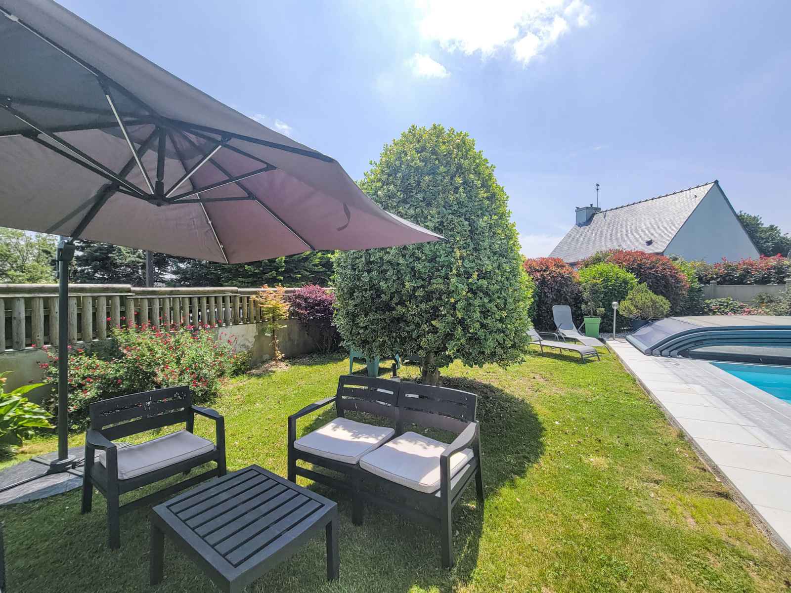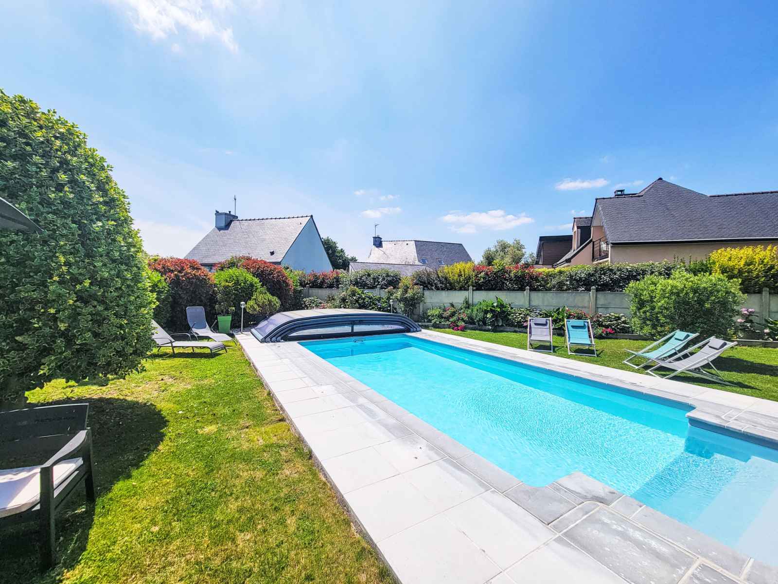 Saint philibert à 8 km de carnac: grande maison individuelle "phil'blue". au centre de saint philibert, à 400 m de la mer, à 1 km de la plage. a usage privé: jardin entretenu 1'000 m2 (clôturé), piscine couverte rectangulaire, chauffée, protégée (8 x 4 m, profondeur 140 - 160 cm, disponibilité saisonnière: 01.avr. - 19.sep.). douche
