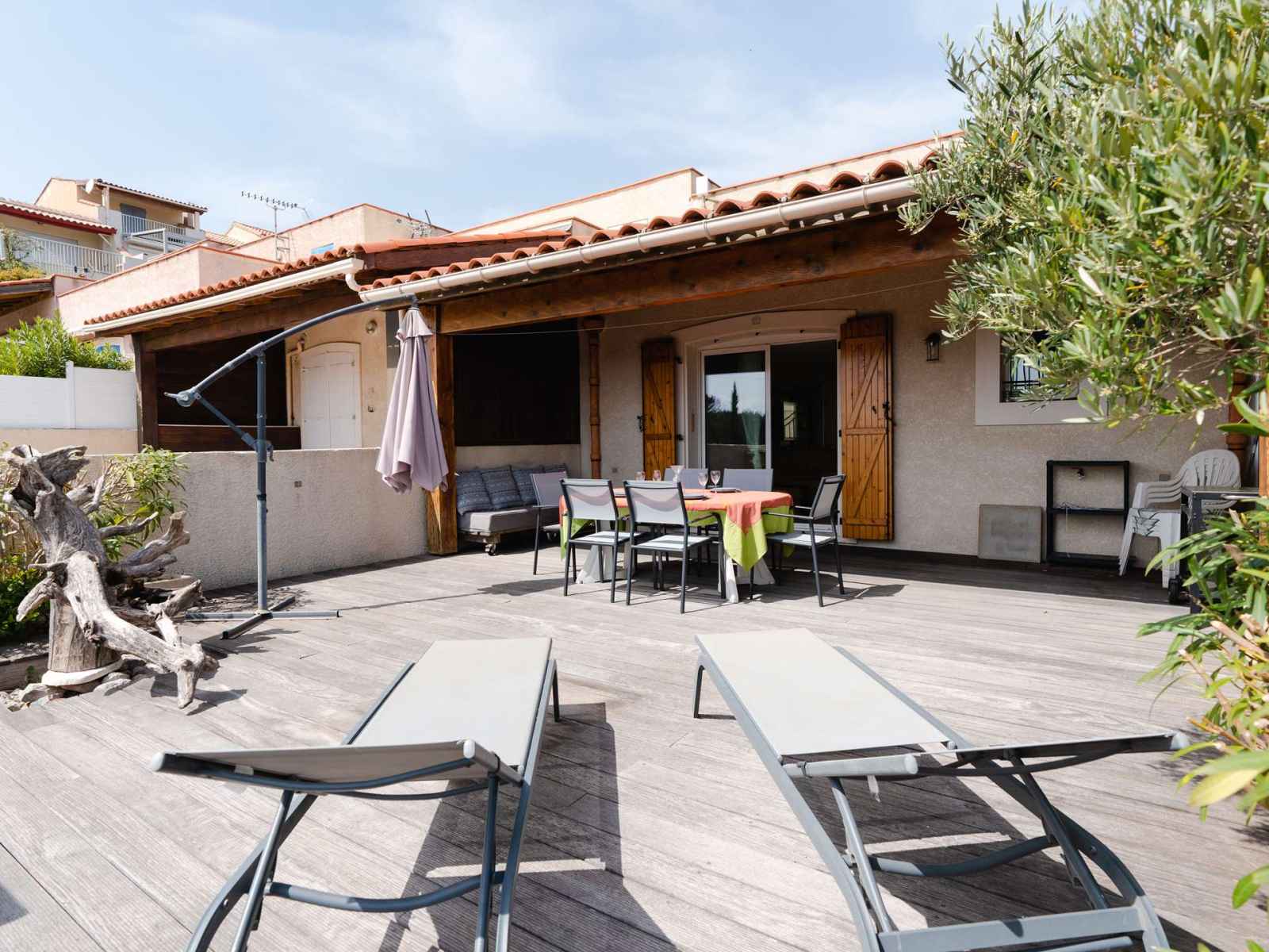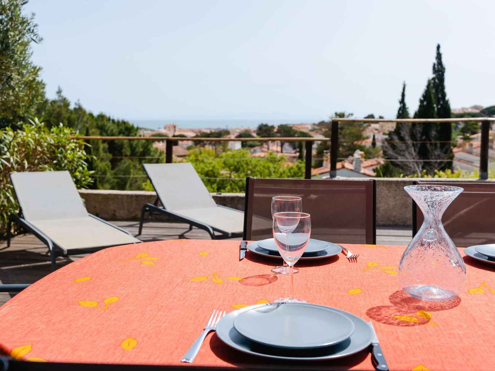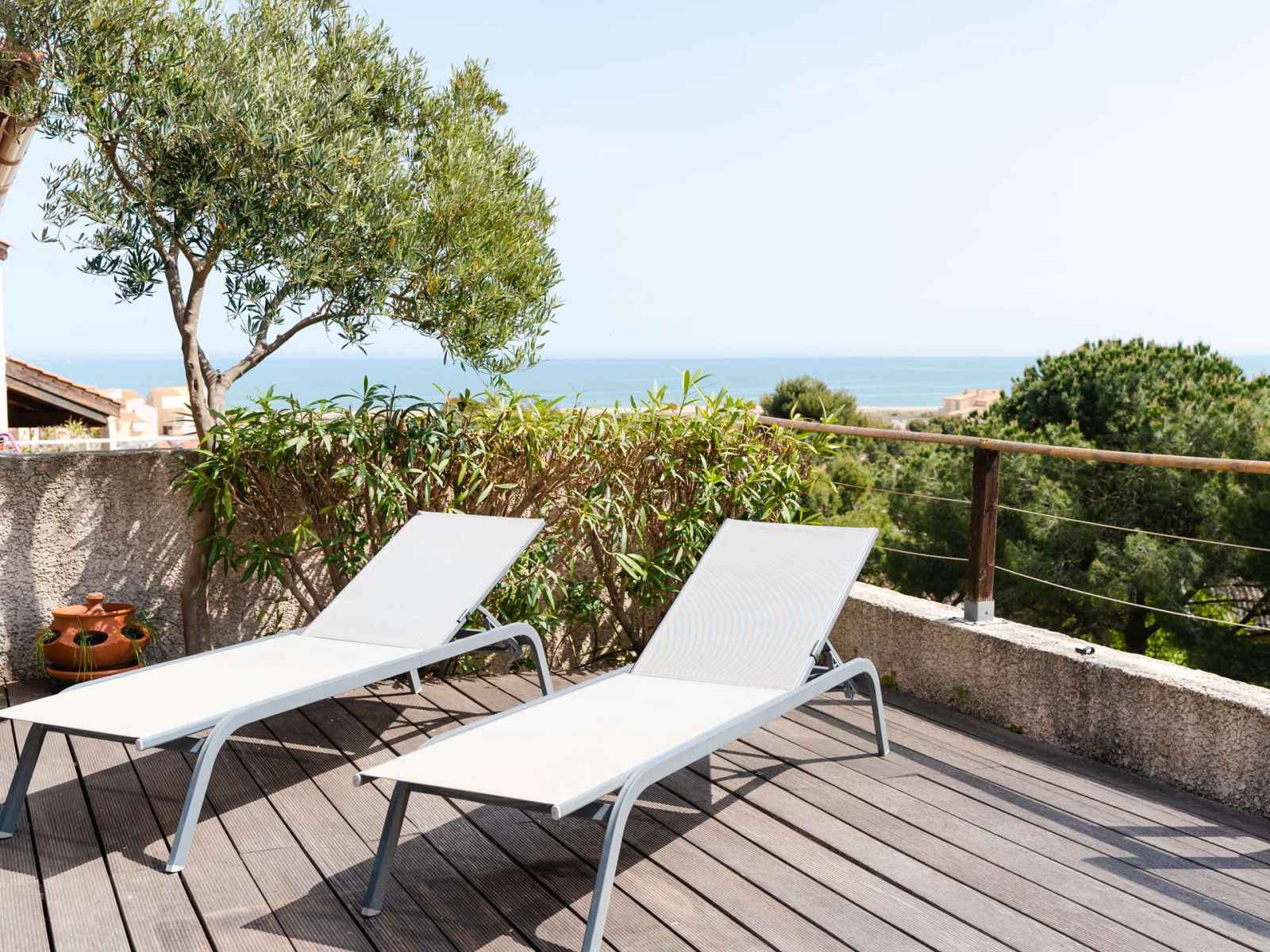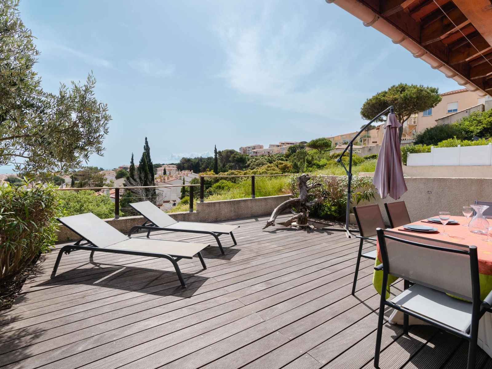 Une vaste terrasse avec vue mer, ombragée par une avancée de toit est accessible depuis le salon: elle est équipée d'une table pour 6 personnes, une banquette, 2 chaises longues.