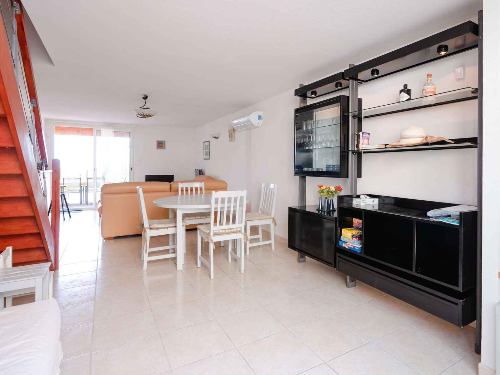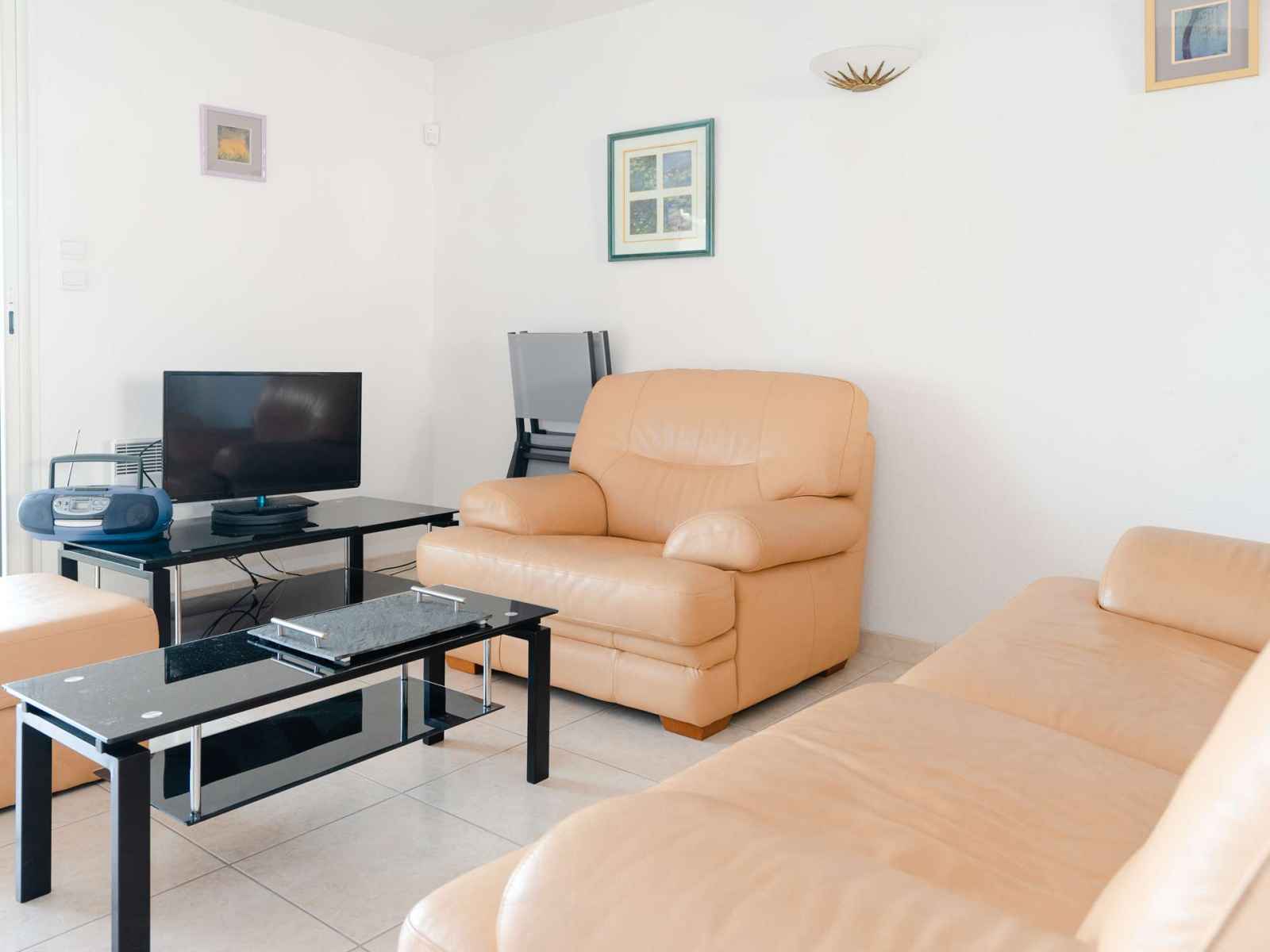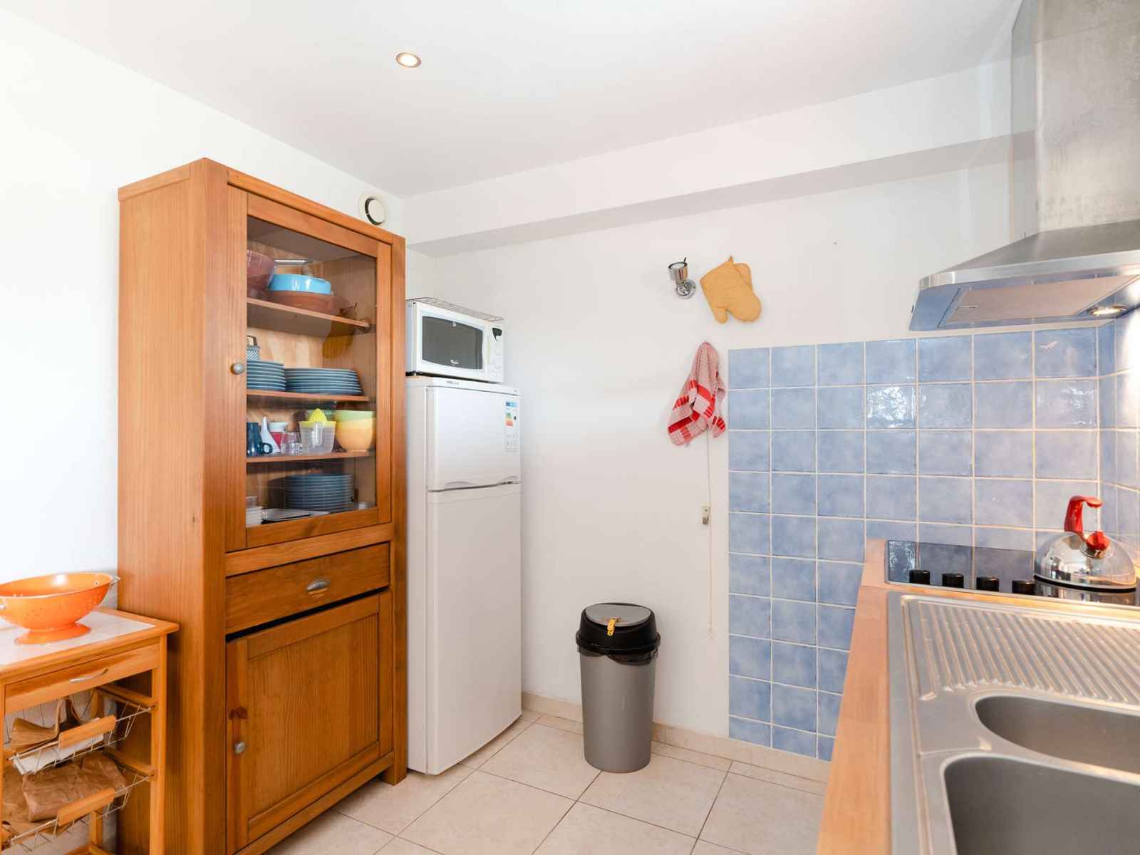 L'entrée donne tout d'abord sur un patio protégé du vent, idéal pour suspendre le linge ou déposer les affaires de plage. La pièce de vie ouverte sur le patio dispose d'un petit vestiaire, une table, un buffet et un espace salon avec canapé et fauteuil (TV avec chaines françaises, poste de radio), donnant sur une cuisine ouverte équipée (plaque de cuisson 4 feux vitro-céramique avec hotte aspirante, cafetière Senseo, grille-pain, bouilloire, grand réfrigérateur avec compartiment congélateur, four, micro-ondes, lave-vaisselle). Un petit cellier attenant à la cuisine abrite le lave-linge et des rangements.