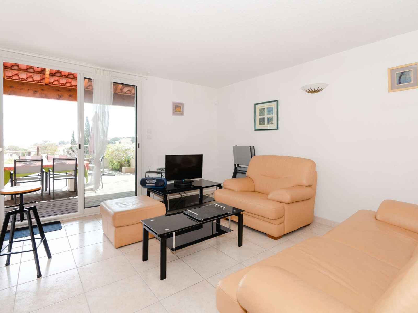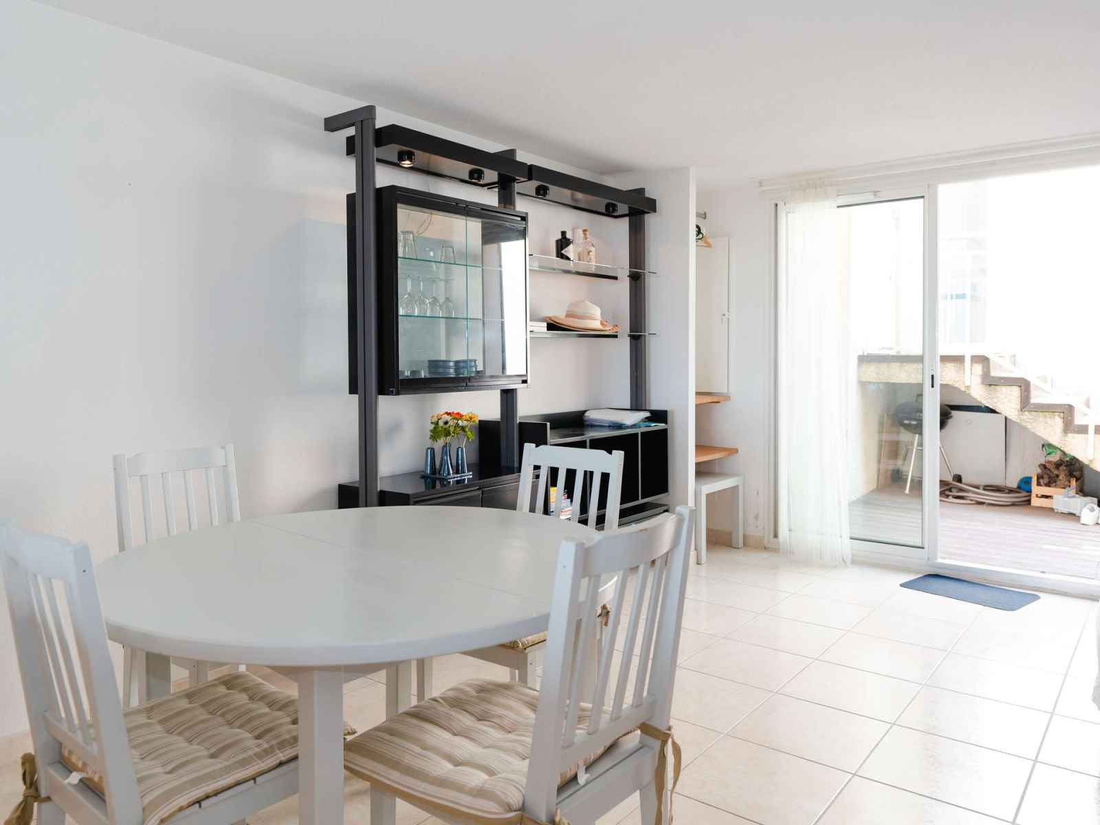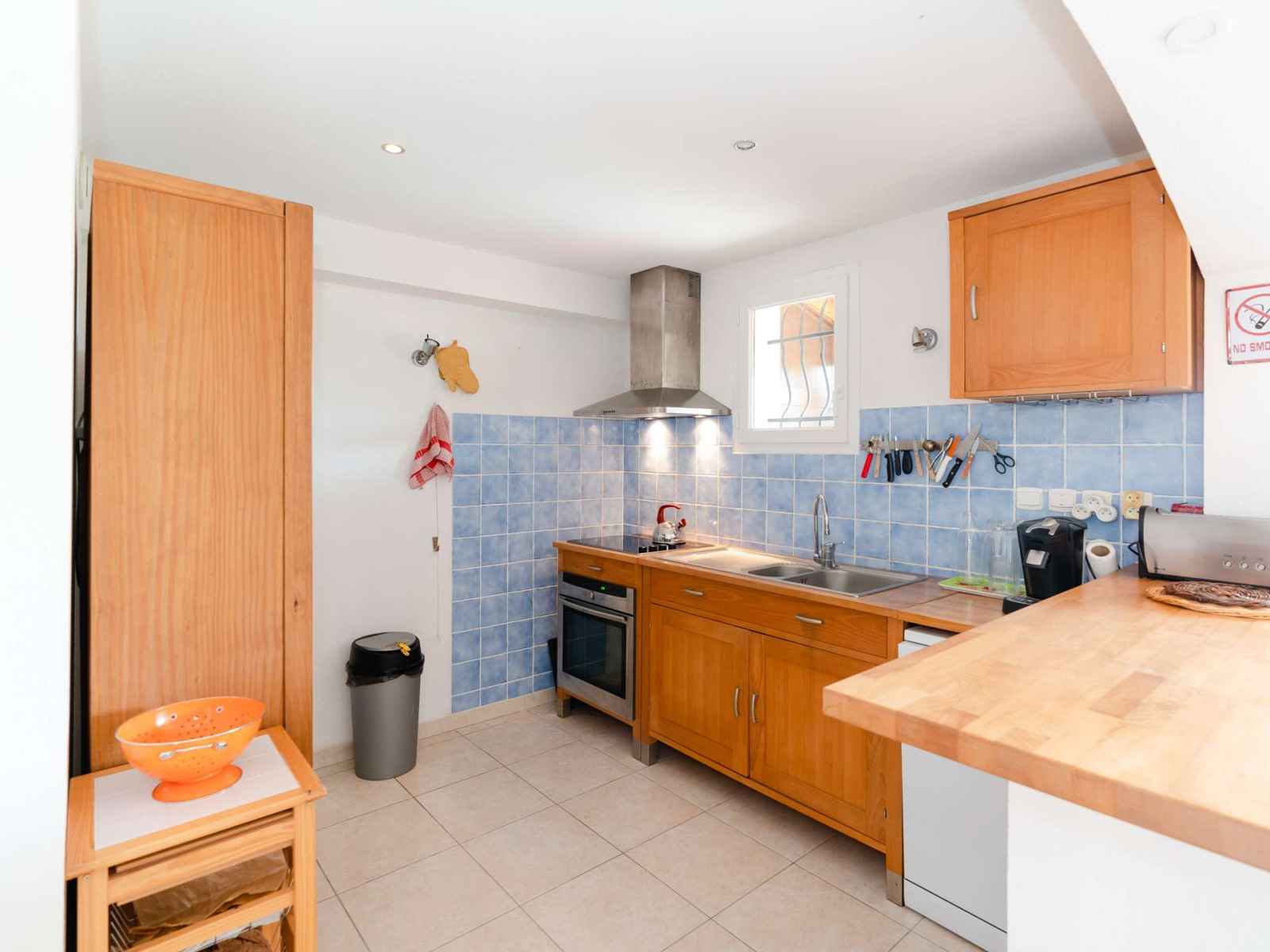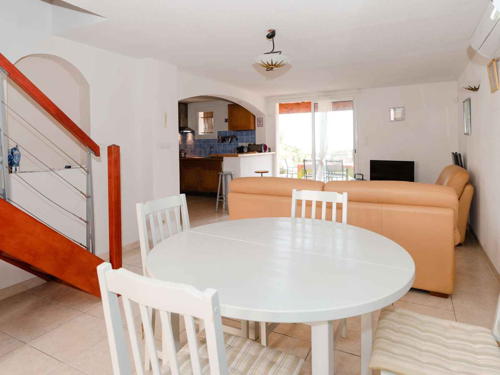 L'entrée donne tout d'abord sur un patio protégé du vent, idéal pour suspendre le linge ou déposer les affaires de plage. La pièce de vie ouverte sur le patio dispose d'un petit vestiaire, une table, un buffet et un espace salon avec canapé et fauteuil (TV avec chaines françaises, poste de radio), donnant sur une cuisine ouverte équipée (plaque de cuisson 4 feux vitro-céramique avec hotte aspirante, cafetière Senseo, grille-pain, bouilloire, grand réfrigérateur avec compartiment congélateur, four, micro-ondes, lave-vaisselle). Un petit cellier attenant à la cuisine abrite le lave-linge et des rangements.