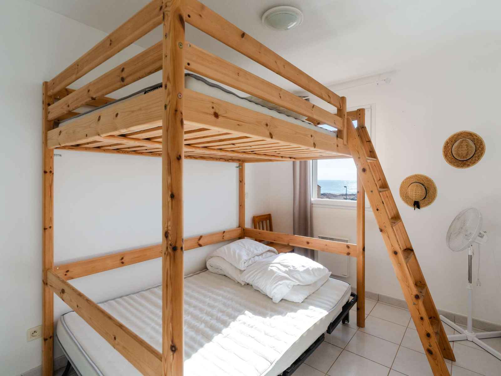 A l'étage se trouve une première chambre avec vue sur mer comportant deux lits superposés en 140x190 et placards, une salle d'eau avec un WC et une deuxième chambre avec vue mer avec deux lits superposés 140x190 et une armoire.