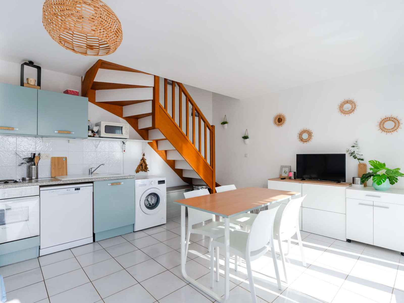 Accès sur Terrasse avec salon de jardin en bois 4 chaises. Pièce de vie avec TV (chaines françaises), table pour 6 personnes, et un espace cuisine entièrement équipé (cafetière à piston, 2 plaques de cuisson vitrocéramiques, un grand réfrigérateur avec congélateur, lave-vaisselle, lave-linge).