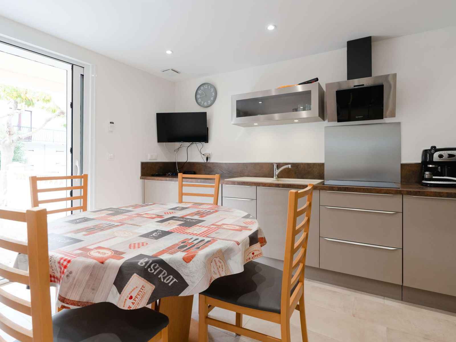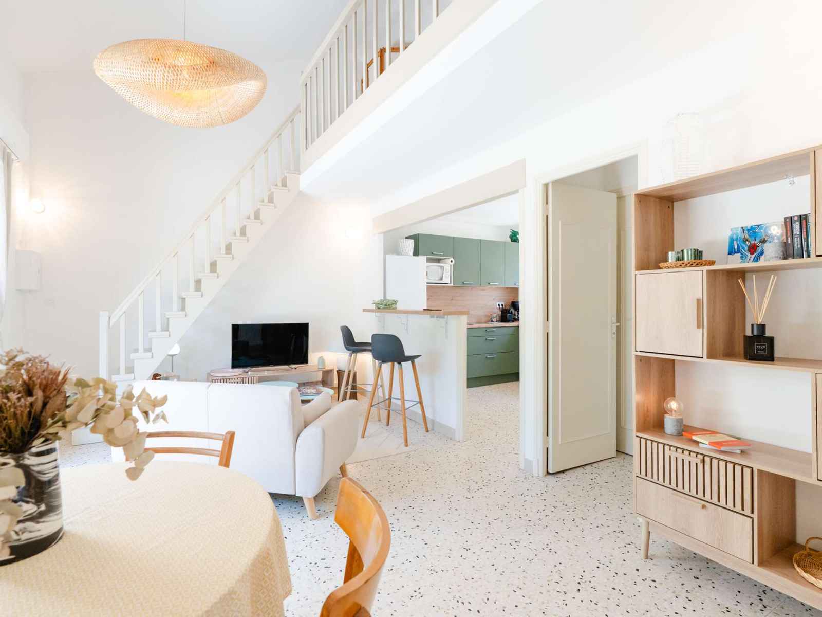 L'entrée se fait à l'arrière de la maison par une cuisine ouverte sur le salon, très bien équipée (réfrigérateur avec compartiment congélateur, lave-vaisselle, four, micro-ondes, cafetière classique et Nespresso, plaque induction 3 feux, hotte aspirante, bouilloire). Le salon climatisé comprend une table ronde pour 4 personnes, un canapé pour 2 personnes et TV (chaines françaises), avec accès à la terrasse située devant la maison.