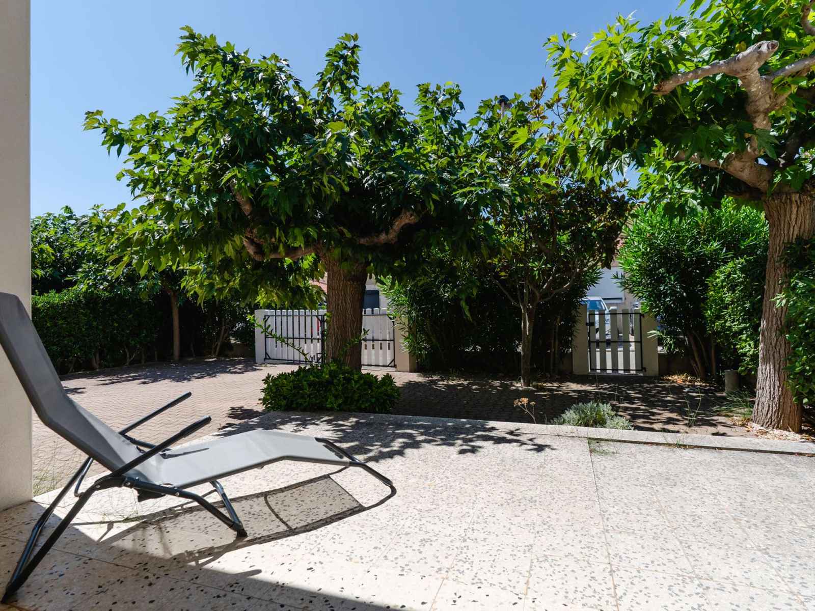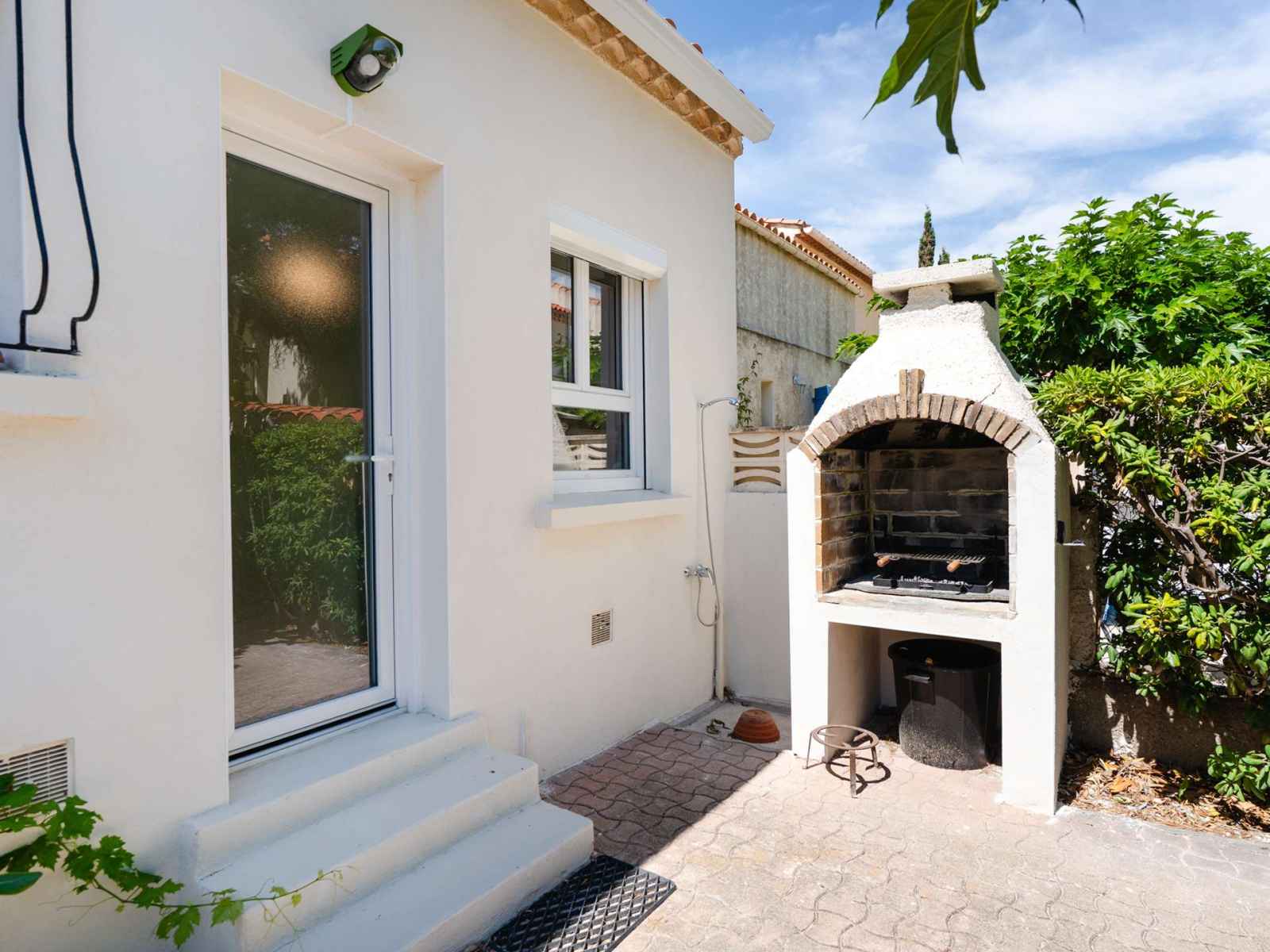 L'espace extérieur est vaste, avec un salon de jardin, une douche extérieure, un étendoir fixe et un barbecue en dur (charbon non fourni). Le garage à usage de stockage n'est pas accessible.