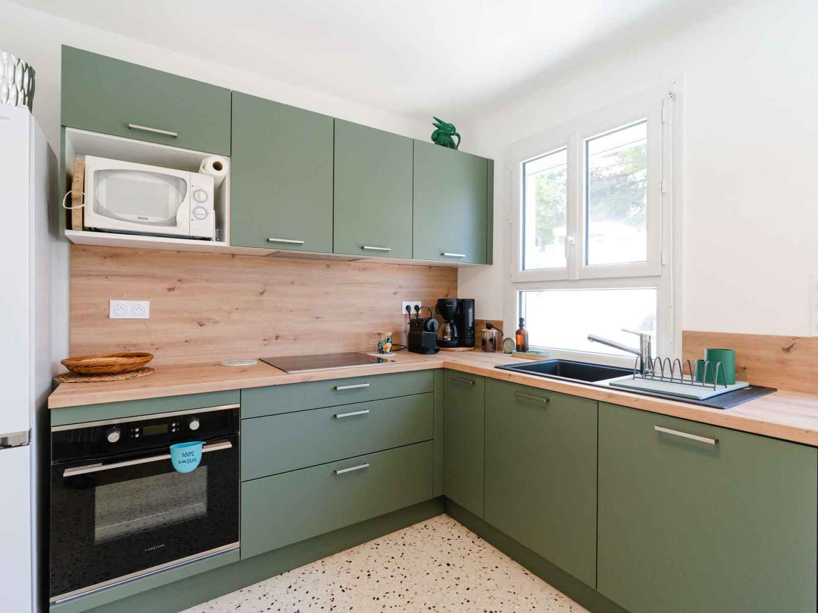 - Cuisine 9m² (Ouverte sur salon, avec bar et 2 chaises hautes)