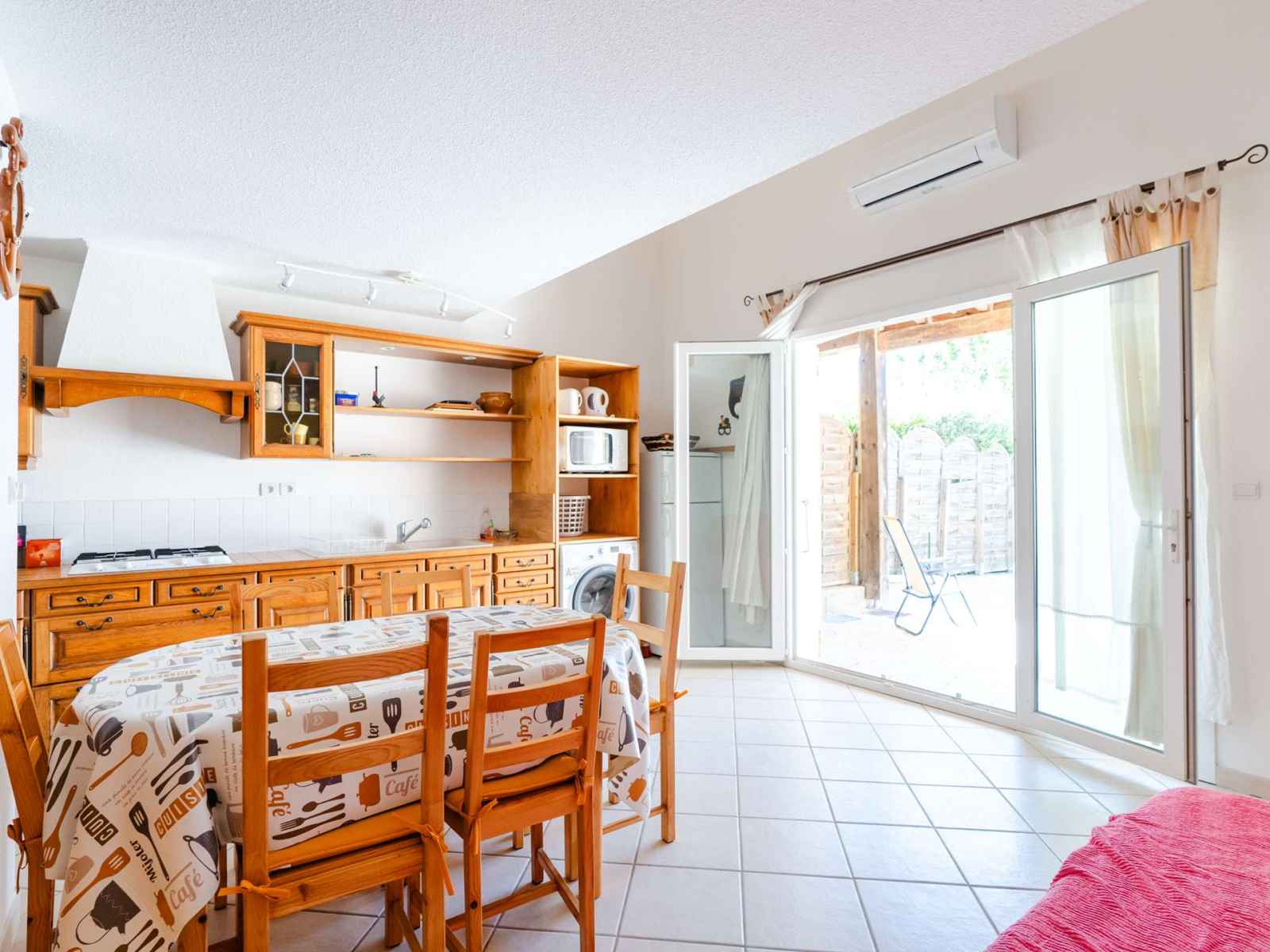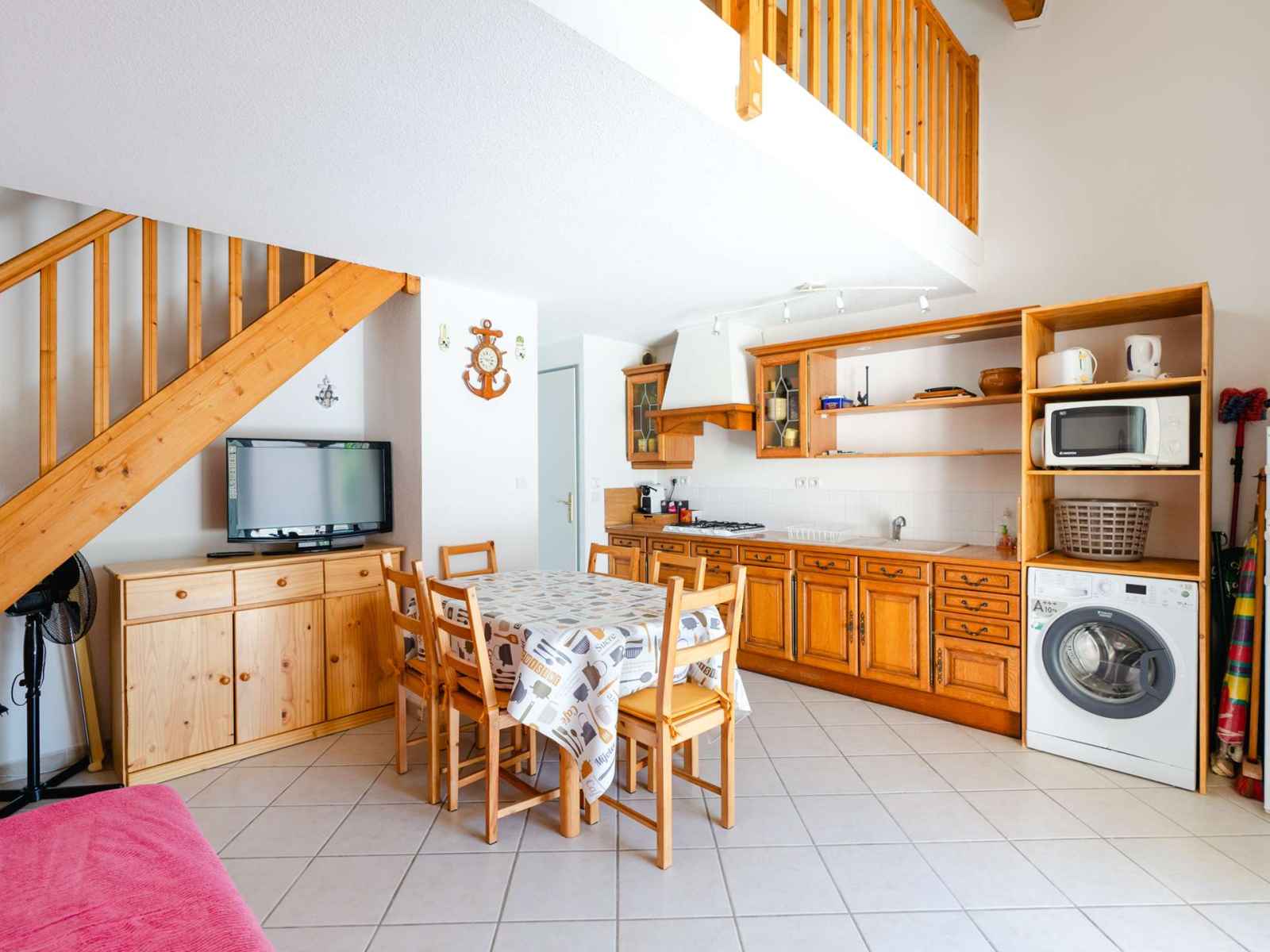 forme un espace de vie convivial équipé d'un canapé, d'une table pour 6 personnes, d'une télévision, d'un réfrigérateur, d'une cafetière à capsules, d'un micro-ondes, d'une hotte aspirante, d'une bouilloire, d'un grille-pain, de plaques à gaz, d'un lave-linge et d'une climatisation uniquement dans le salon.