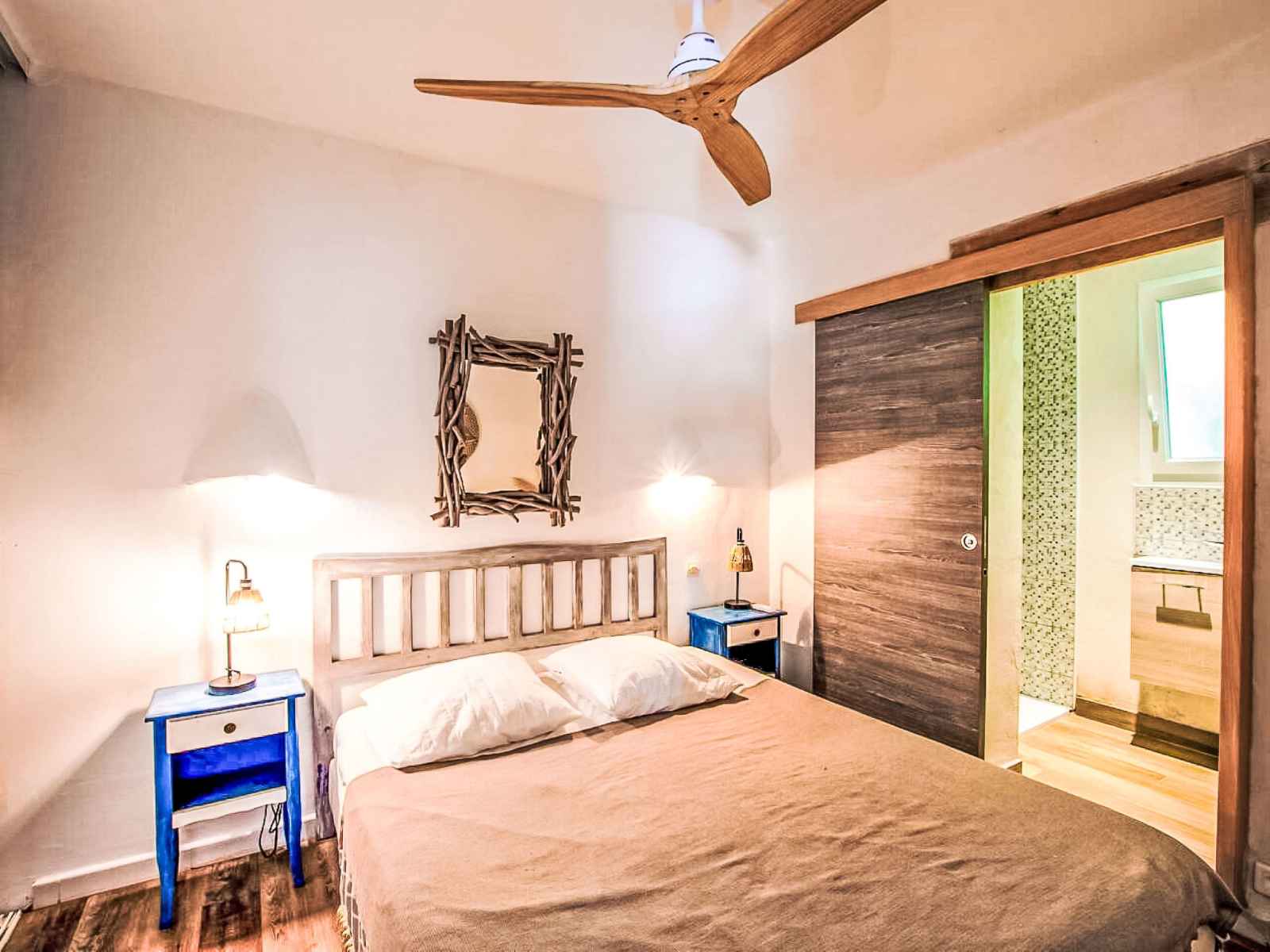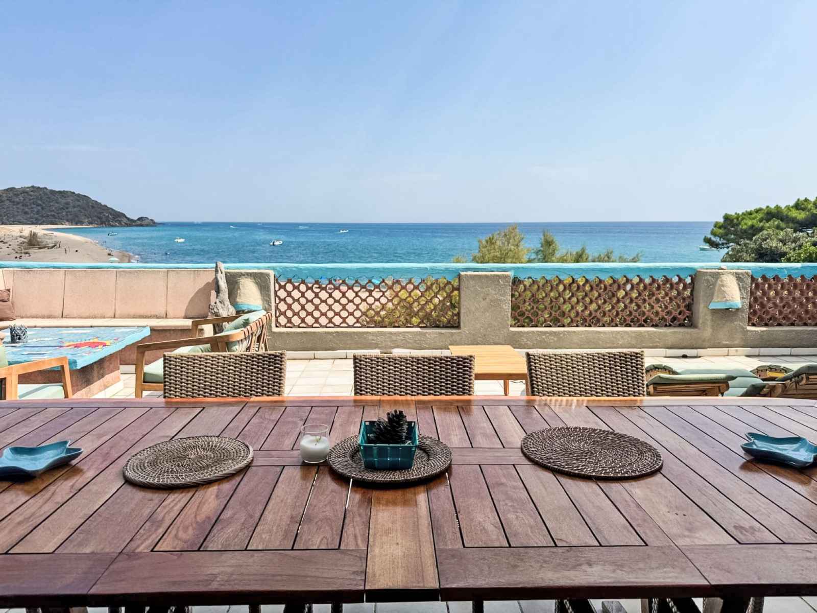 Maison à 2 apts "casa blue". situation tranquille, ensoleillée, à 30 m de la mer, à 30 m de la plage, accès direct à la plage. en commun: terrain (clôturé), place de parking près de la maison. supermarché 6 km, restaurant 50 m, boulangerie 6 km, arrêt de bus 6 km, plage de sable "plage des americains" 30 m. ecole de voile 8 km.