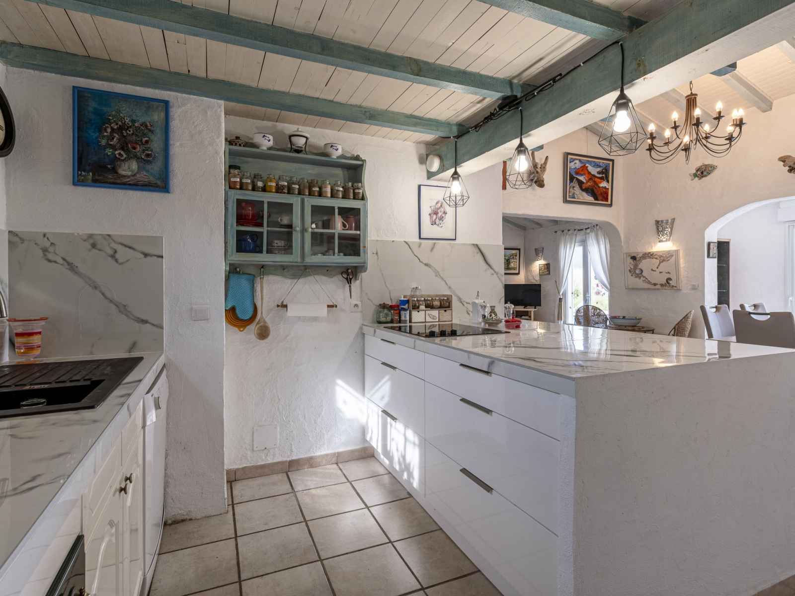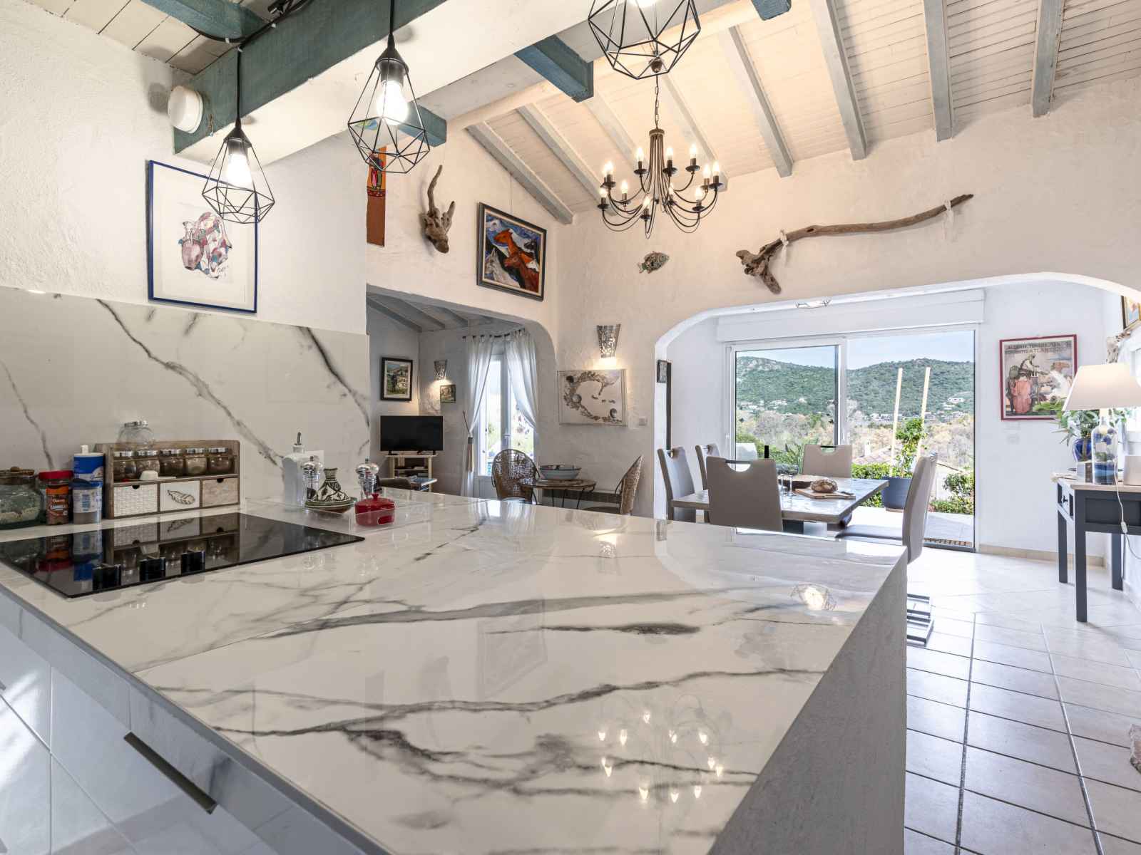 (four, lave-vaisselle, 3 plaques vitrocéramiques, grille-pain, bouilloire électrique, micro-ondes, congélateur, cafetière électrique, Capsules pour machine à café (Nespresso) (NON INCLUSES), ilot de cuisine). 2 douches, 2 WC séparés. Chauffage électrique, air-conditionné. Mobilier confortable de style campagnard. Grande terrasse 55 m2. Meubles de terrasse, barbecue électrique, chaises longues. Très belle vue sur la mer et les montagnes. A disposition: lave-linge. Internet (Connexion WIFI, gratuit). Veuillez noter: maison non-fumeur. Maximum 1 animal/ chien de petite taille autorisé. Détecteur de fumée. Annonce d'un particulier (art 155, IV du CGI).