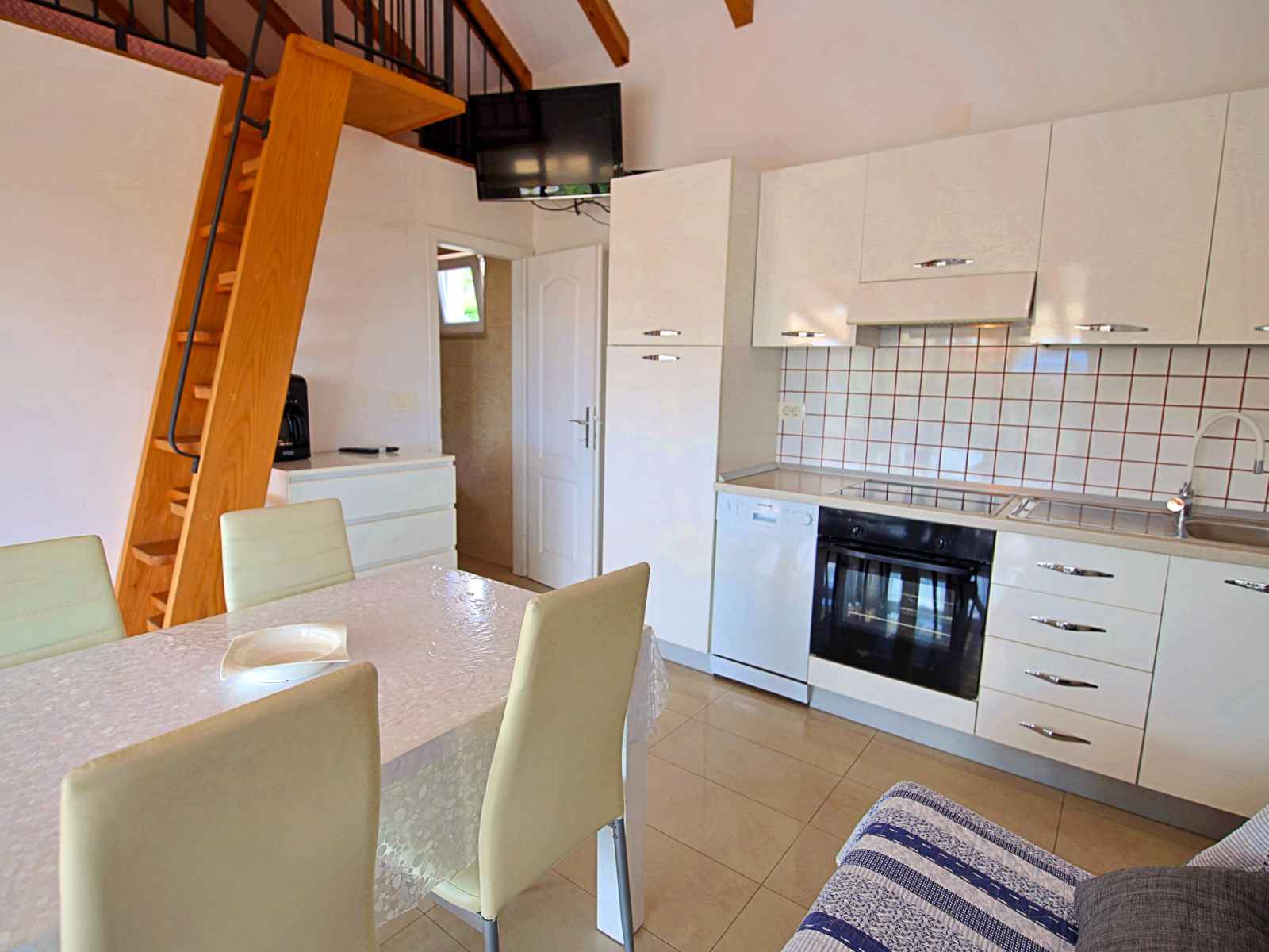 Maison 2 pièces 29 m2 sur 2 niveaux. séjour/salle à manger avec tv (satellite) (écran plat), air-conditionné. sortie sur la terrasse. 1 chambre avec 1 grand-lit (160 cm, longueur 200 cm). cuisine ouverte (4 plaques de cuisson, four, lave-vaisselle, congélateur). douche/wc. sous le toit: (échelle) galerie ouverte, mansardée hauteur plafond
