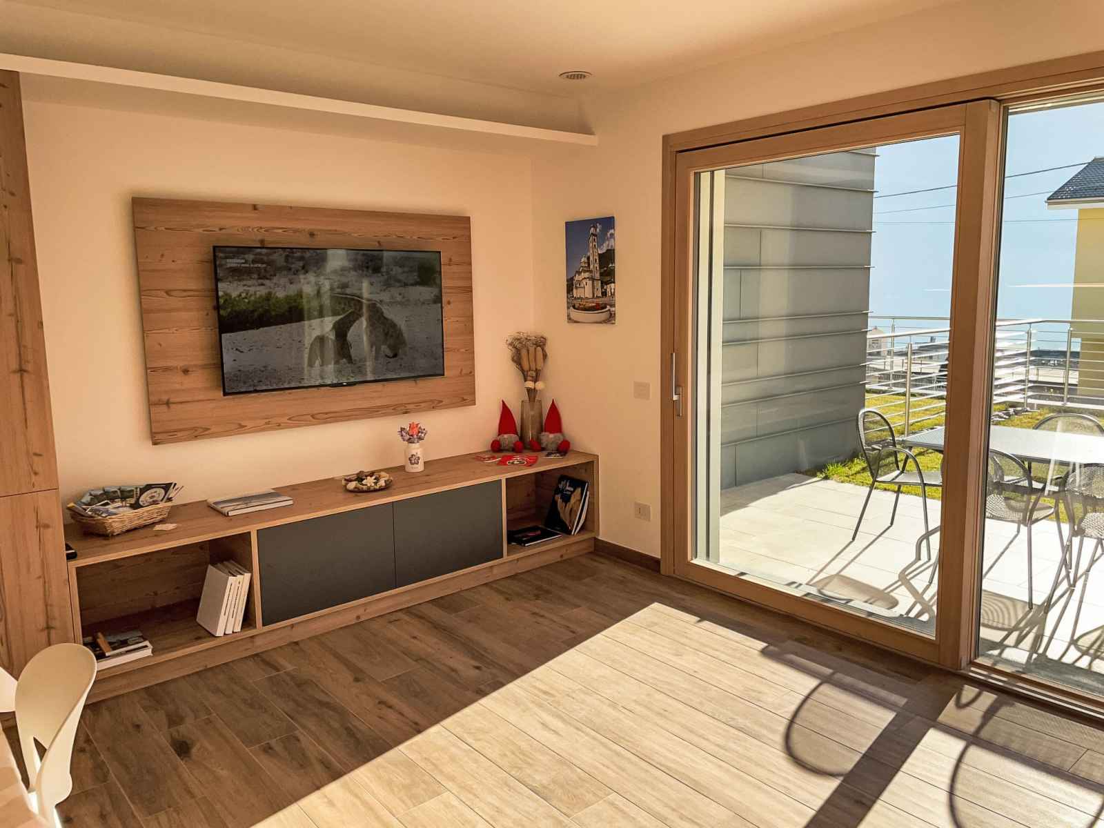 "guarnelle house 1", maison jumelée 4 pièces 100 m2 sur 2 niveaux. spacieux et clair, partiellement mansardée, aménagement confortable et moderne: grand séjour/salle à manger avec porte coulissante, baie vitrée avec 1 divan-lit double, table pour les repas et tv. sortie sur le jardin. coin cuisine (lave-vaisselle, 4 plaques à induction,