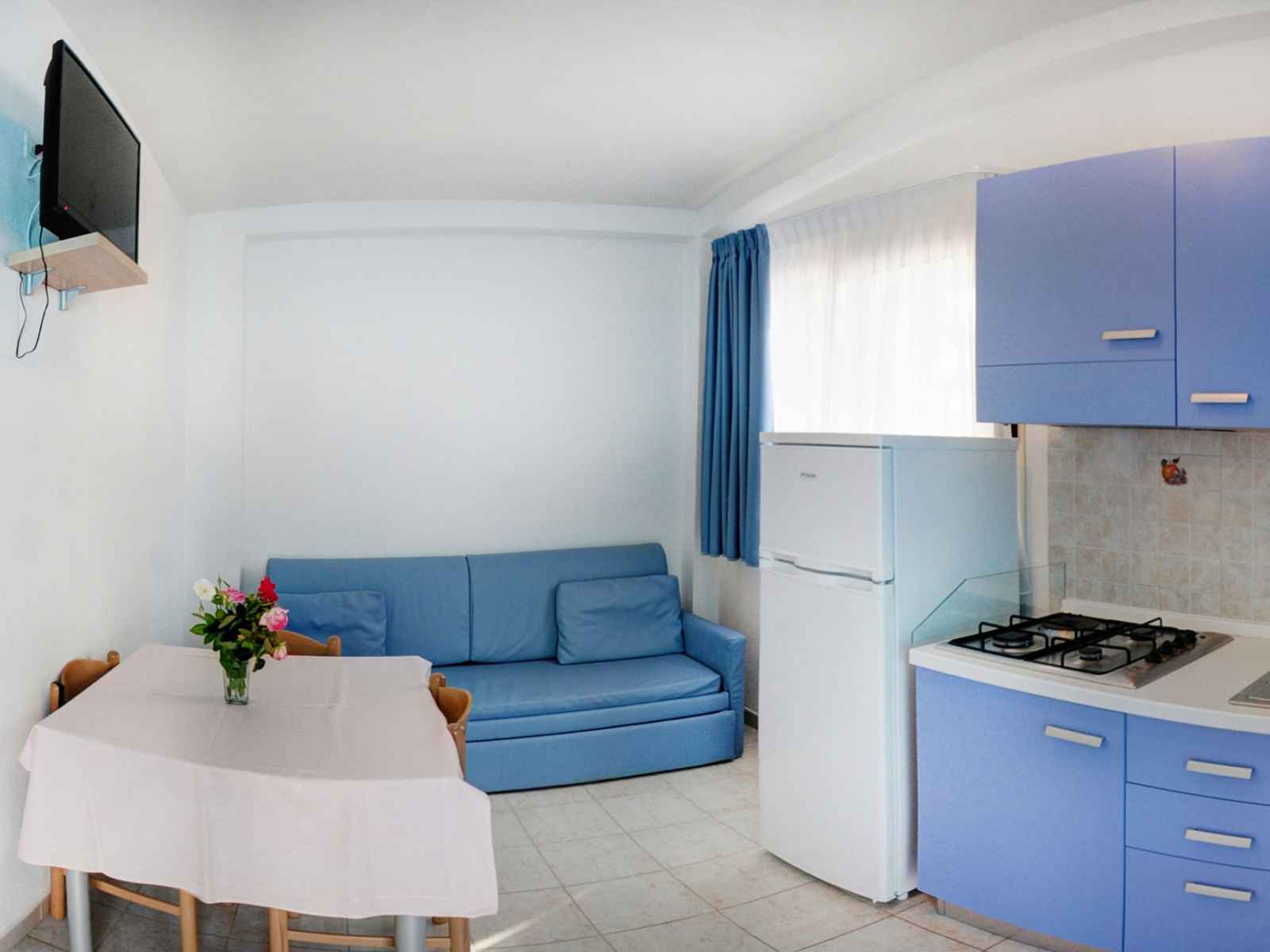 Maison mitoyenne 3 pièces 50 m2, rez-de-chaussée surélevé. aménagement fonctionnel: séjour/chambre à coucher avec 1 divan-lit, 1 lit gigogne, table pour les repas et tv. sortie sur la terrasse. 2 chambres doubles. coin cuisine (4 plaques de cuisson). douche/bidet/wc, wc séparé. chauffage (en sus), air-conditionné (en sus). terrasse