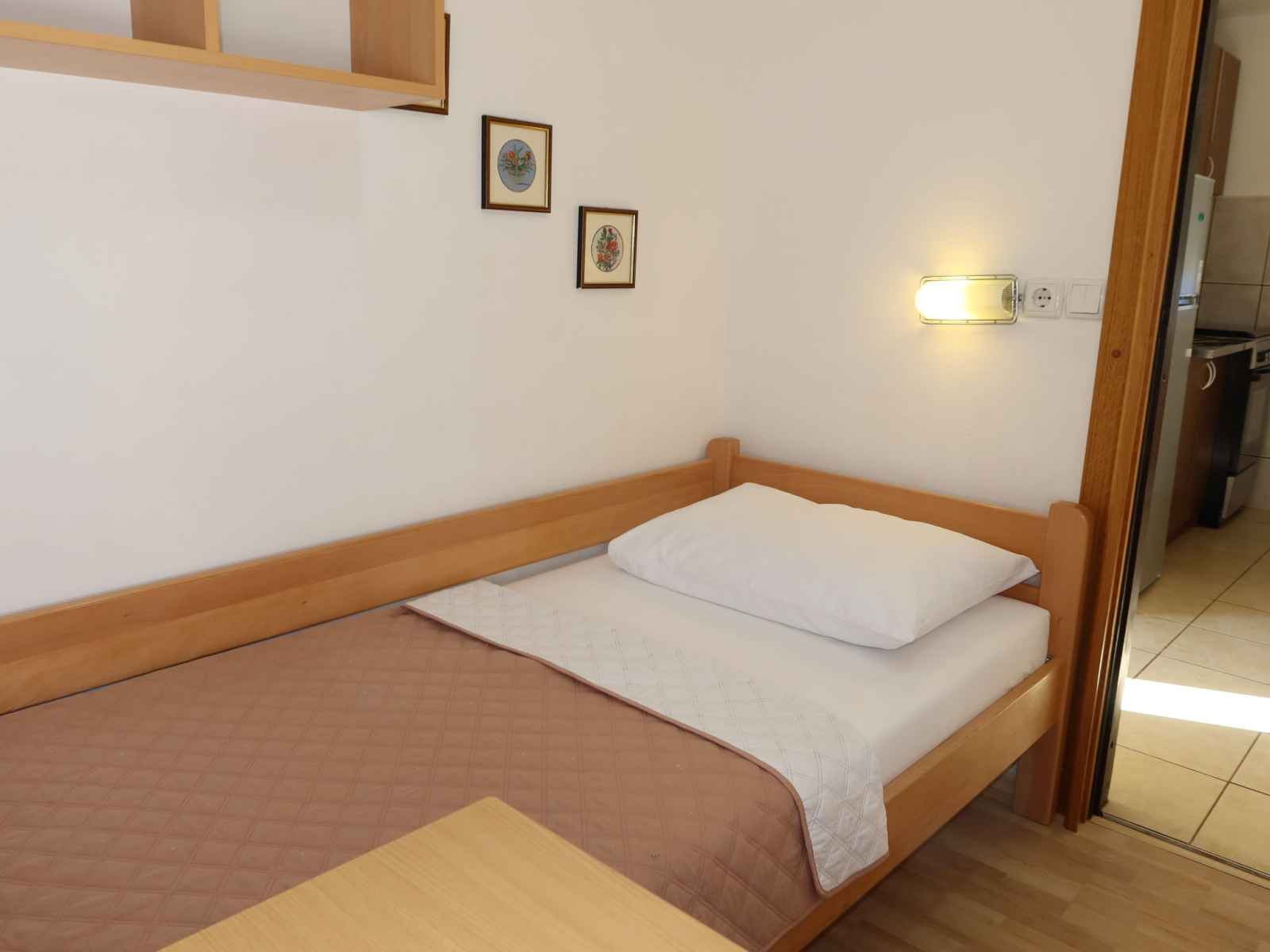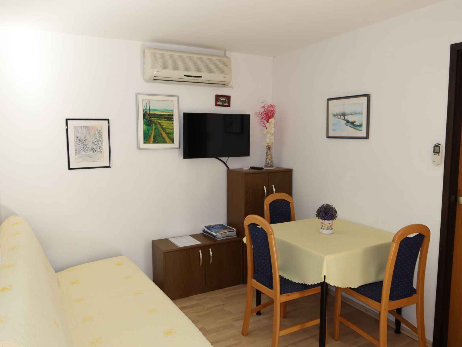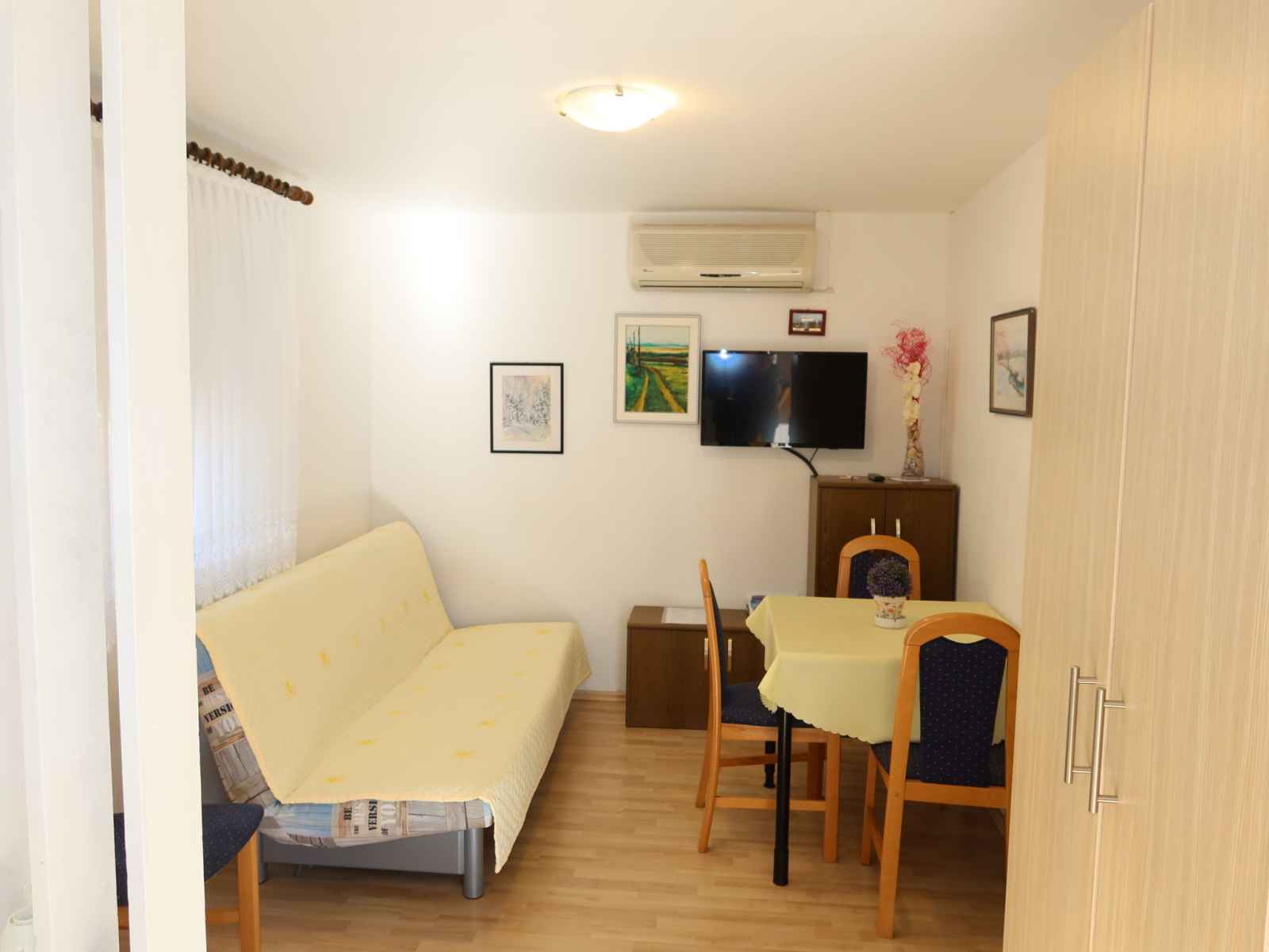 Maison 3 pièces 45 m2, au rez-de-chaussée. aménagement fonctionnel: séjour/salle à manger avec 1 divan-lit, tv (satellite) et air-conditionné. sortie sur la terrasse. 1 petite chambre, sans armoire avec 2 lits. 1 petite chambre avec 1 grand-lit (160 cm, longueur 200 cm). cuisine ouverte (4 plaques de cuisson, four, grille-pain, bouilloire