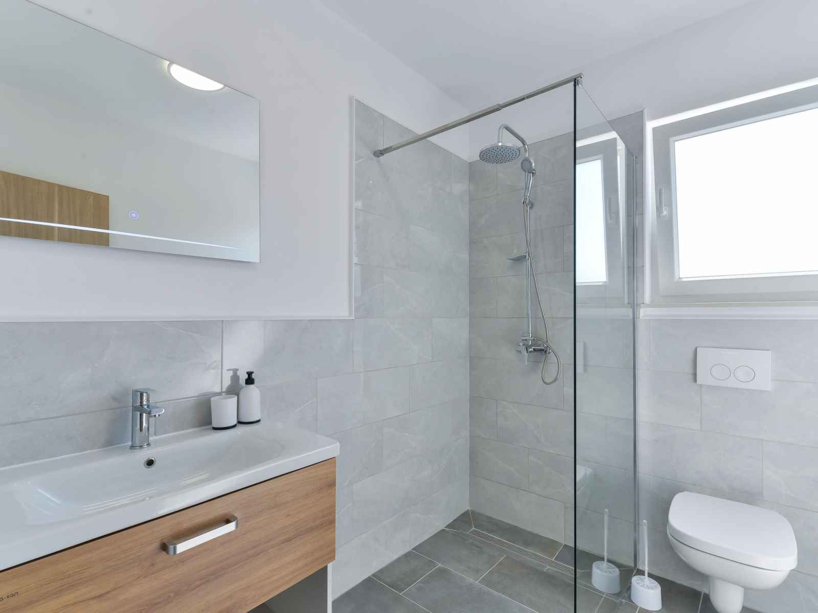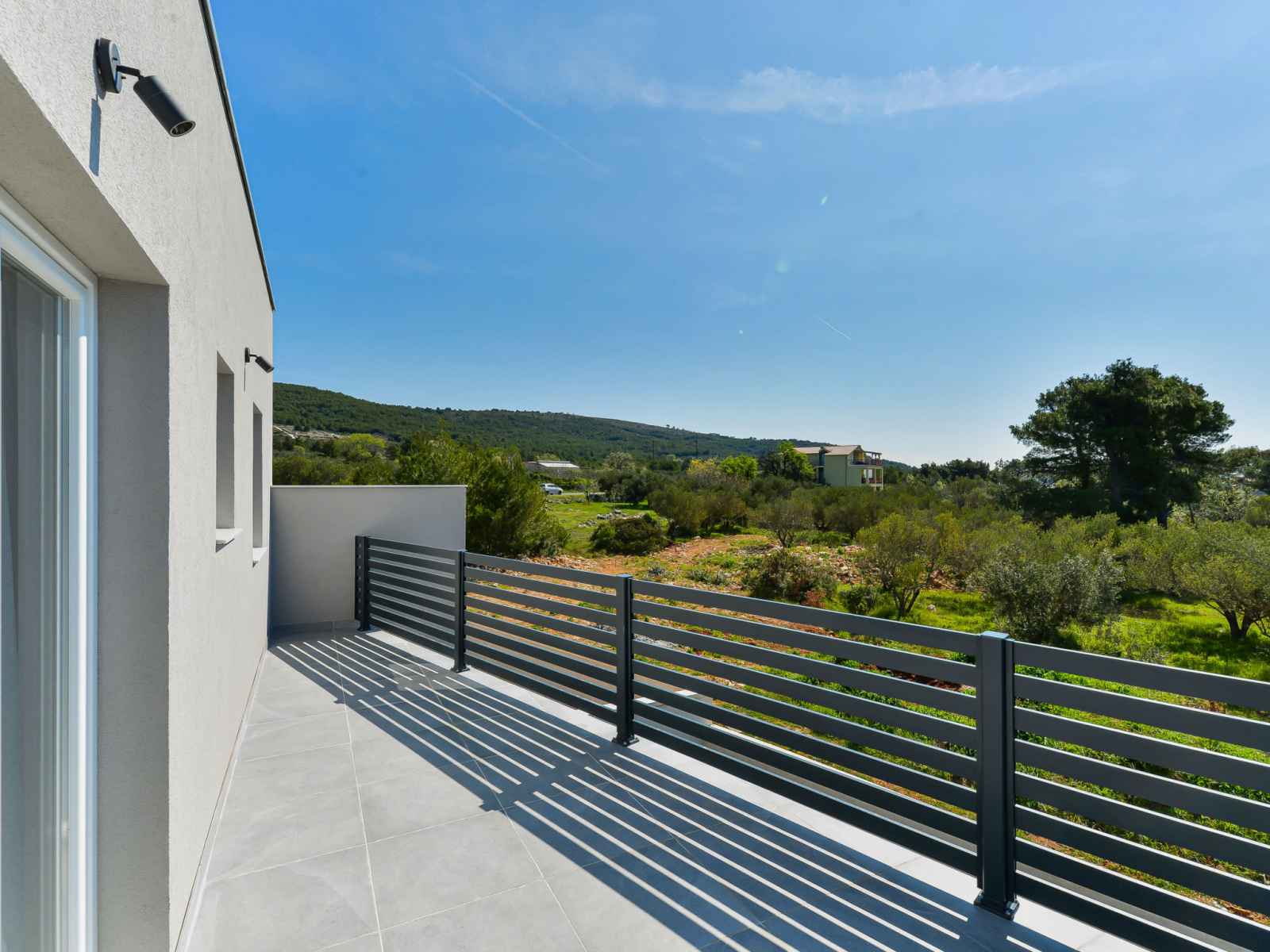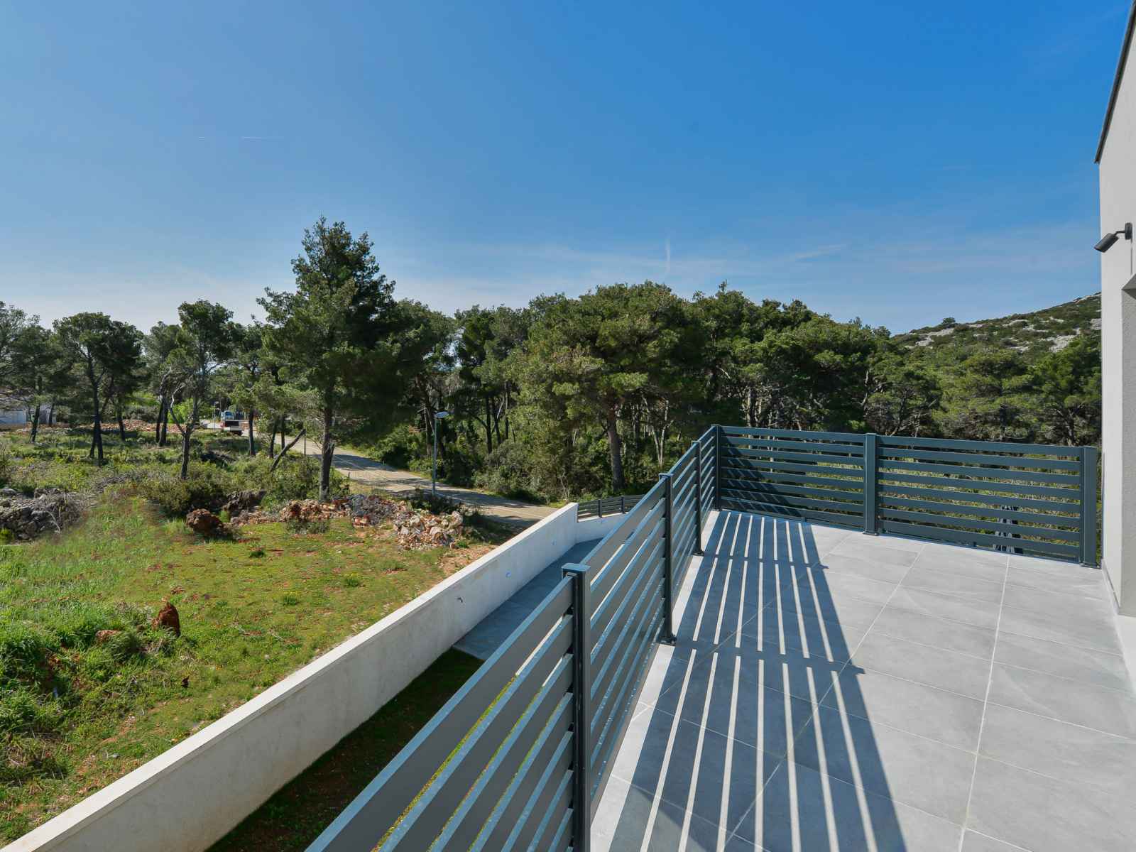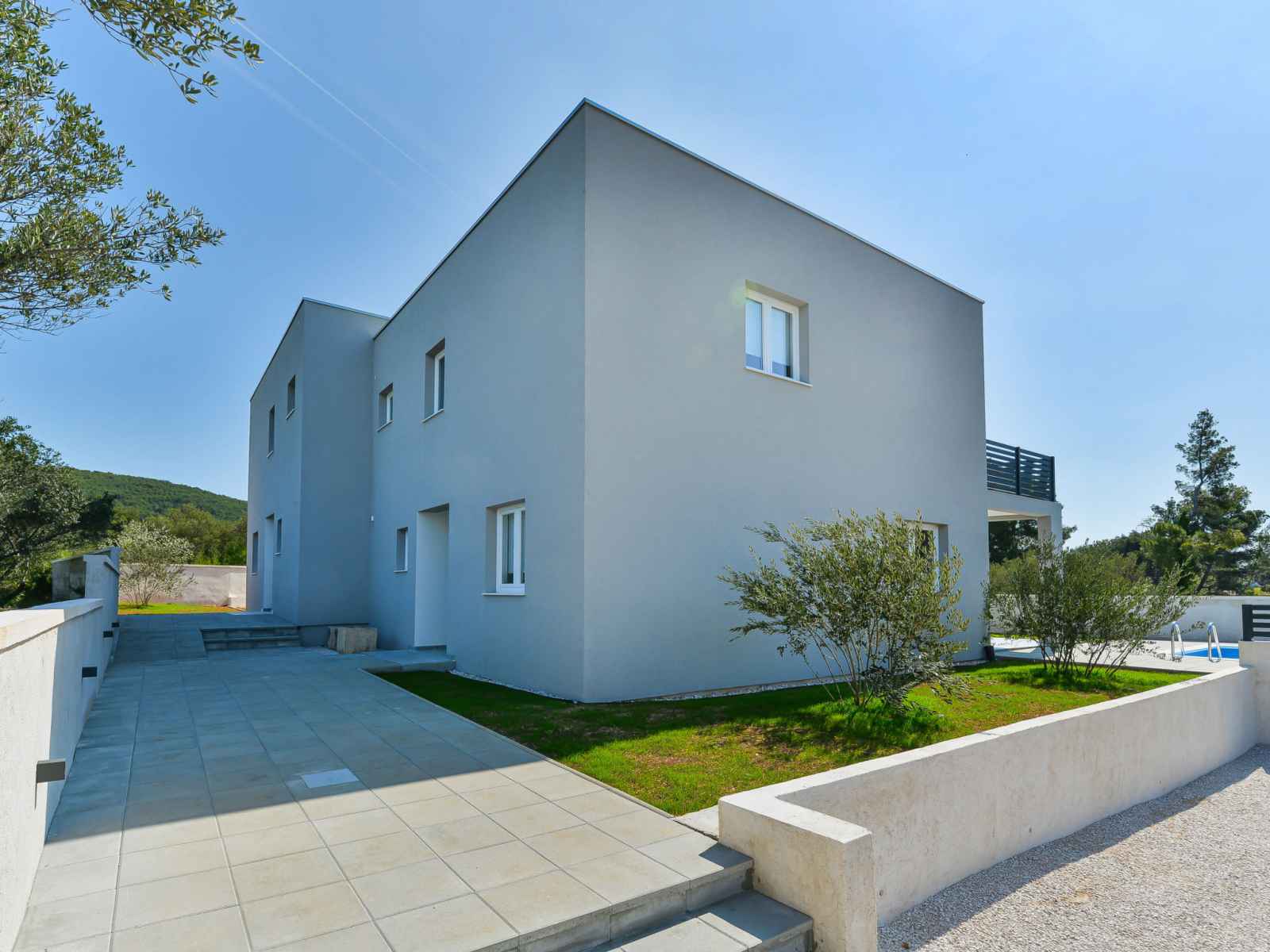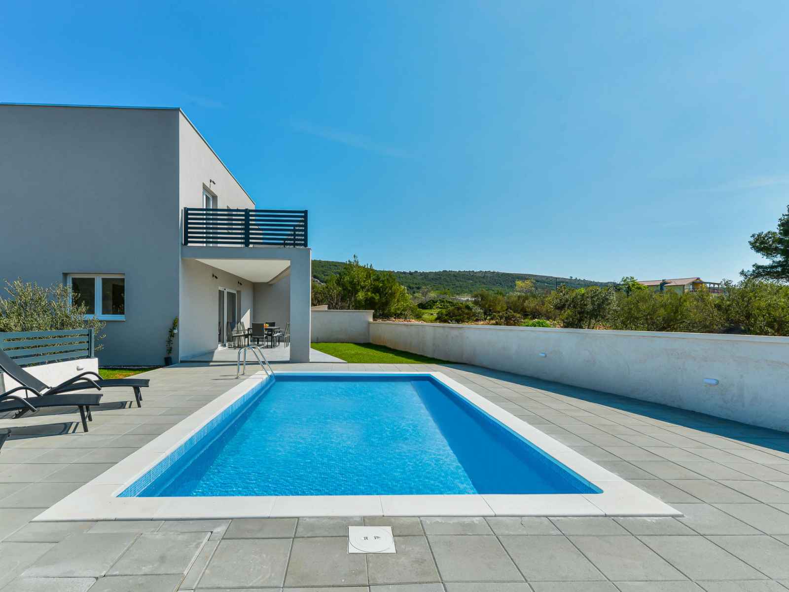 Tribunj à 5 km de vodice: belle maison jumelée moderne "gušt", de 2 étages, année de construction 2023. dans le hameau de sovlje, à 1.5 km du centre de tribunj, situation tranquille, ensoleillée, à 400 m de la mer, à 500 m de la plage. a usage privé: terrain 350 m2, piscine rectangulaire, chauffée (6 x 3 m, 21 m2, profondeur 150 cm,