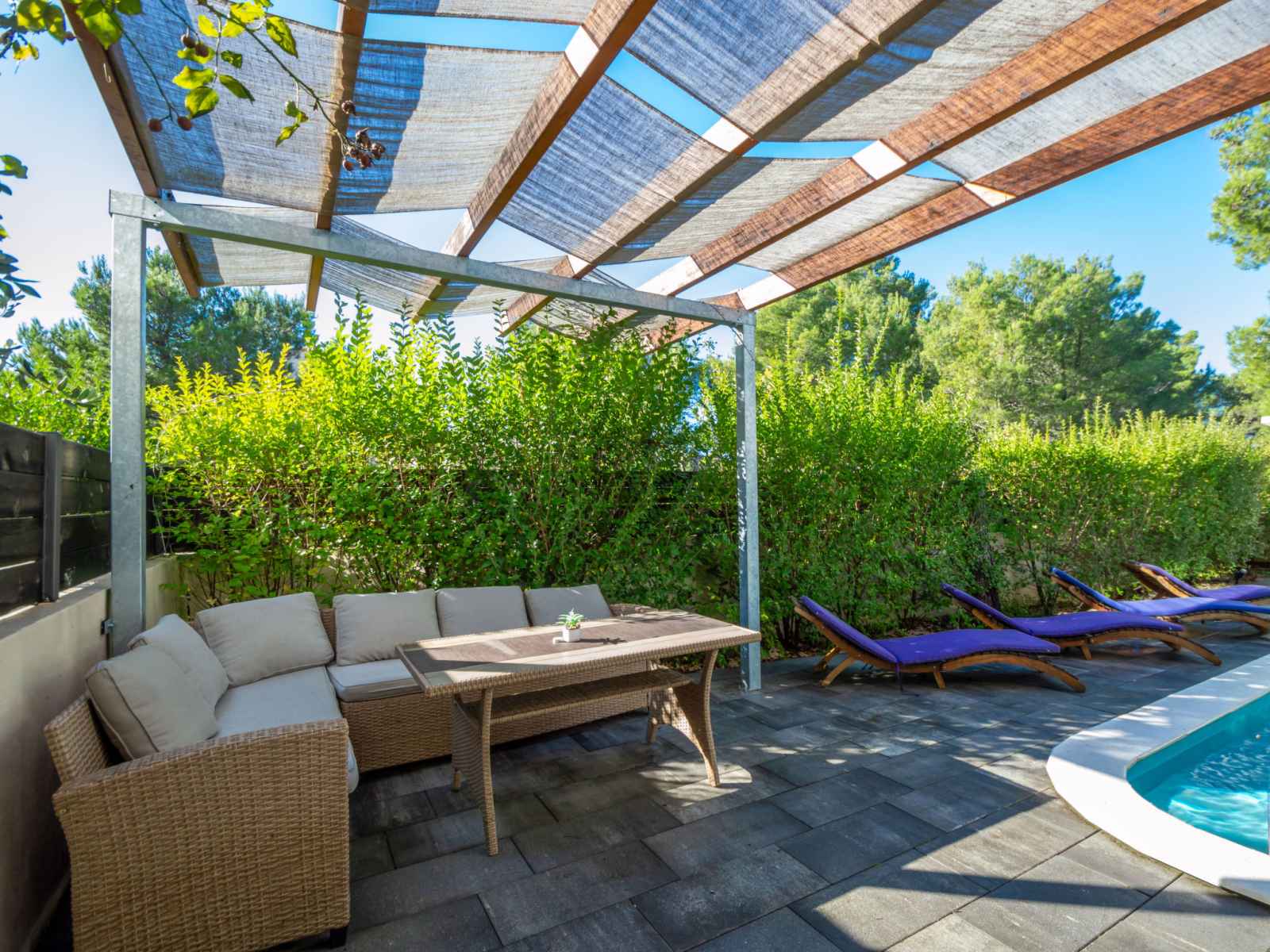 Douche/WC. À l'étage supérieur: 1 chambre avec 1 grand-lit (200 cm, longueur 210 cm), douche/WC et TV (satellite) (écran plat), air-conditionné. Sortie sur la terrasse. 1 chambre avec 1 grand-lit (200 cm, longueur 210 cm), douche/WC et air-conditionné. Sortie sur la terrasse. Chauffage à air chaud. Terrasse 20 m2, terrasse 15 m2. Meubles de terrasse. Vue sur la piscine. A disposition: coffre-fort, sèche-cheveux. Internet (Connexion WIFI, gratuit).