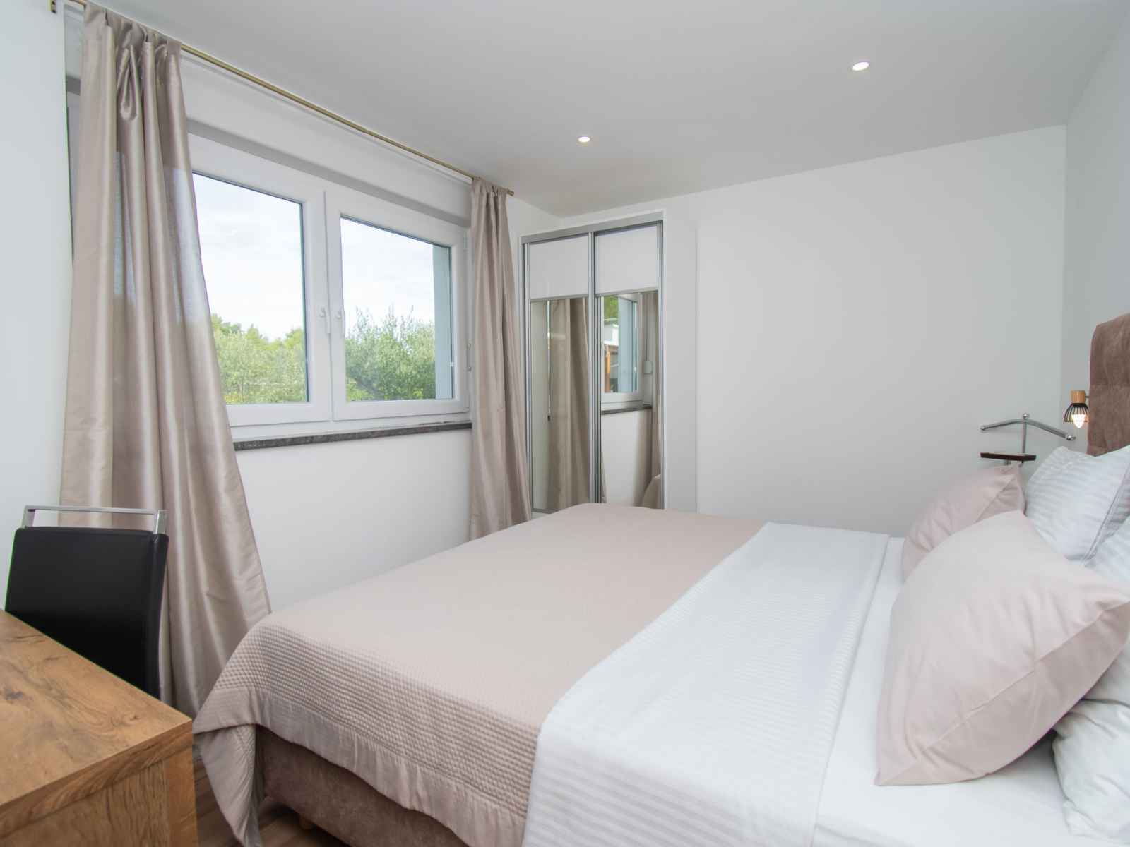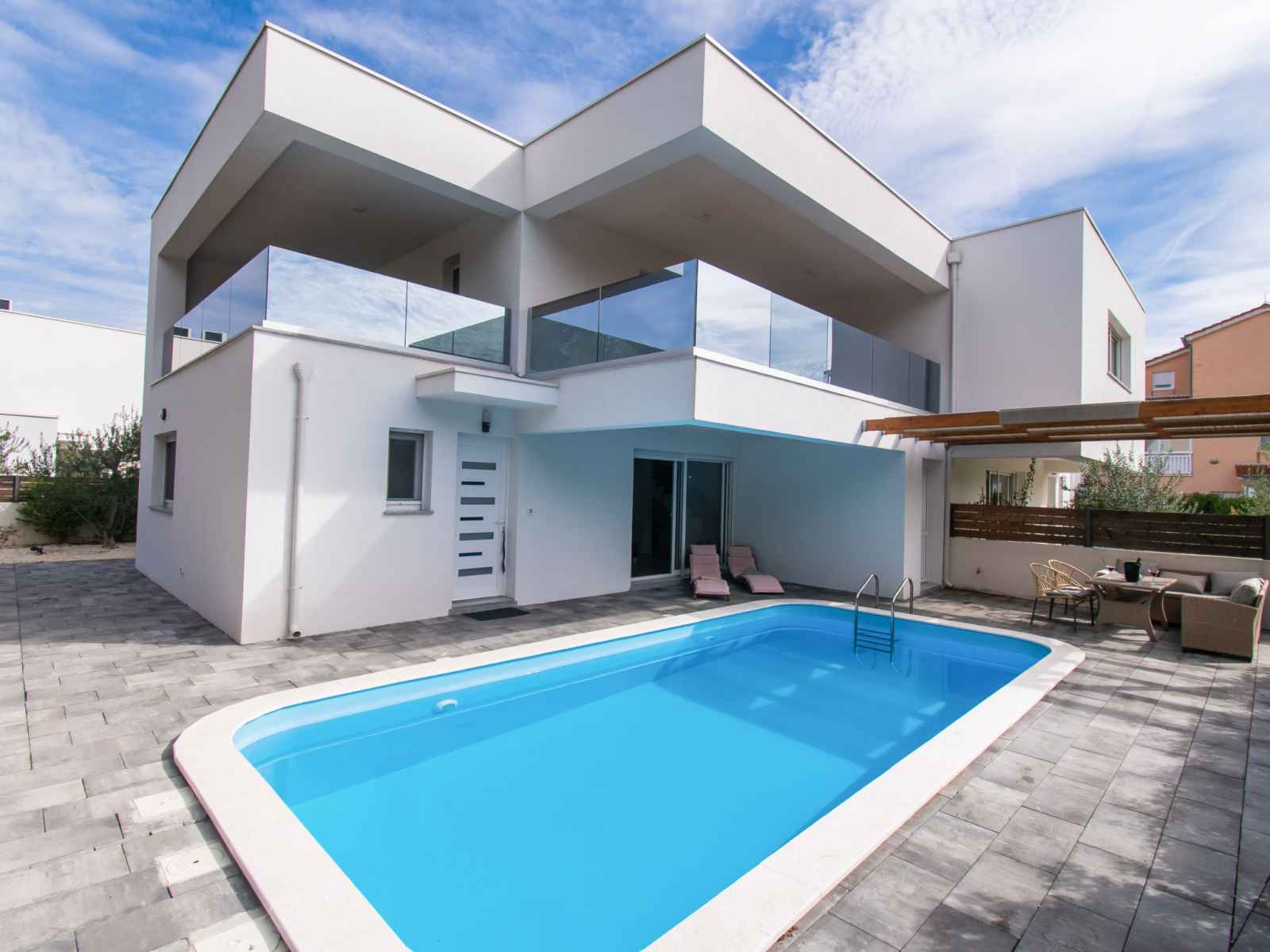 Maison jumelée "villa franko", de 2 étages. dans le quartier de srima, à 3 km du centre de vodice, situation ensoleillée, à 400 m de la mer, à 400 m de la plage. a usage privé: terrain 450 m2 (clôturé), piscine rectangulaire (7 x 3 m, 24 m2, profondeur 150 cm, disponibilité saisonnière: 01.avr. - 15.oct.). douche extérieure, barbecue.