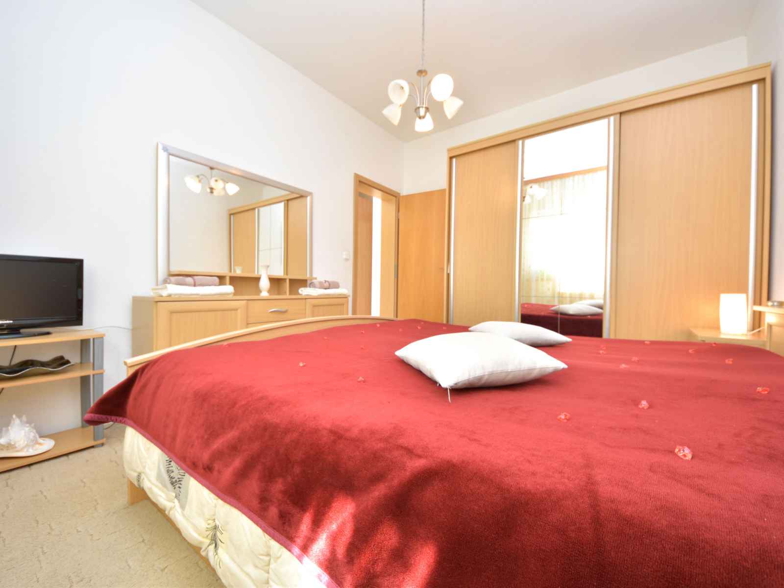 l'étage supérieur: 1 chambre avec 1 lit double (2 x 90 cm, longueur 200 cm), TV (satellite) et air-conditionné. Sortie sur la terrasse. 1 chambre avec 1 lit double et TV (satellite). 1 chambre d'enfants avec 1 lit, 1 lit gigogne et air-conditionné. Douche/WC. Pas de chauffage. Terrasse 15 m2, couverte, terrasse 15 m2. Meubles de terrasse. Vue sur le jardin. A disposition: Internet (Connexion WIFI, gratuit).