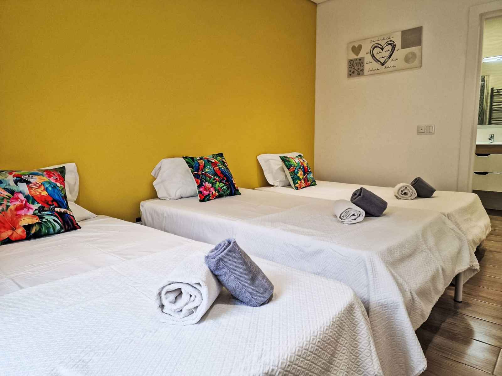 (câblée), écran plat, air-conditionné et chauffage à air chaud. 1 chambre avec 1 grand-lit (160 cm, longueur 200 cm), douche/WC, air-conditionné et chauffage à air chaud. 1 chambre avec 3 lits (90 cm, longueur 200 cm), douche/WC, air-conditionné et chauffage à air chaud. Cuisine ouverte (four, lave-vaisselle, 4 plaques vitrocéramiques, grille-pain, bouilloire électrique, micro-ondes, congélateur, cafetière électrique, Capsules pour machine à café (Dolce Gust not Incl.)). Bain/WC. Barbecue, chaises longues, place pour s'asseoir. Vue sur la piscine et le cité. A disposition: lave-linge, fer à repasser, chaise haute pour enfant, lit bébé jusqu'à 2 ans (en sus), sèche-cheveux. Internet (Connexion WIFI, gratuit). Veuillez noter: sans ascenseur. 107466/AL