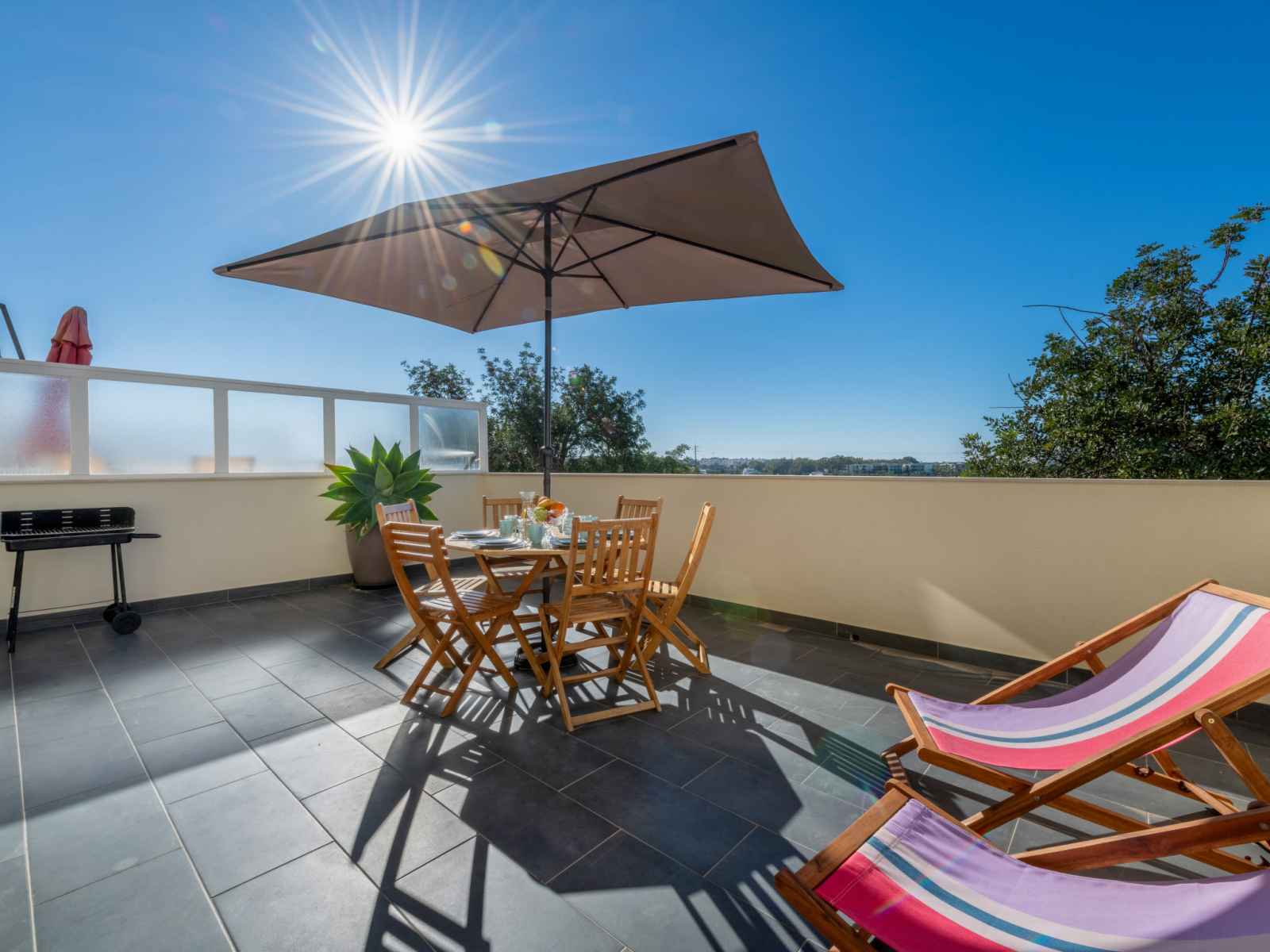 séjour/salle à manger avec TV (câblée), chaînes de TV internationales, écran plat, air-conditionné et chauffage à air chaud. Sortie sur la terrasse. À l'étage supérieur: 1 chambre avec 1 grand-lit (160 cm, longueur 200 cm), douche/WC, air-conditionné et chauffage à air chaud. Sortie sur le balcon. 1 chambre avec 2 lits (90 cm, longueur 200 cm). Sortie sur le balcon. 1 chambre avec 1 grand-lit (160 cm, longueur 200 cm). Bain/WC. Air-conditionné. Meubles de terrasse, barbecue, chaises longues (6). Vue sur la mer et la localité. A disposition: lave-linge, fer à repasser, chaise haute pour enfant, lit bébé jusqu'à 2 ans, sèche-cheveux. Internet (Connexion WIFI, gratuit). Place de parking près de la maison. Adapté(e) aux familles. 160136/AL