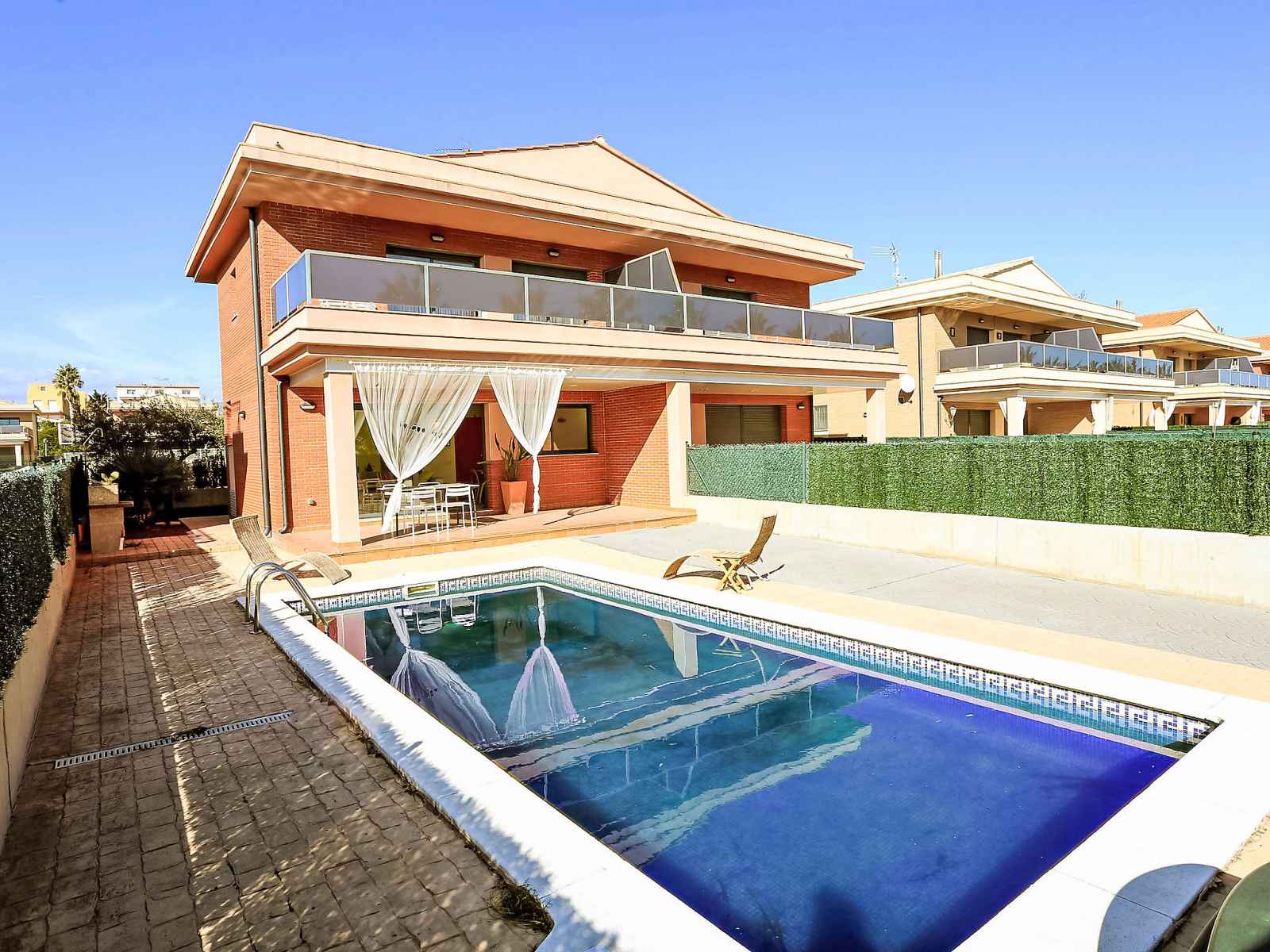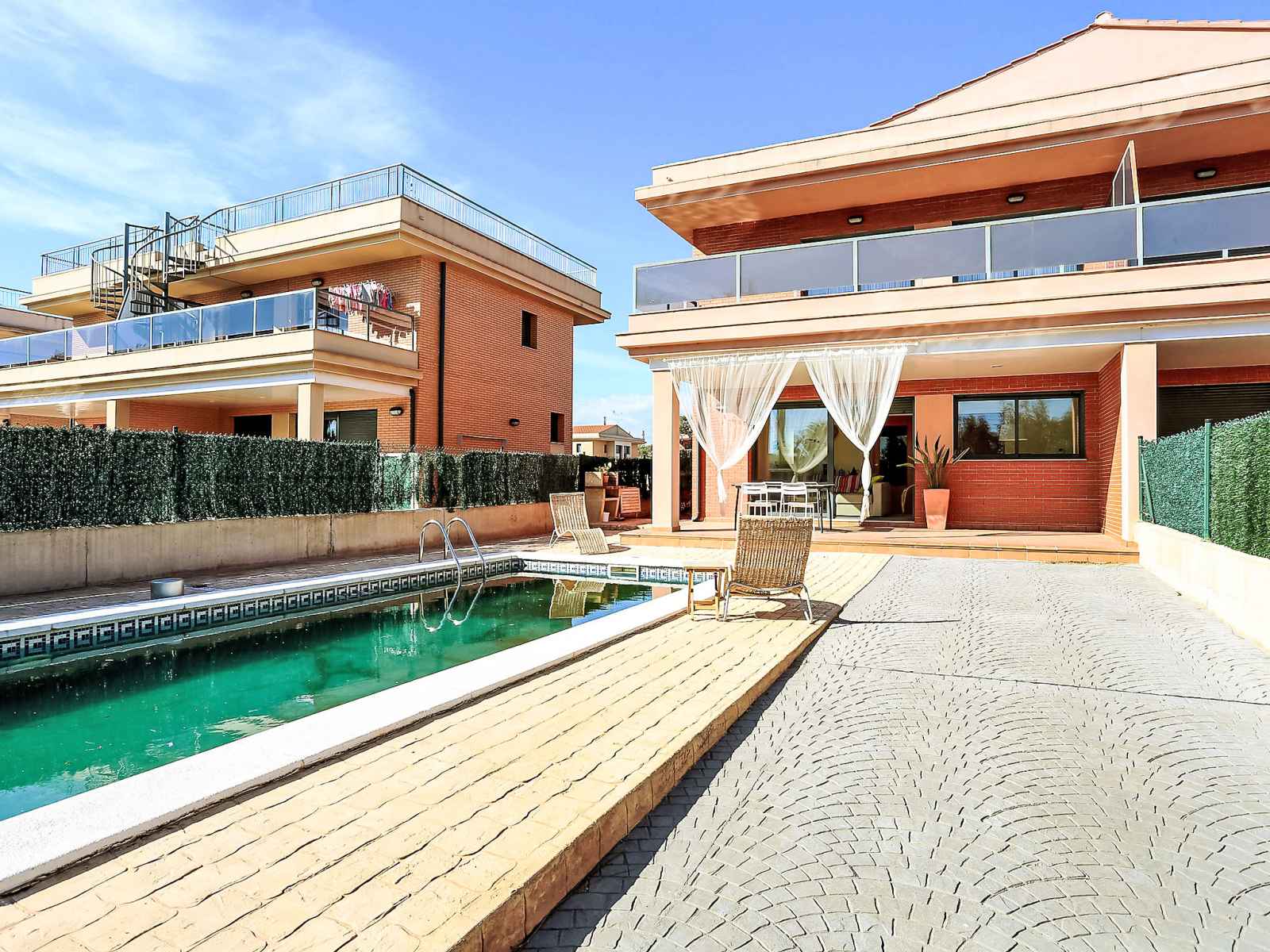 Urb. ampolla mar: maison moderne, accueillante, confortable "peiro", de 2 étages, jumelée, année de construction 2006. dans la localité, à 1.3 km du centre de l'ampolla, situation ensoleillée, à 200 m de la mer, à 300 m de la plage, route à traverser. a usage privé: terrain 120 m2 (clôturé), piscine rectangulaire (3 x 8 m,