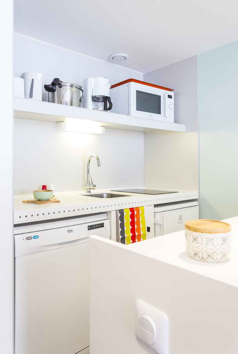 La cuisine ouverte est équipée de : combiné micro-ondes, lave-vaisselle, grille-pain, bouilloire et cafetière électrique.