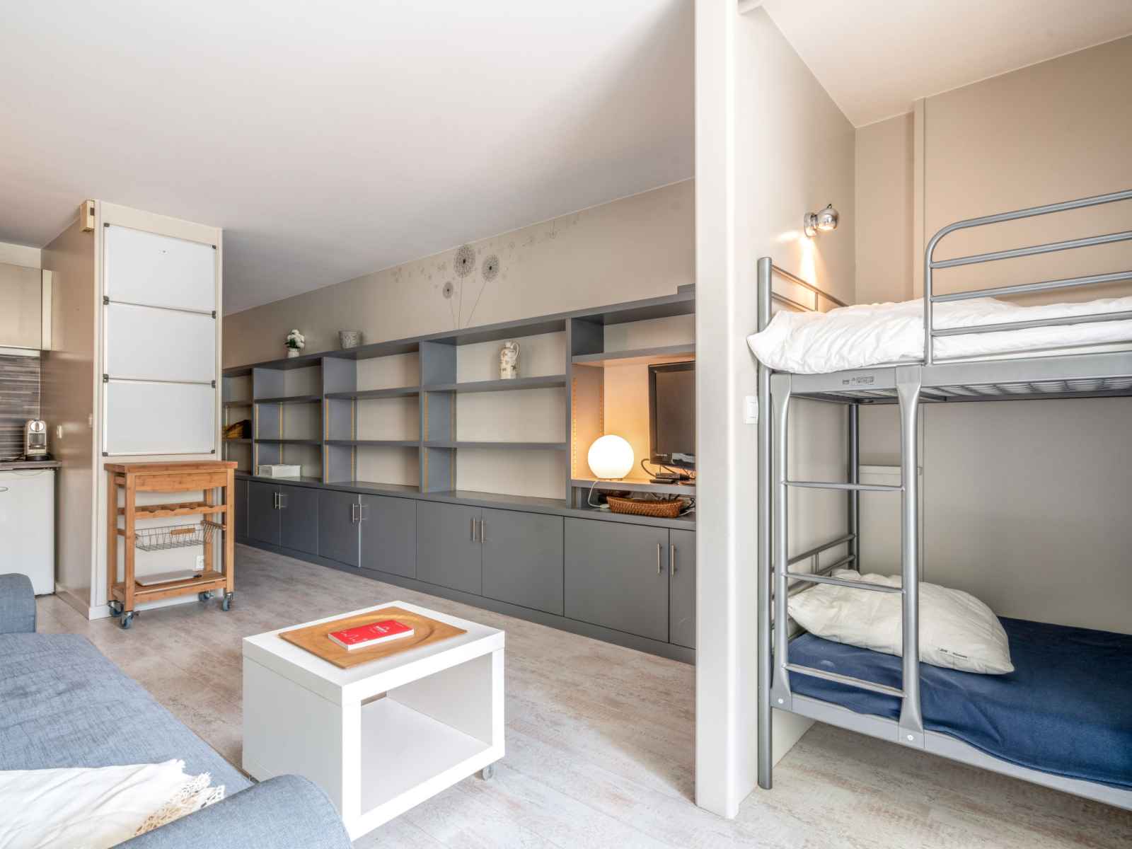 Studio 32 m2 au 4ème étage. logement idéal pour 2 adultes + 2 enfants. aménagement moderne: séjour/salle à manger avec 1 divan-lit double (140 cm, longueur 190 cm), tv (écran plat). sortie sur la loggia. alcôve, 2 lits superposés (90 cm, longueur 190 cm). cuisine ouverte (2 plaques vitrocéramiques, micro-ondes, cafetière électrique,