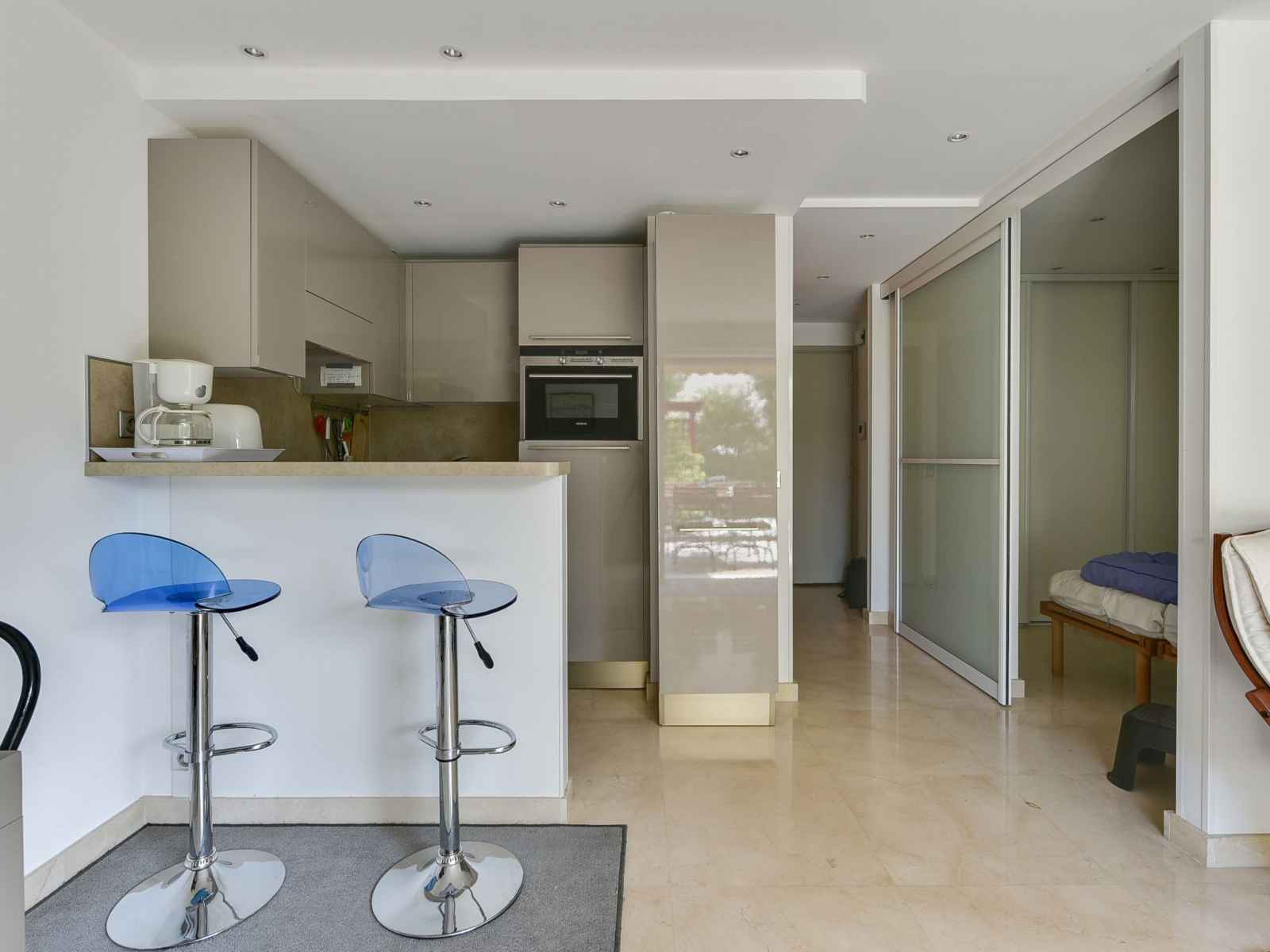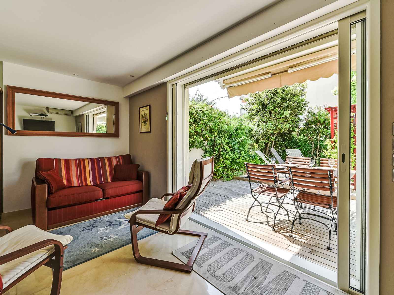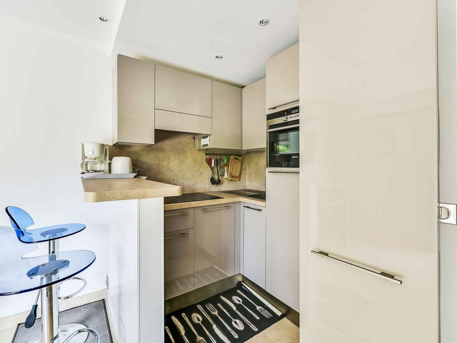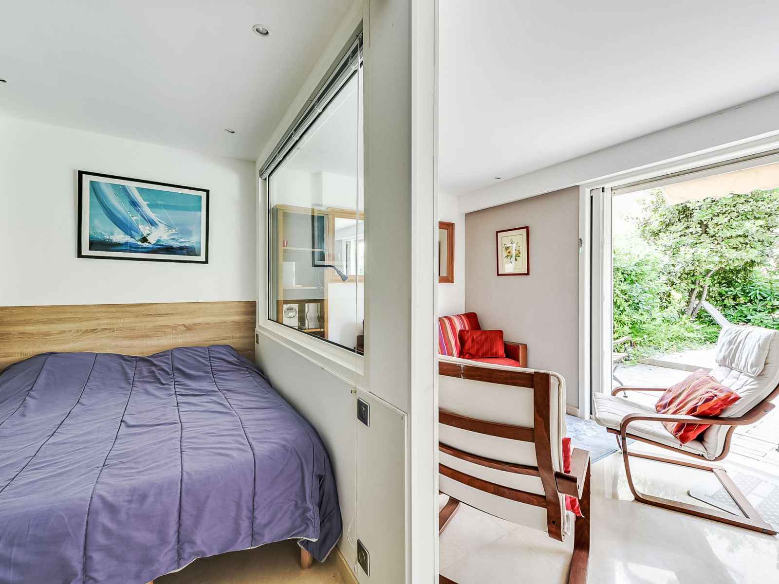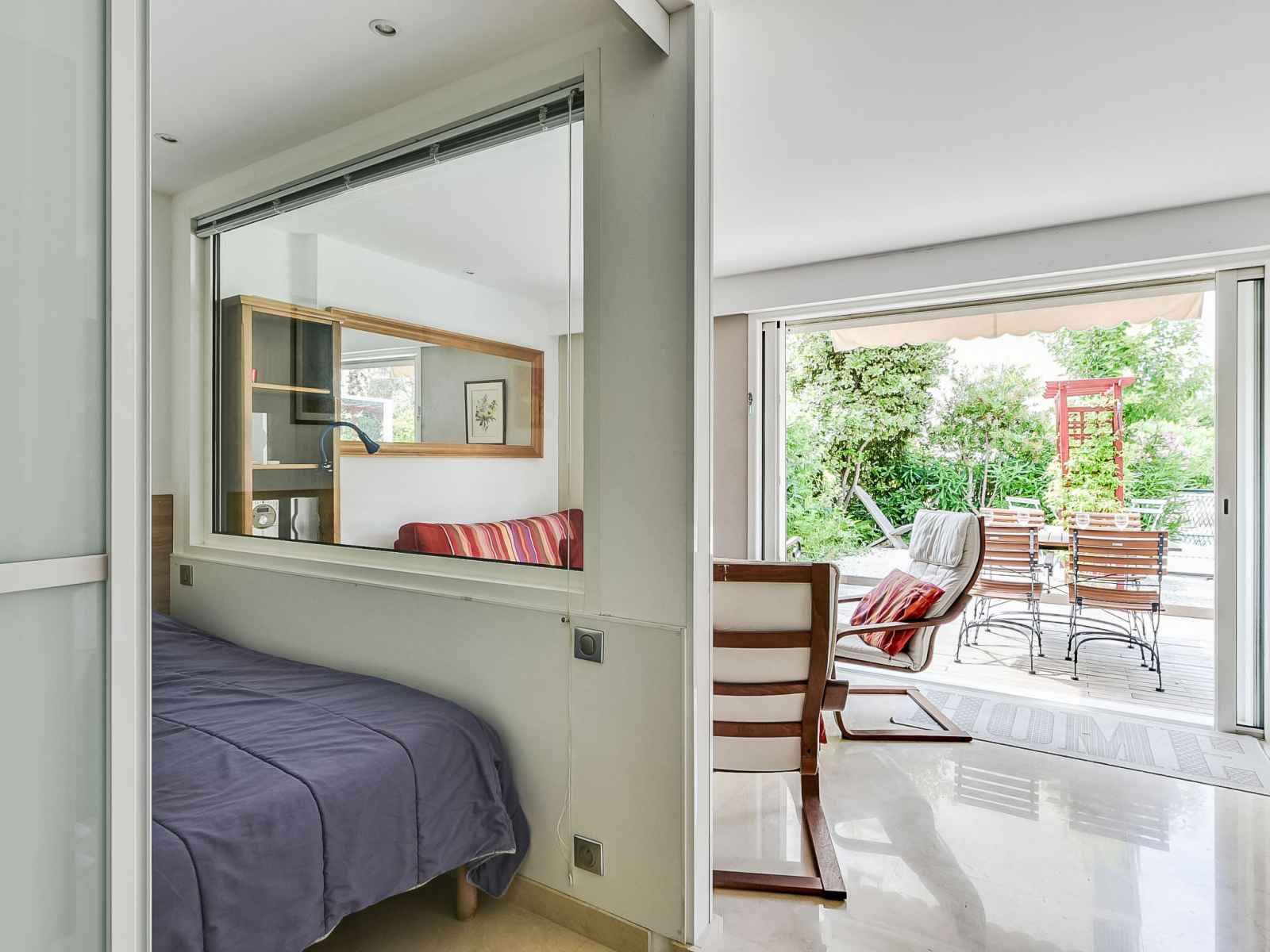 Studio 40 m2, au rez-de-chaussée. spacieux, complètement rénové, aménagement confortable et agréable: séjour/salle à manger avec tv et air-conditionné. sortie sur la terrasse. alcôve avec 1 grand-lit (140 cm, longueur 190 cm). cuisine ouverte (lave-vaisselle, 3 plaques à induction, combiné micro-ondes). douche, wc séparé. chauffage