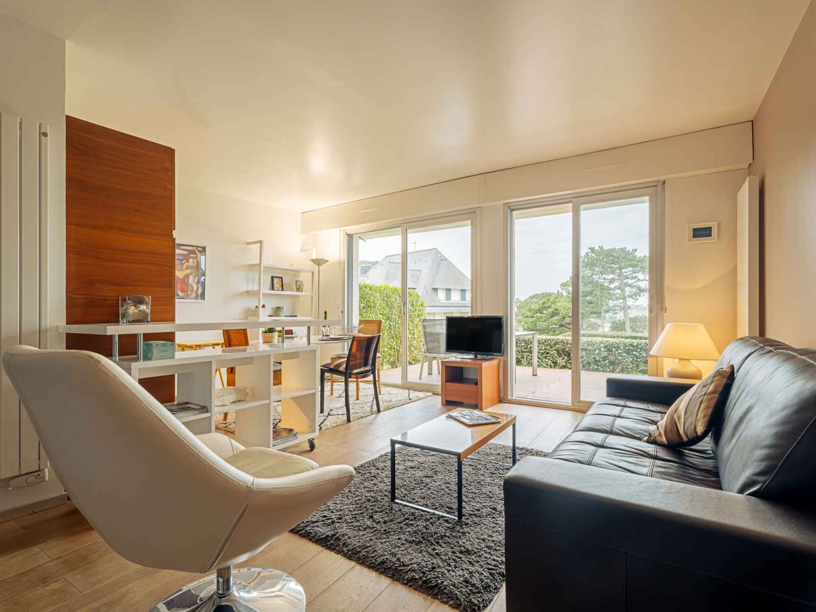 "le parc de la ronceray 6", apt 2 pièces 40 m2, au rez-de-chaussée, situation sud-ouest. partiellement rénové en 2026, aménagement confortable et de bon goût: salle à manger avec baie vitrée avec coin-cuisine et tv (écran plat). sortie sur la terrasse. 1 petite chambre avec 1 grand-lit (1 x 160 cm, longueur 190 cm). sortie sur la