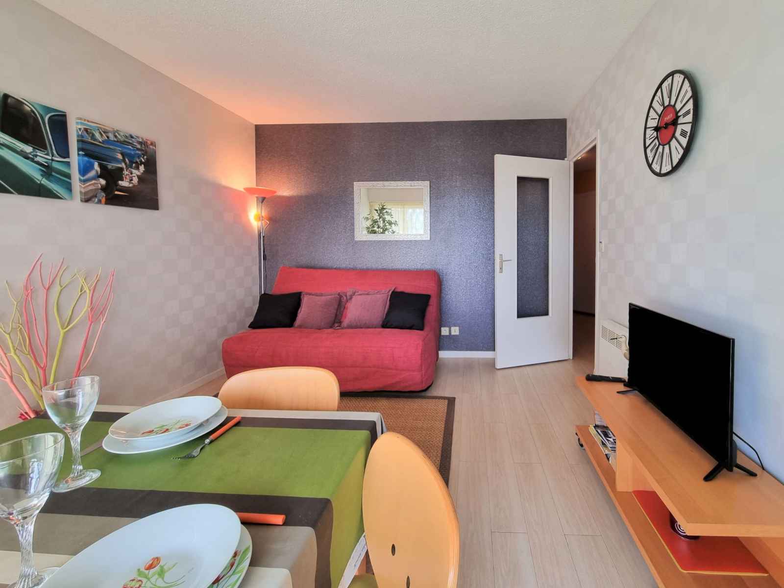 Studio 27 m2 au 3ème étage, situation sud. clair, aménagement fonctionnel et agréable: salon avec 1 divan-lit double (1 x 140 cm, longueur 190 cm), table pour les repas et tv (écran plat). sortie sur le balcon. coin cuisine (2 plaques vitrocéramiques, grille-pain, bouilloire électrique, micro-ondes, cafetière électrique). bain/wc.