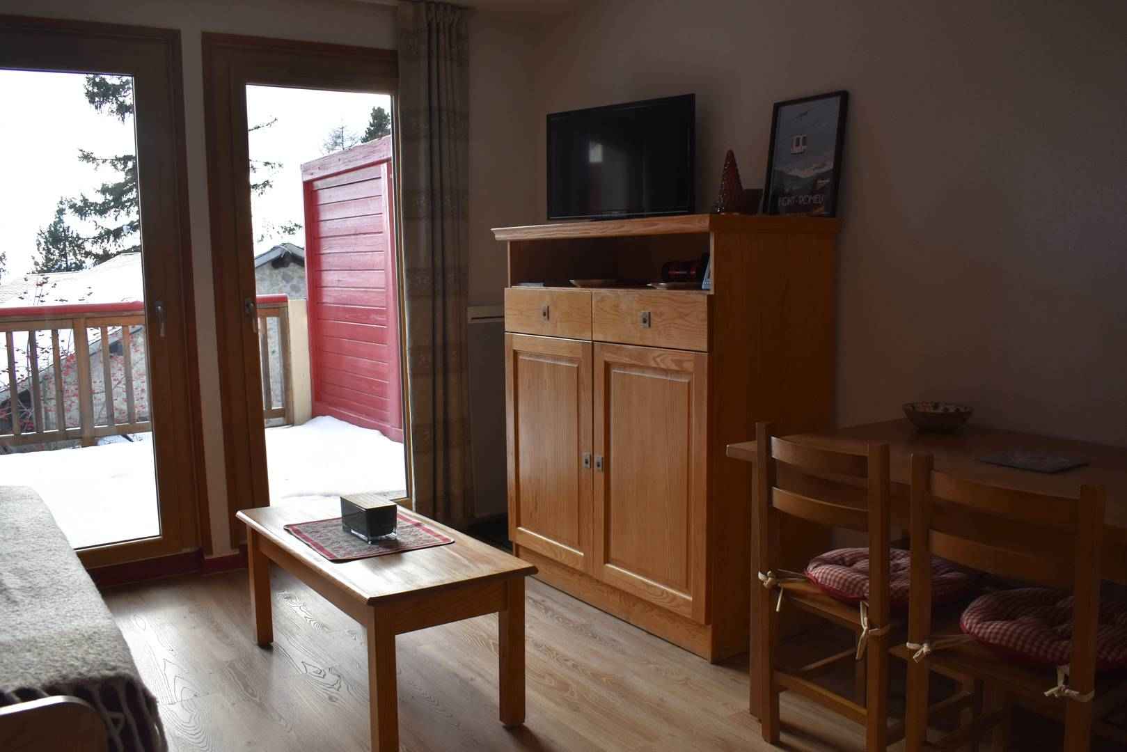 le séjour s’ouvre sur un balcon plein sud offrant une vue dégagée.