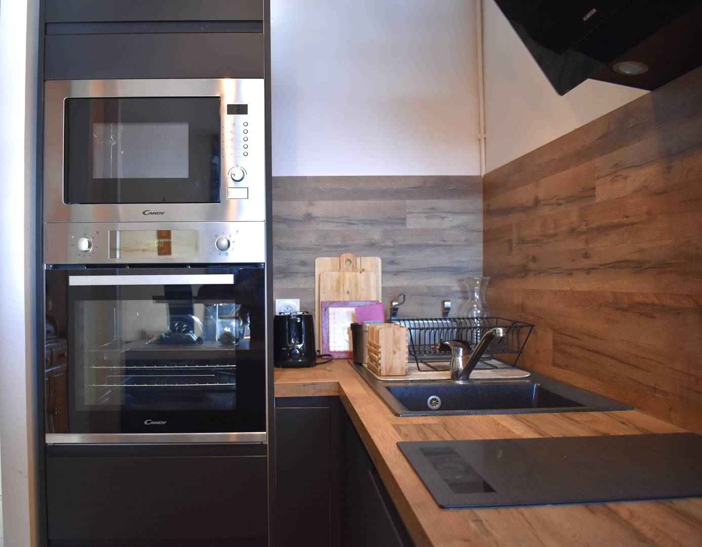 Cuisine équipée avec four, four/micro-ondes, frigo top, plaque vitrocéramiques, cafetière SENSEO et hotte aspirante.