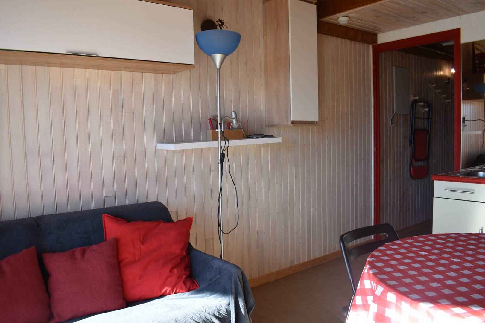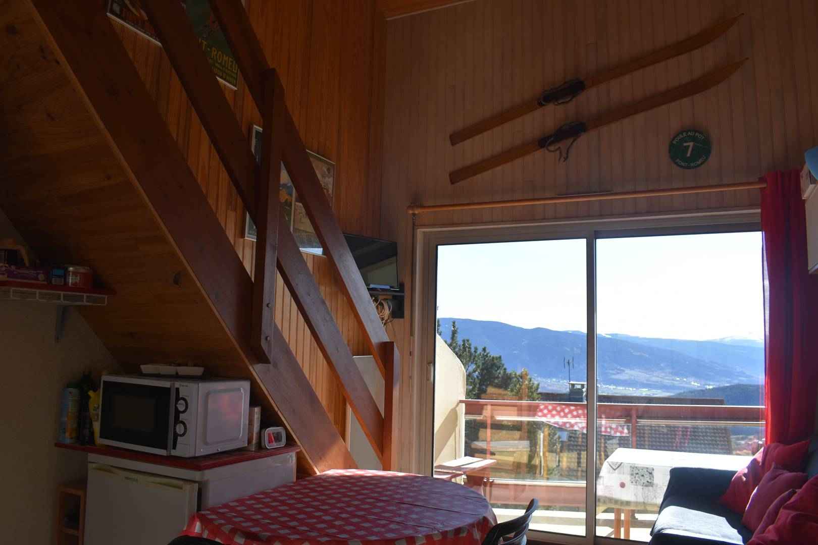 -Le séjour exposé plein sud disposes d'une table à manger et d'assises pour 4 personnes.