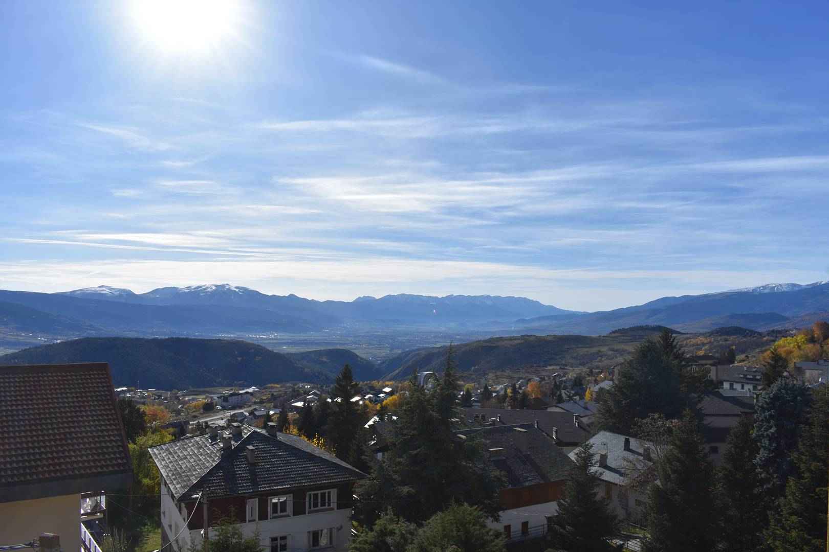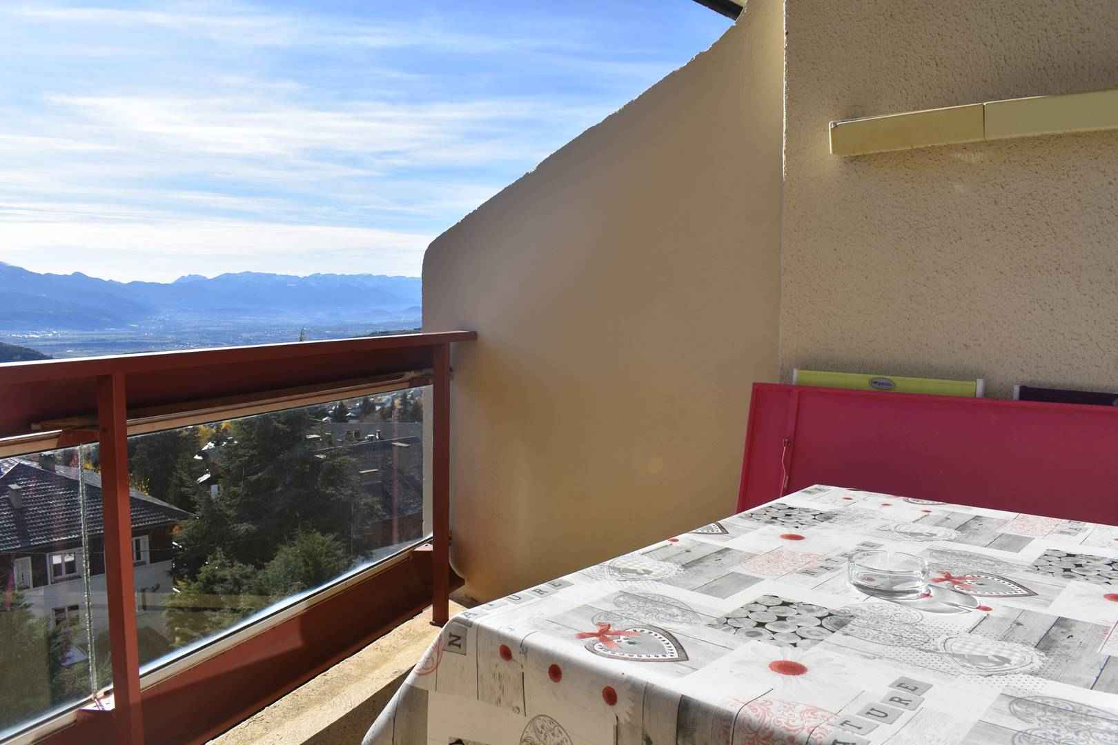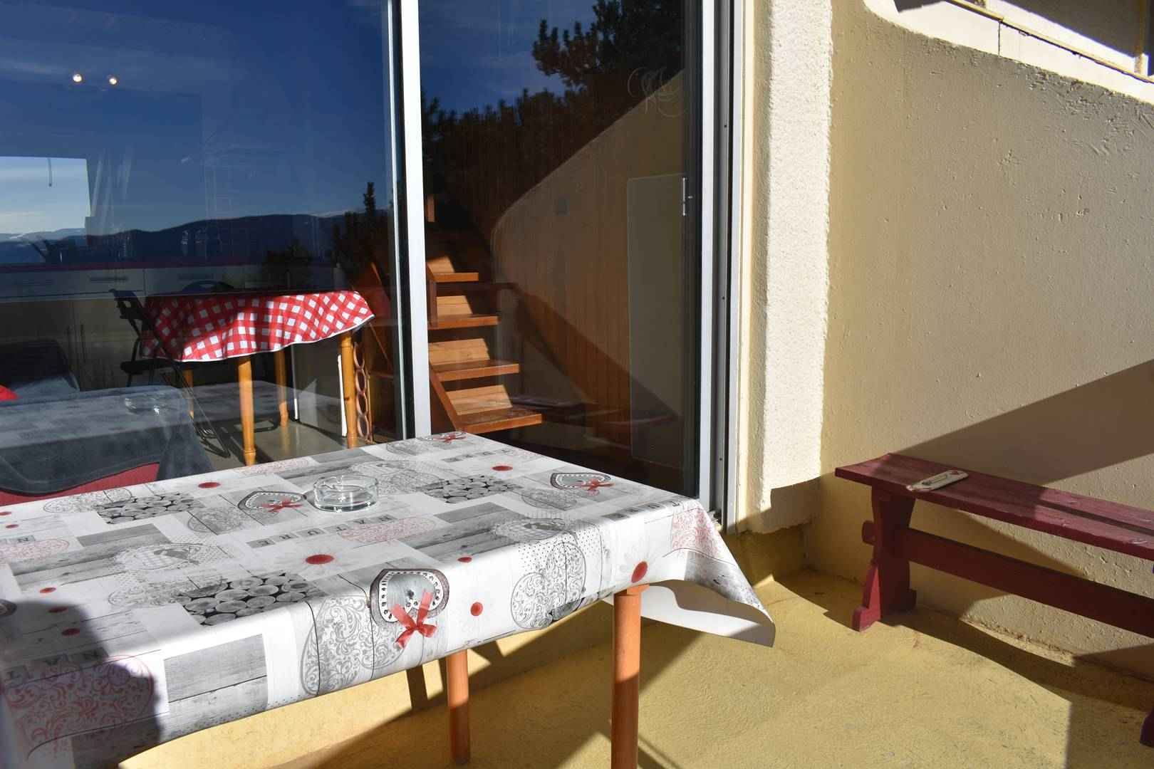 -Balcon plein sud avec une table et chaises pour pouvoir profiter de la vue et de la tranquillité.