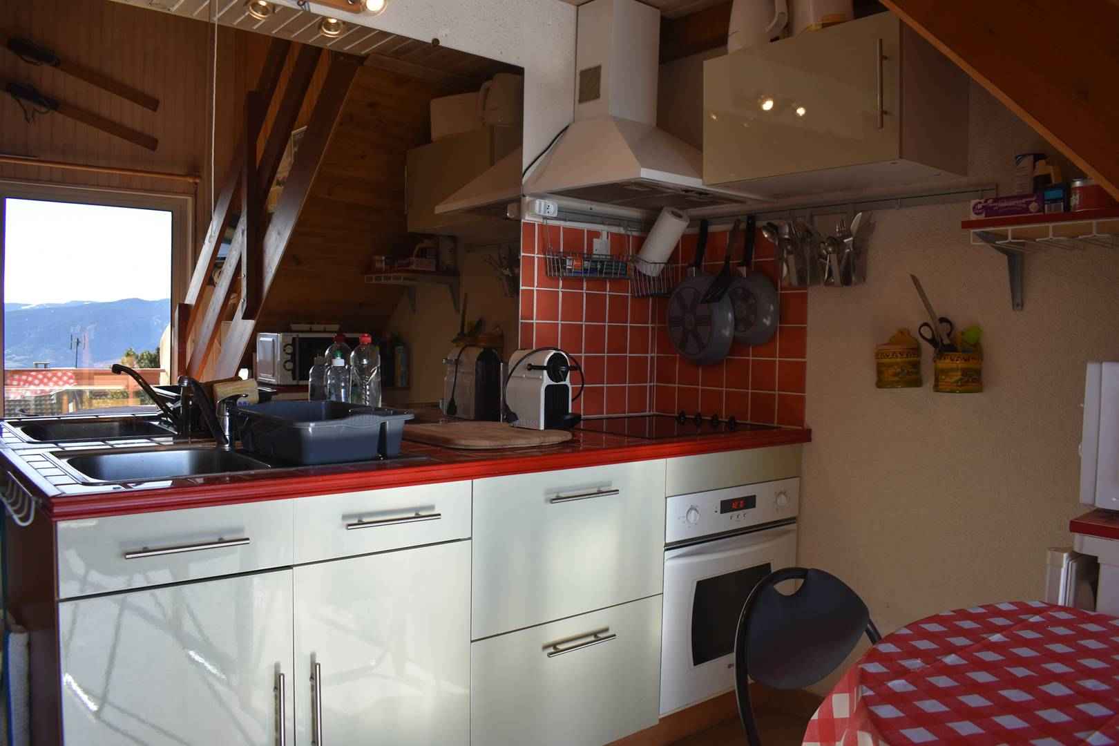 -Séjour avec coin cuisine équipée. La cuisine est donc équipée d 'un frigo TOP, plaque de cuisson électrique 2 feux, un mini four, un micro-ondes et une cafetière à capsules KRUPS.
