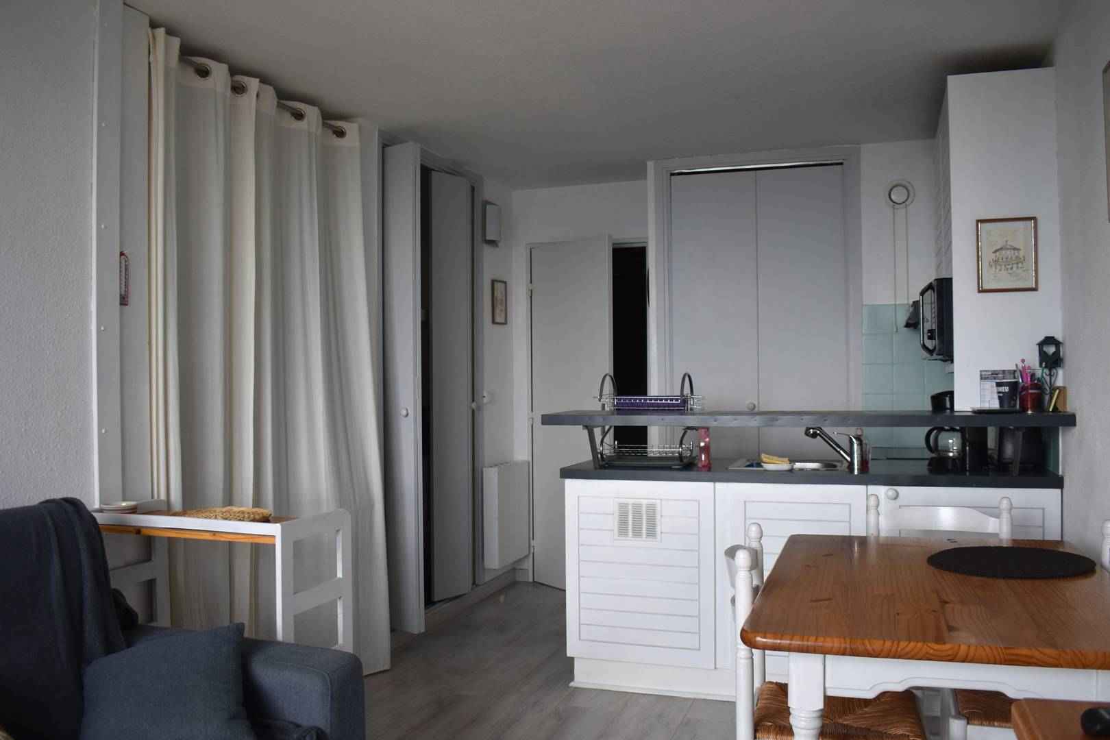 Salon/Séjour : Espace convivial avec un coin cuisine équipé, meuble bar et rangements.