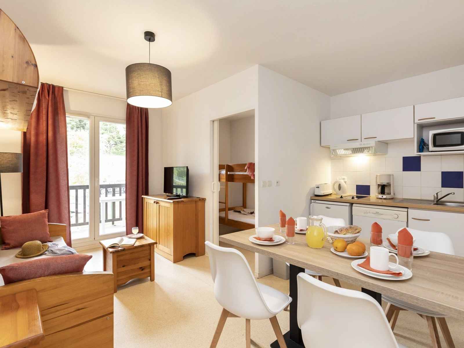 kitchenette équipée (réfrigérateur, plaque vitrocéramique, combiné gril/micro-ondes, lave-vaisselle, hotte aspirante, cafetière électrique, bouilloire électrique, grille-pain)