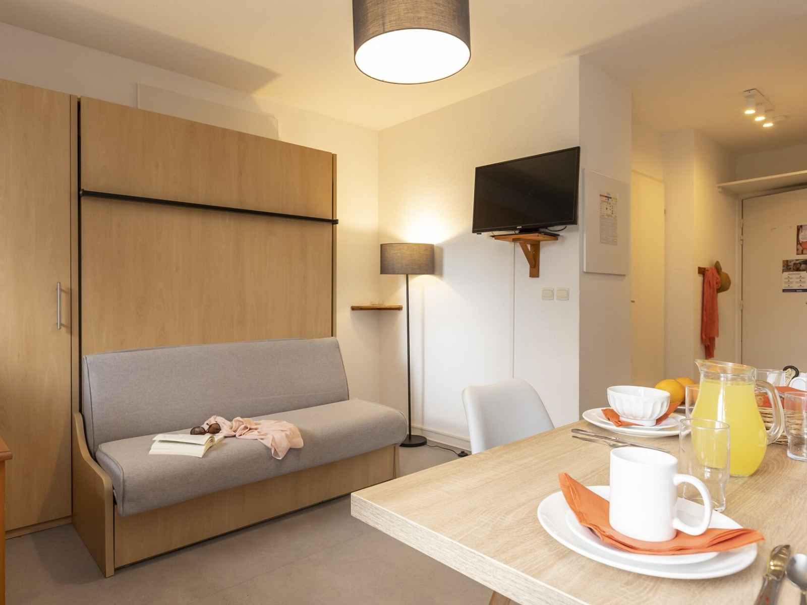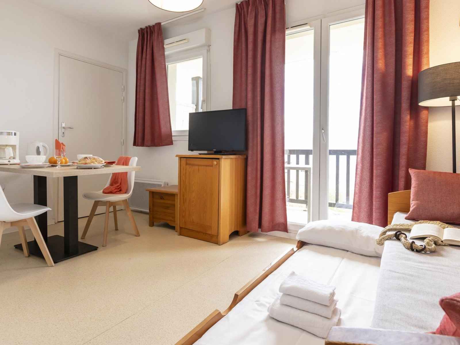 tête dans la piscine partiellement couverte chauffée pour vous détendre ! puis rejoignez votre appartement tout équipé avec balcon ou terrasse ou profitez d’un des jeux de société proposé par la résidence.