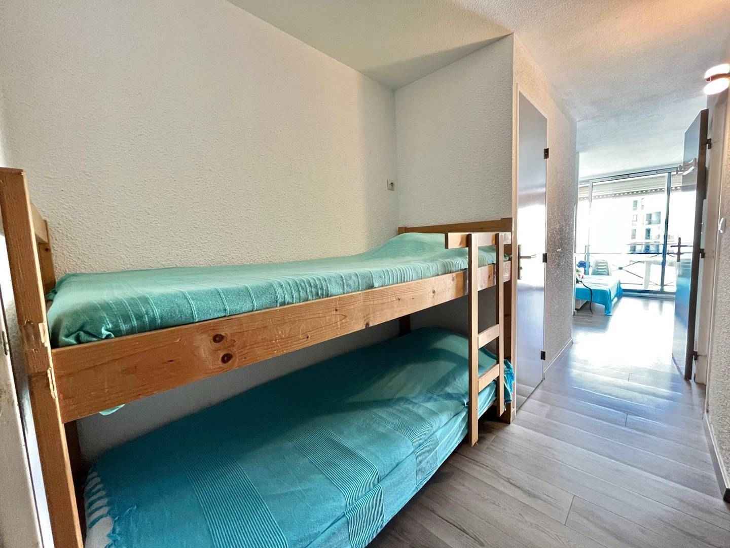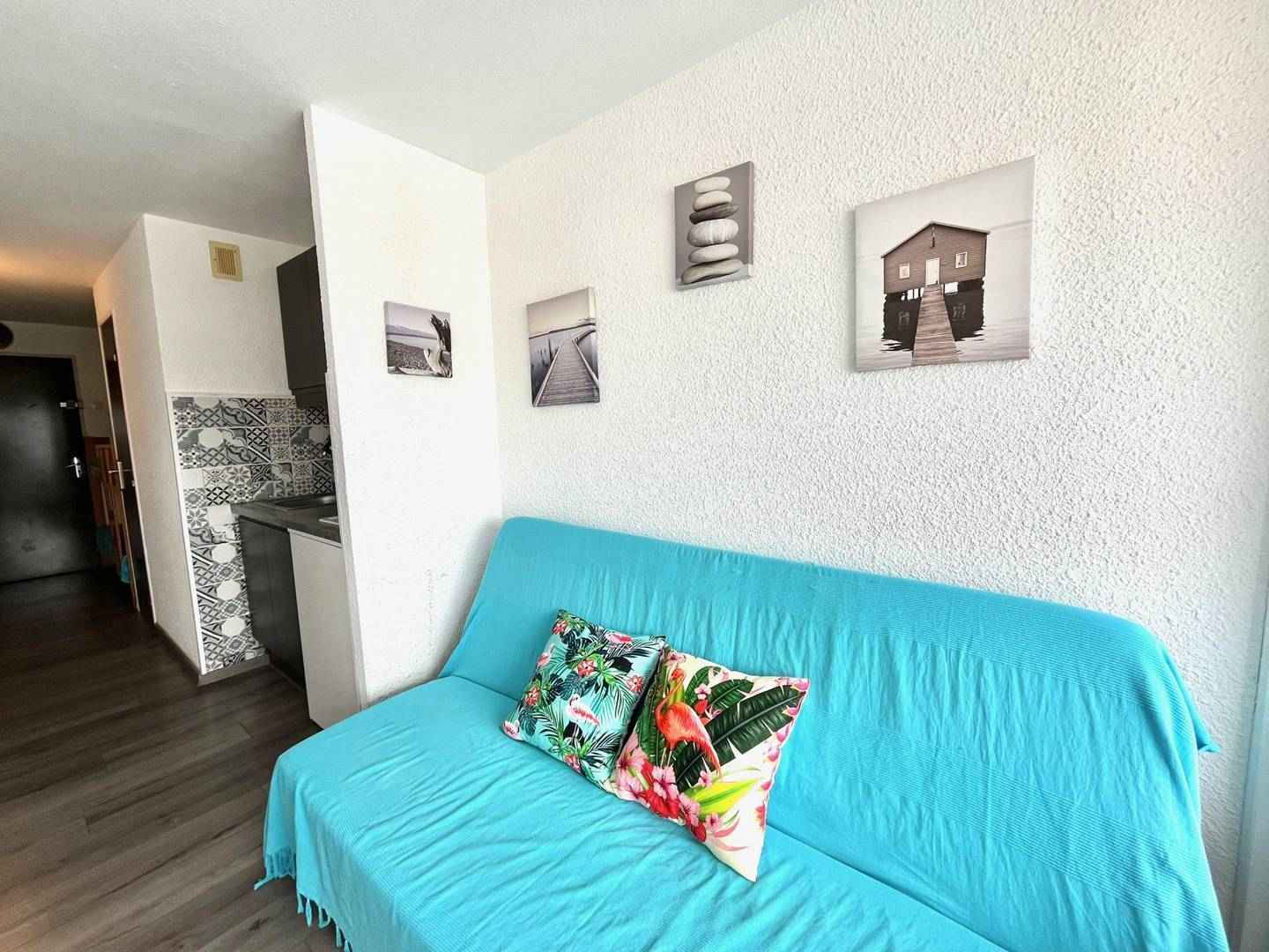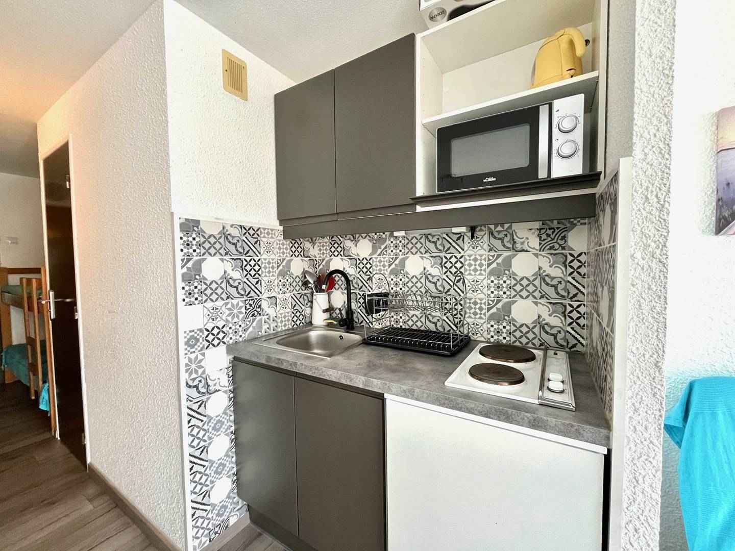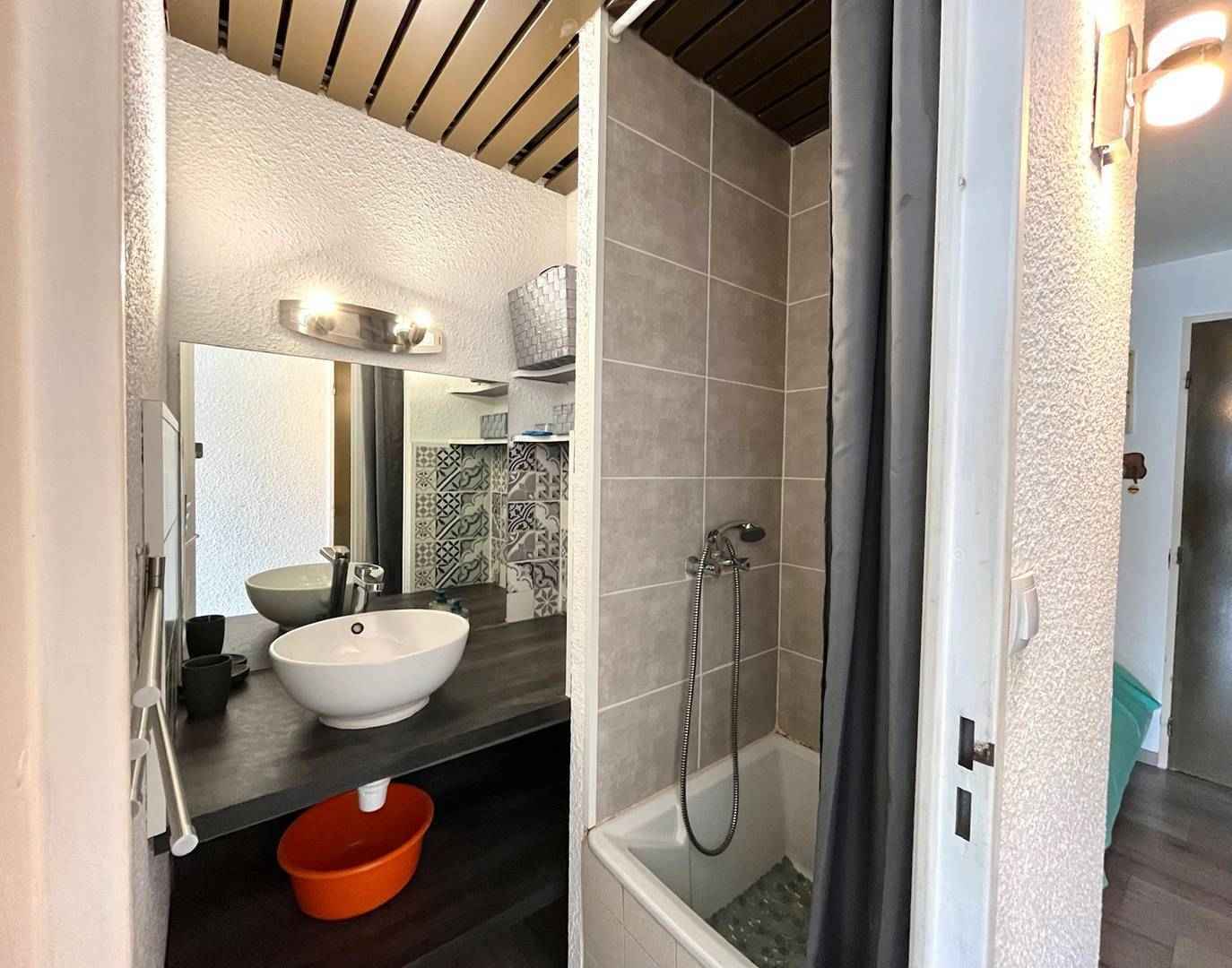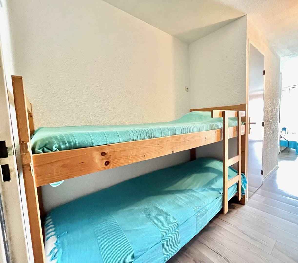 ce studio rénové avec goût possède un coin cuisine donnant sur la pièce à vivre. malgré ses 20m², il peut accueillir 6 couchages grace à son lit double, ses lits superposés et sa banquette convertible. il possède une salle de bains et une