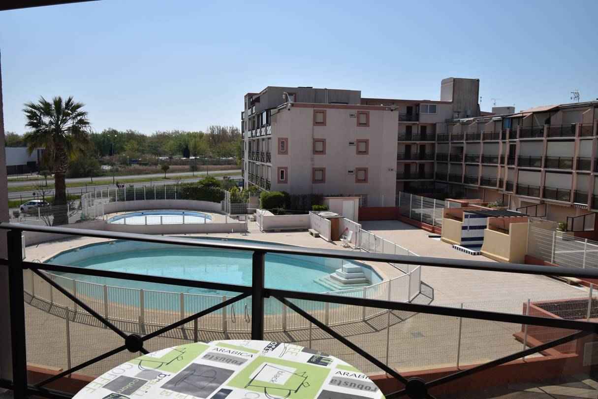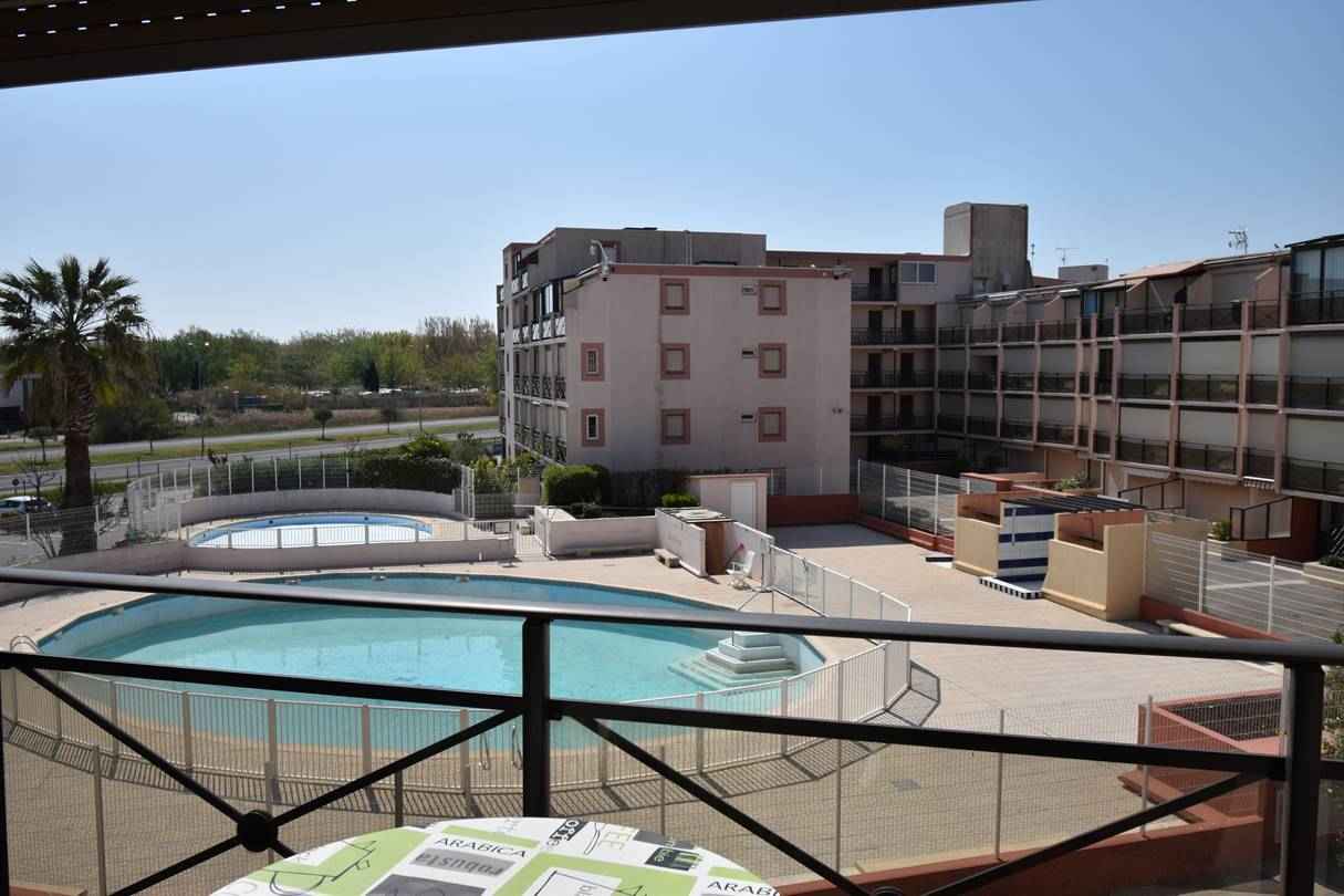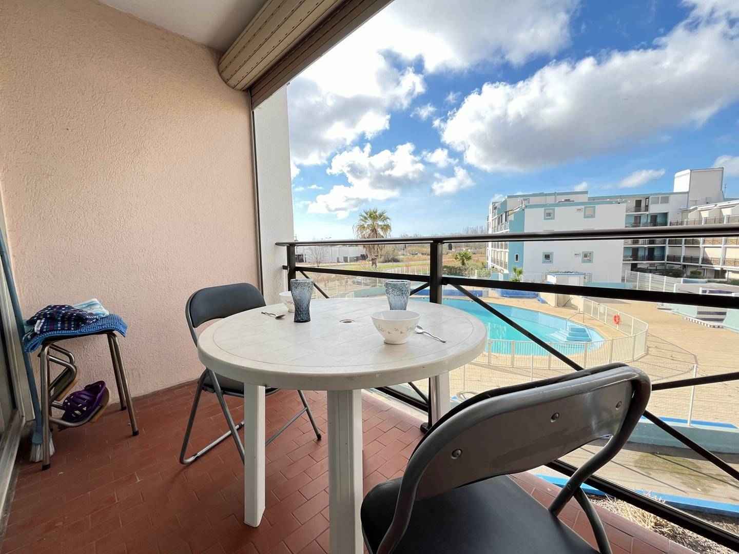 - Balcon (Il est aménagé par une table et des chaises. la vue donne sur la piscine de la résidence.)